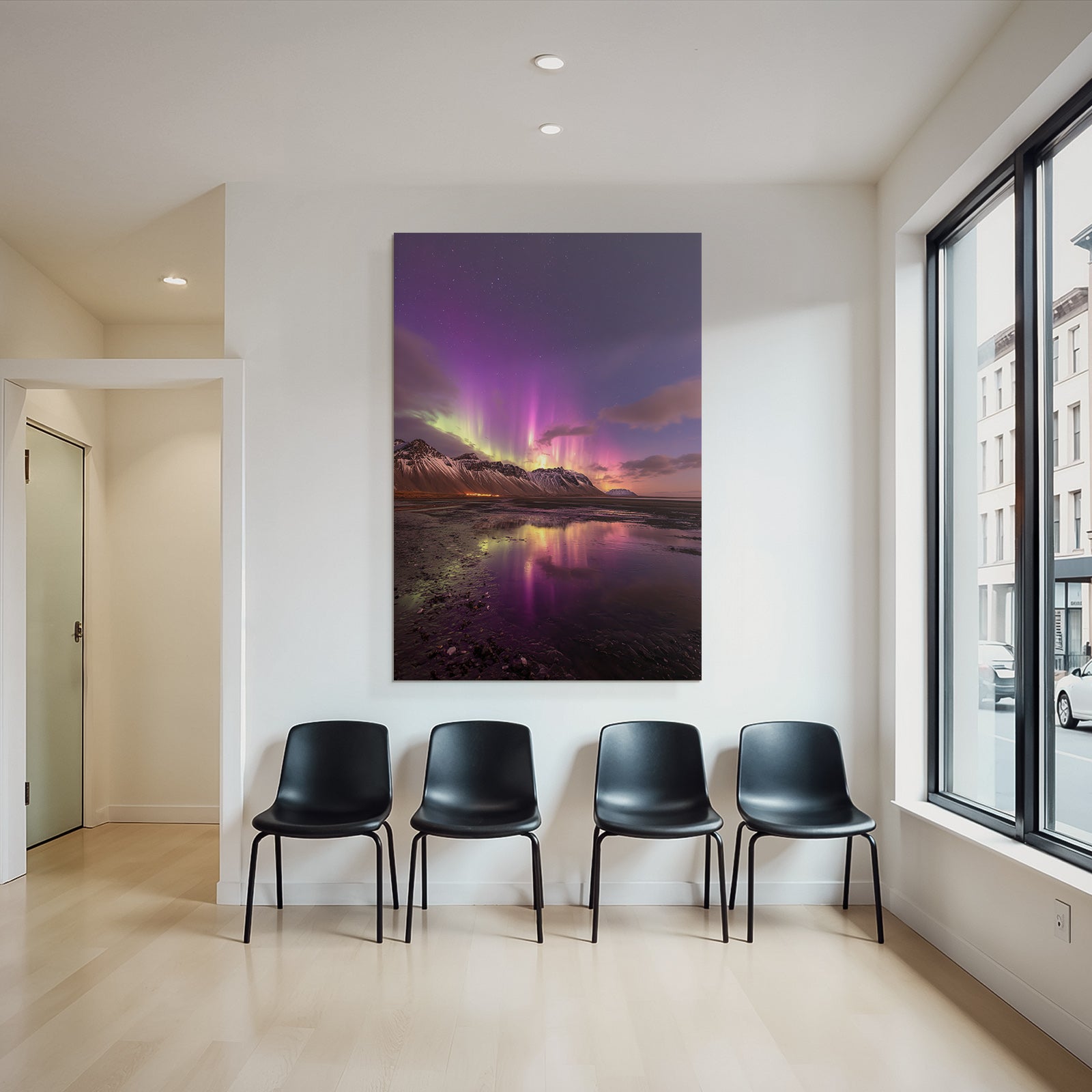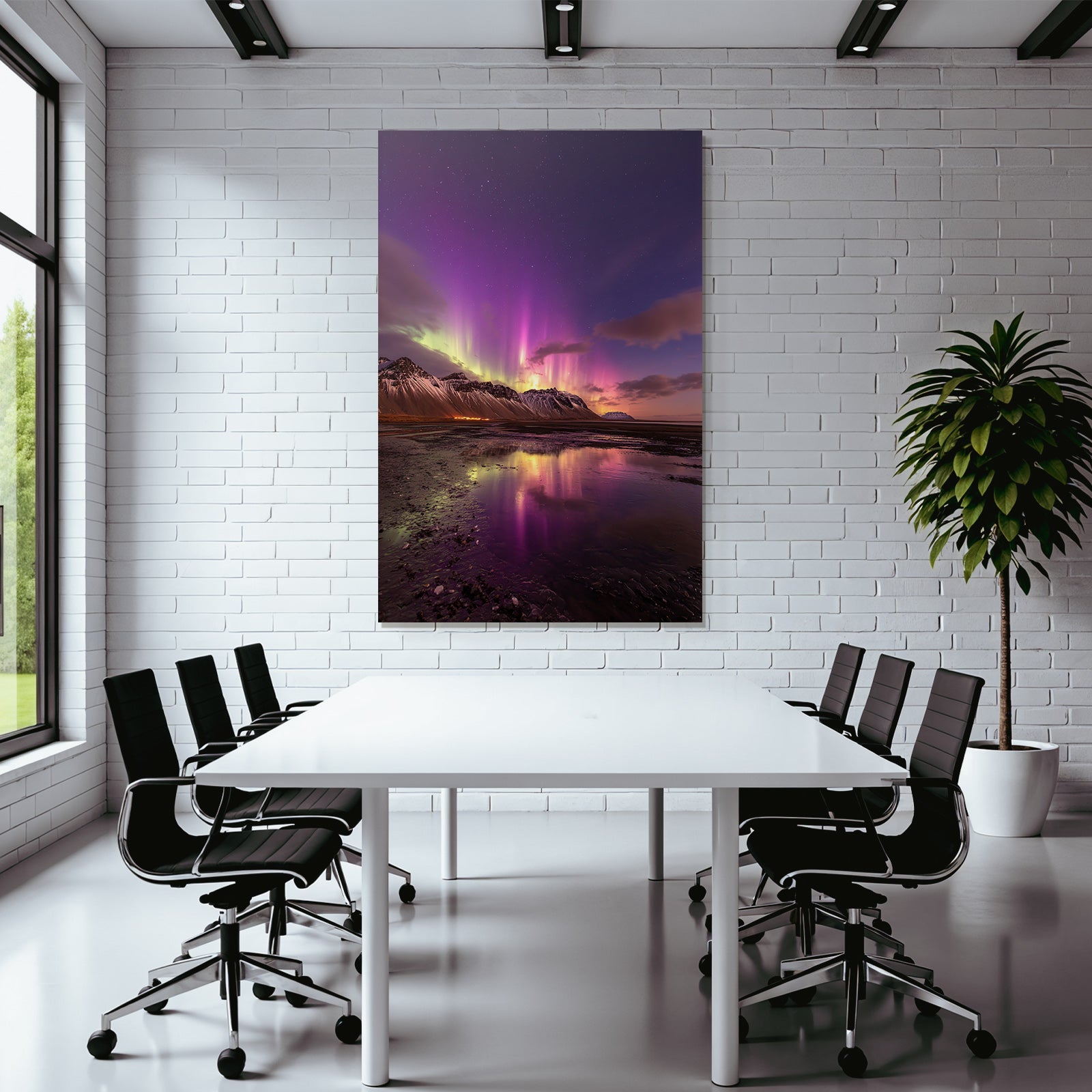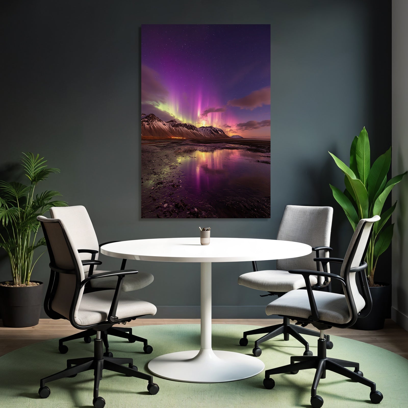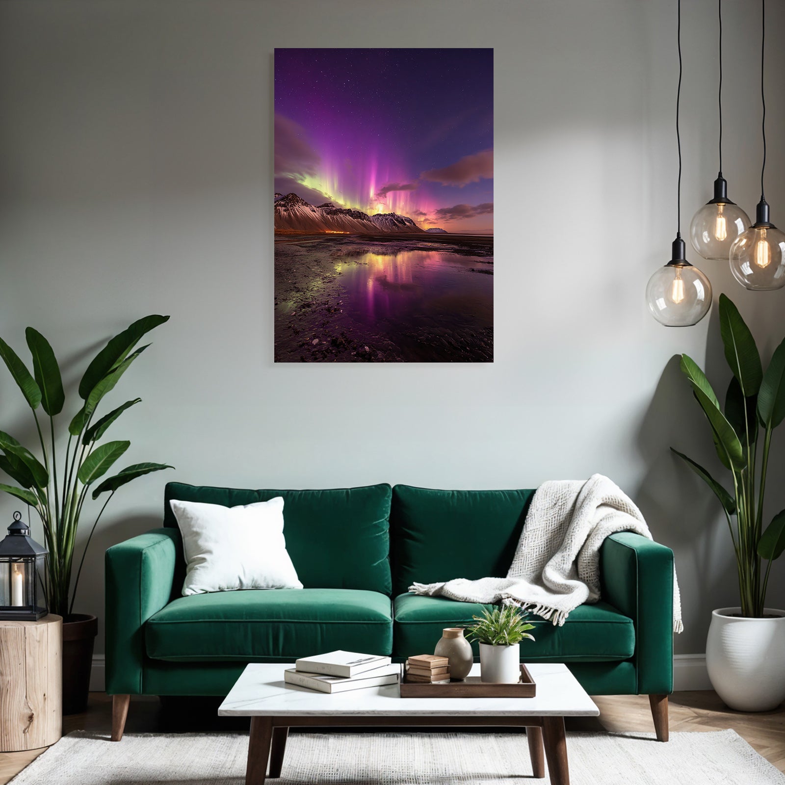 „Polarlicht Aurora Erscheinung Über Schneebedeckten Bergen Und Reflektierendem Wasser“ bringt den Stil Fjorde und Gletscher an Deine Wand – perfekt für Schlafzimmer, Homeoffice oder Besprechungsräume, edel gerahmt im FameFrame™.