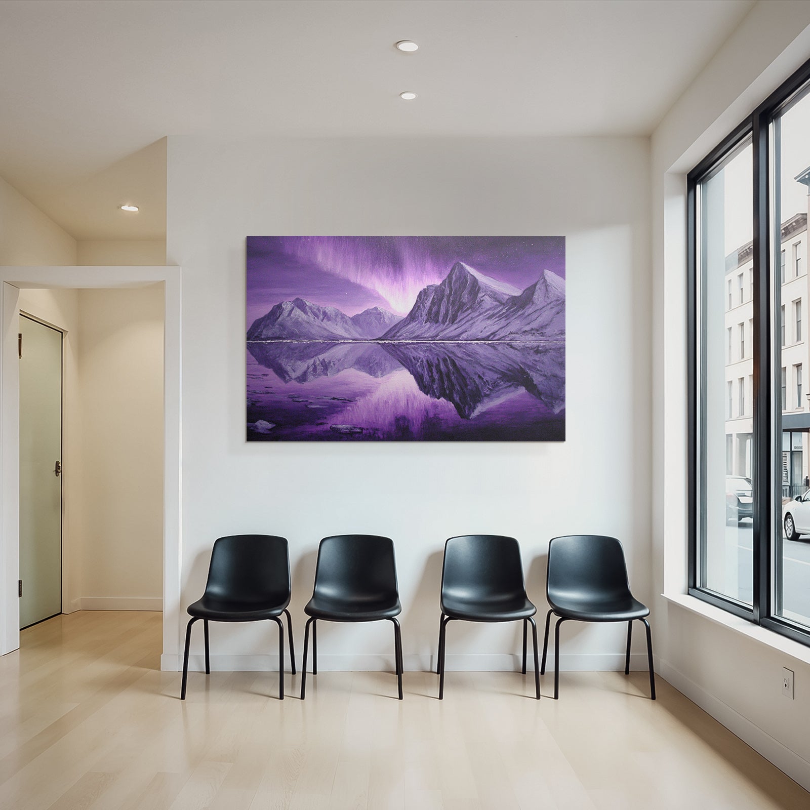 Tauchen Sie ein in die Welt von Fjorde und Gletscher. Das Motiv „Polarlicht Berglandschaft Mit Aurora Borealis Reflexionen“ ist ein herausragendes Beispiel dieses Stils, das im FameFrame™ eine besondere Tiefe erhält.
