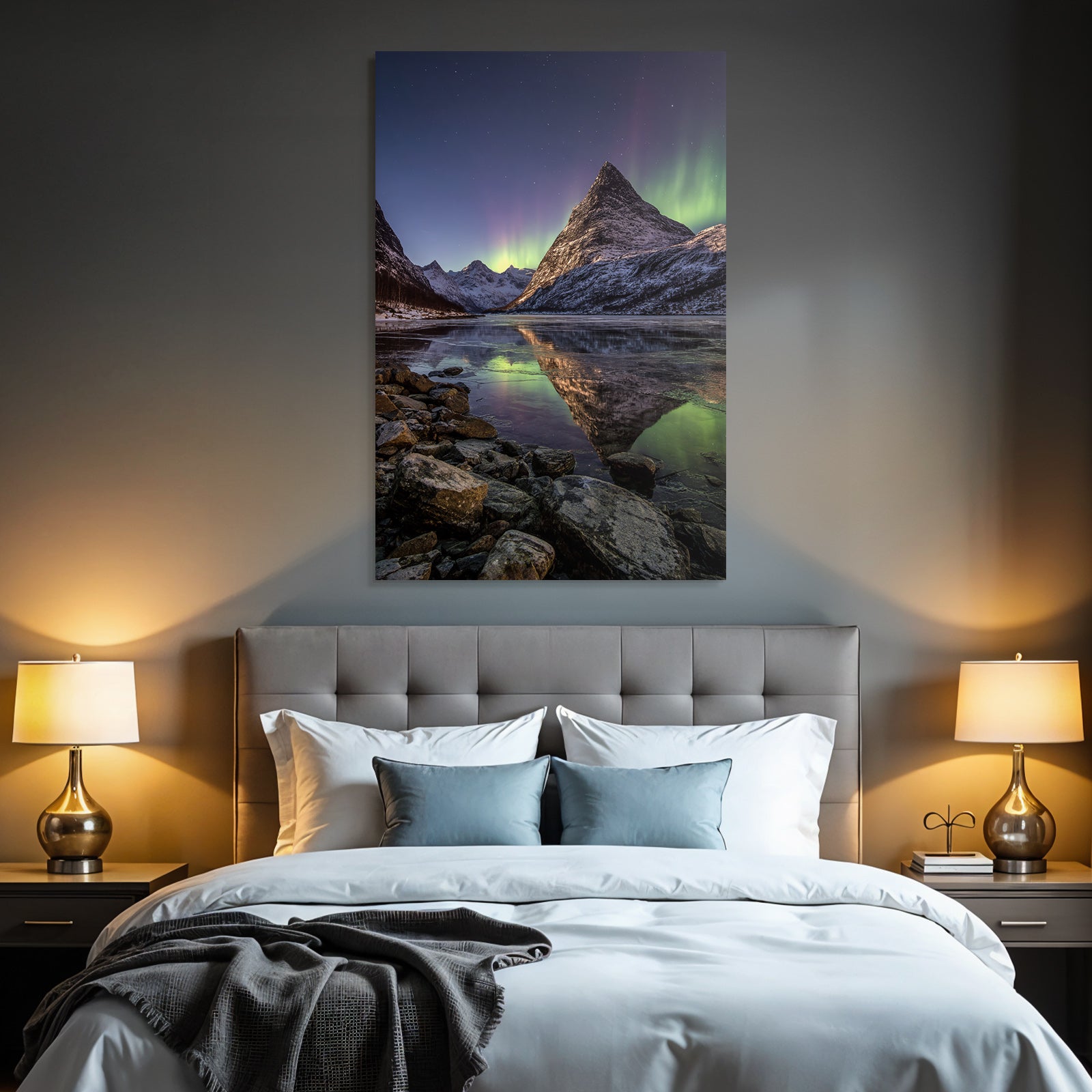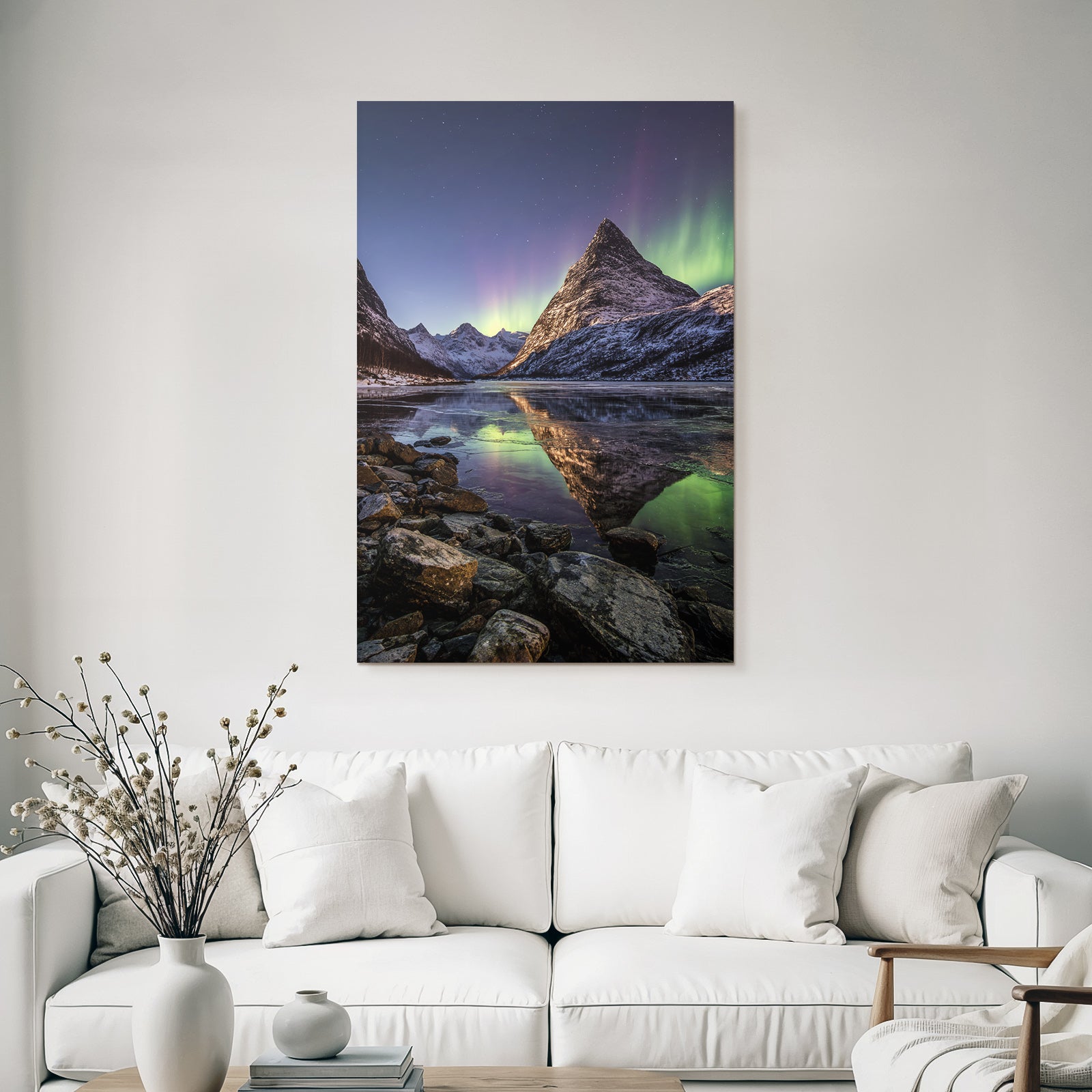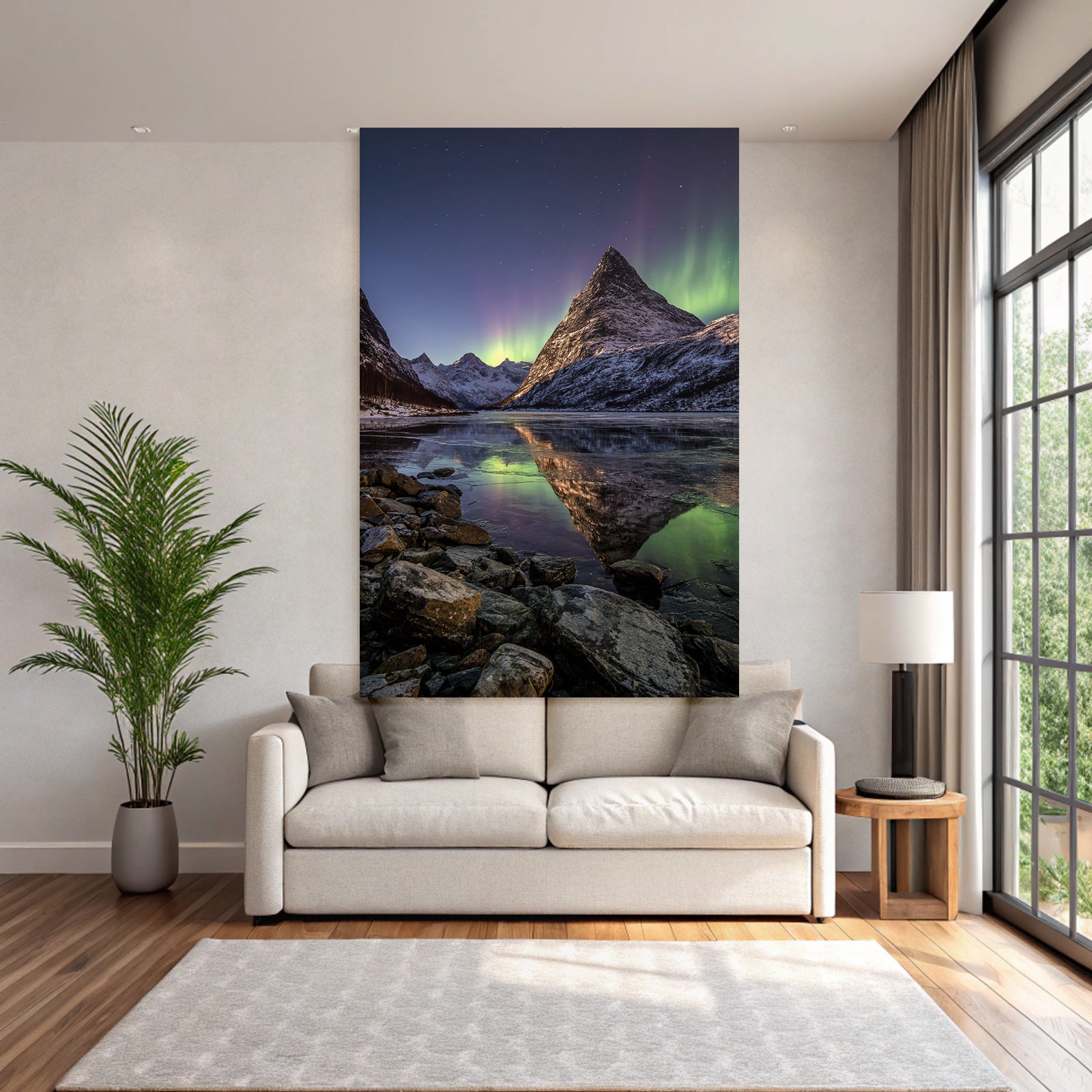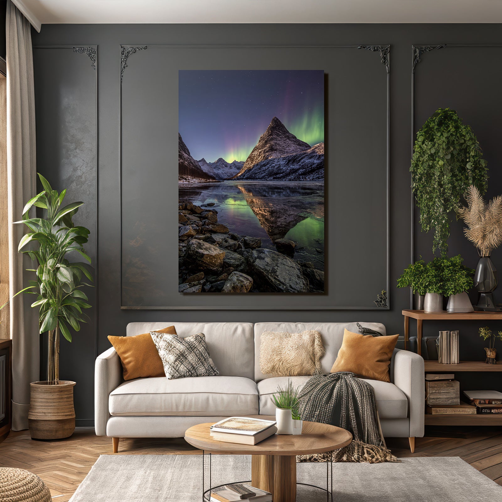 Für Liebhaber des Fjorde und Gletscher-Looks: Das Kunstwerk „Polarlicht Berglandschaft Nordlichter Reflection Im Winter“ bringt die charakteristischen Merkmale dieses Stils brillant auf Stoff – perfektioniert durch den FameFrame™.