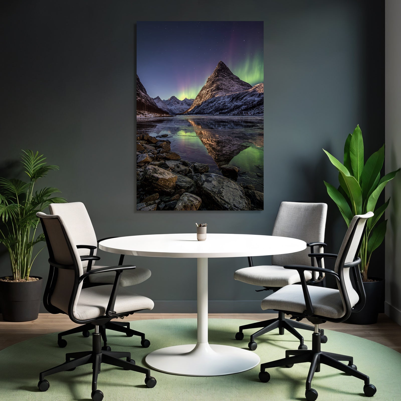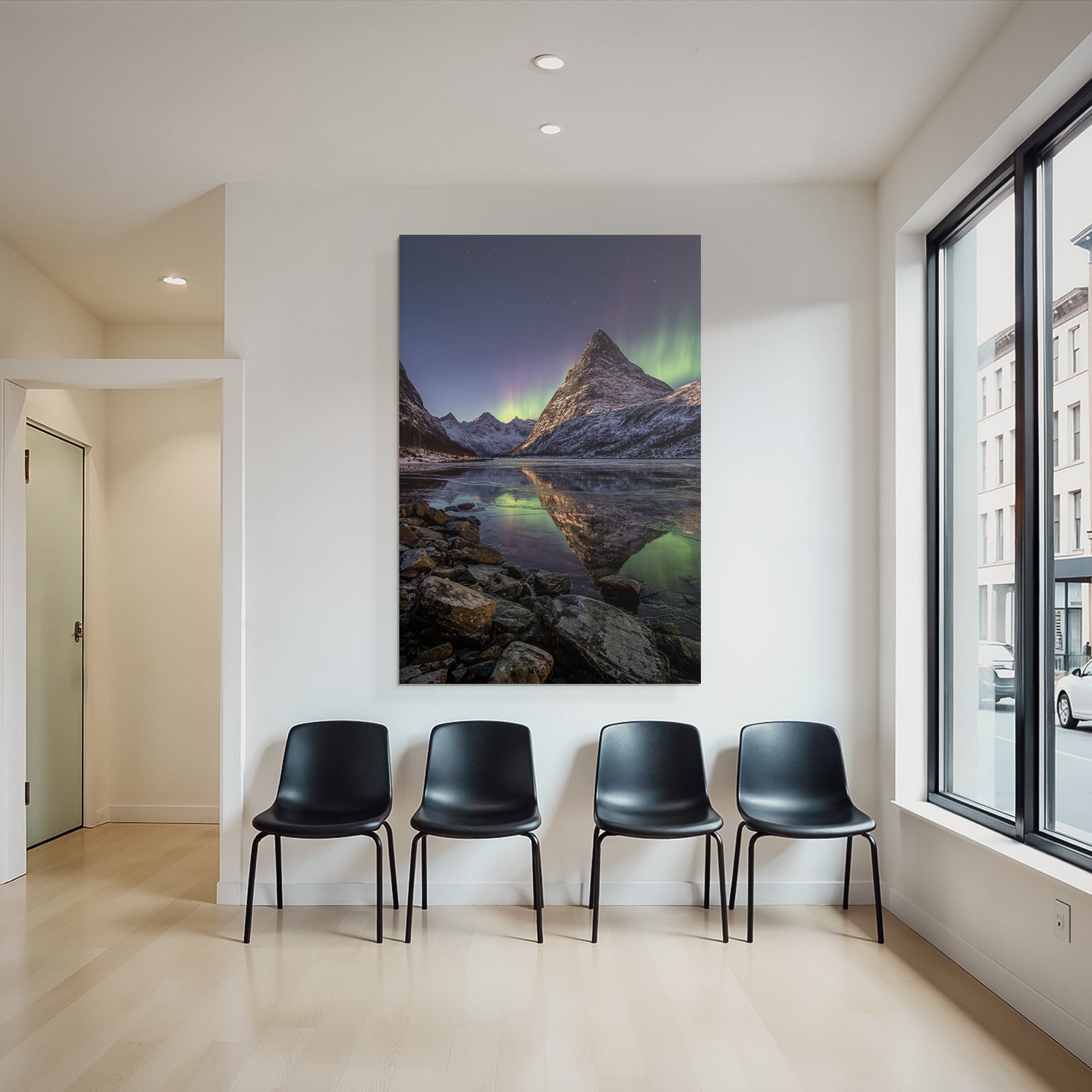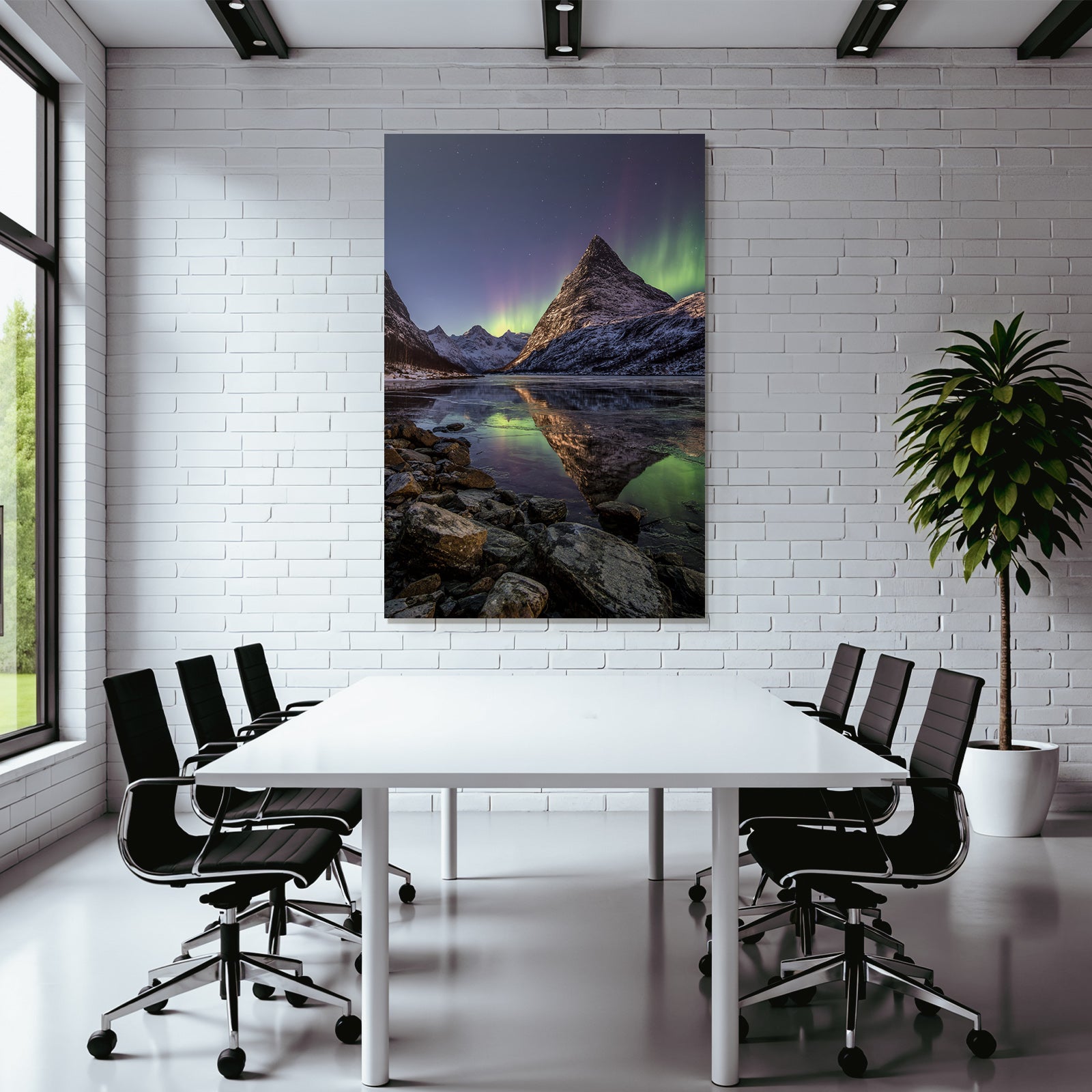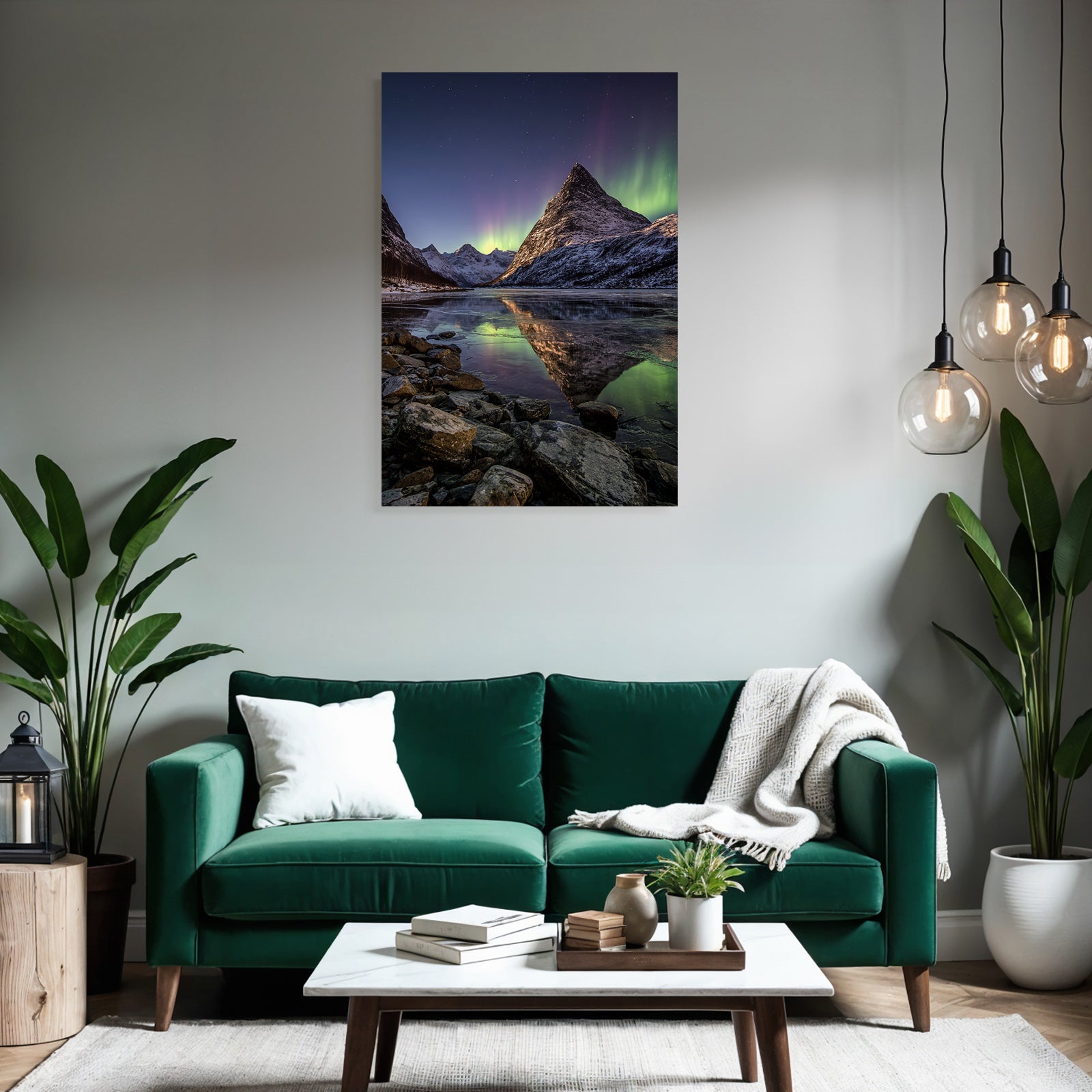 Für Liebhaber des Fjorde und Gletscher-Looks: Das Kunstwerk „Polarlicht Berglandschaft Nordlichter Reflection Im Winter“ bringt die charakteristischen Merkmale dieses Stils brillant auf Stoff – perfektioniert durch den FameFrame™.