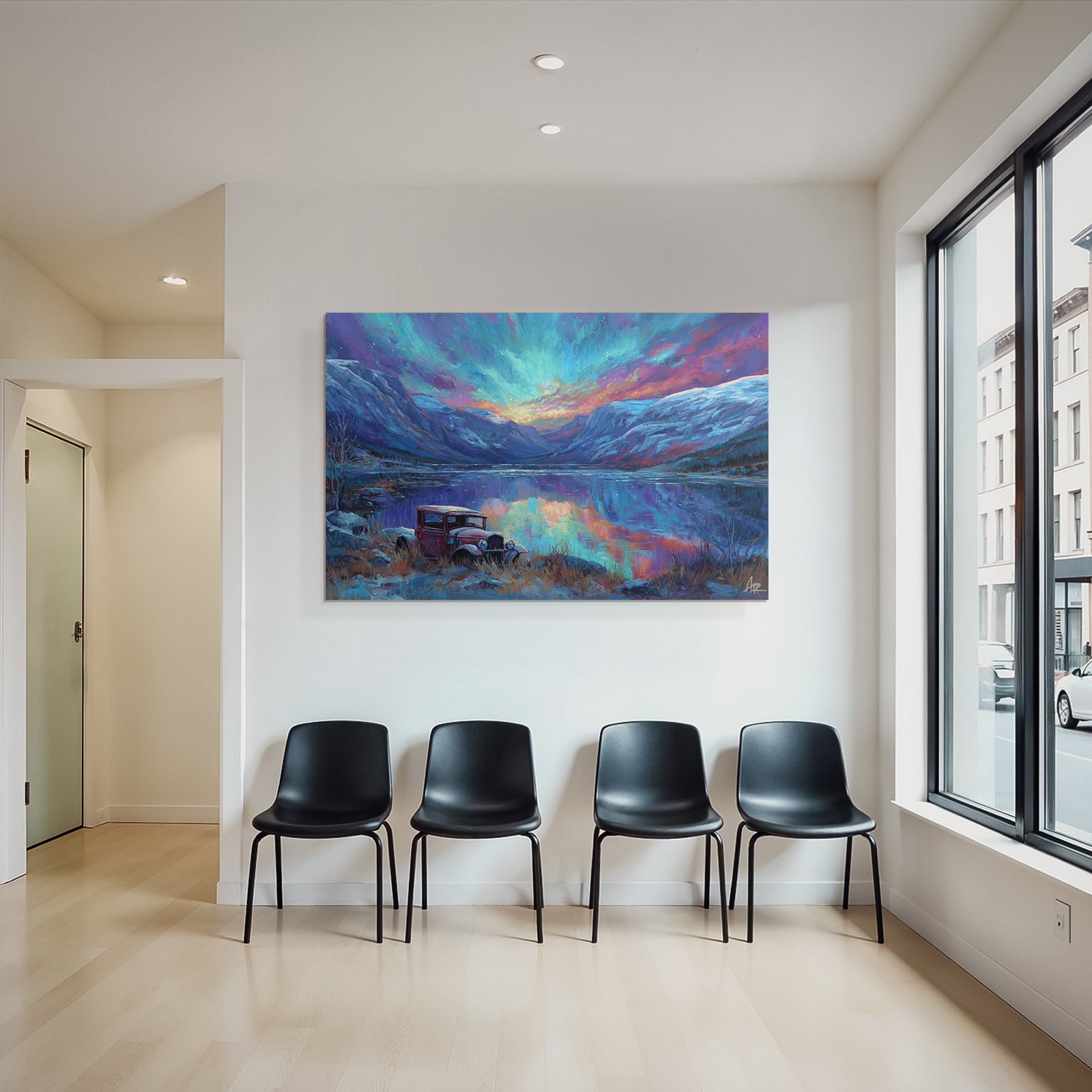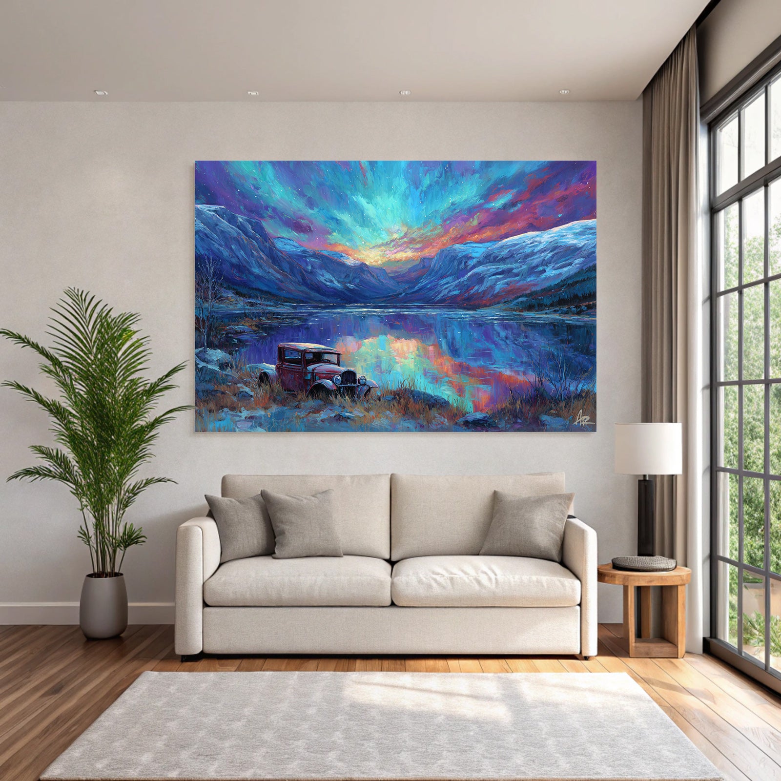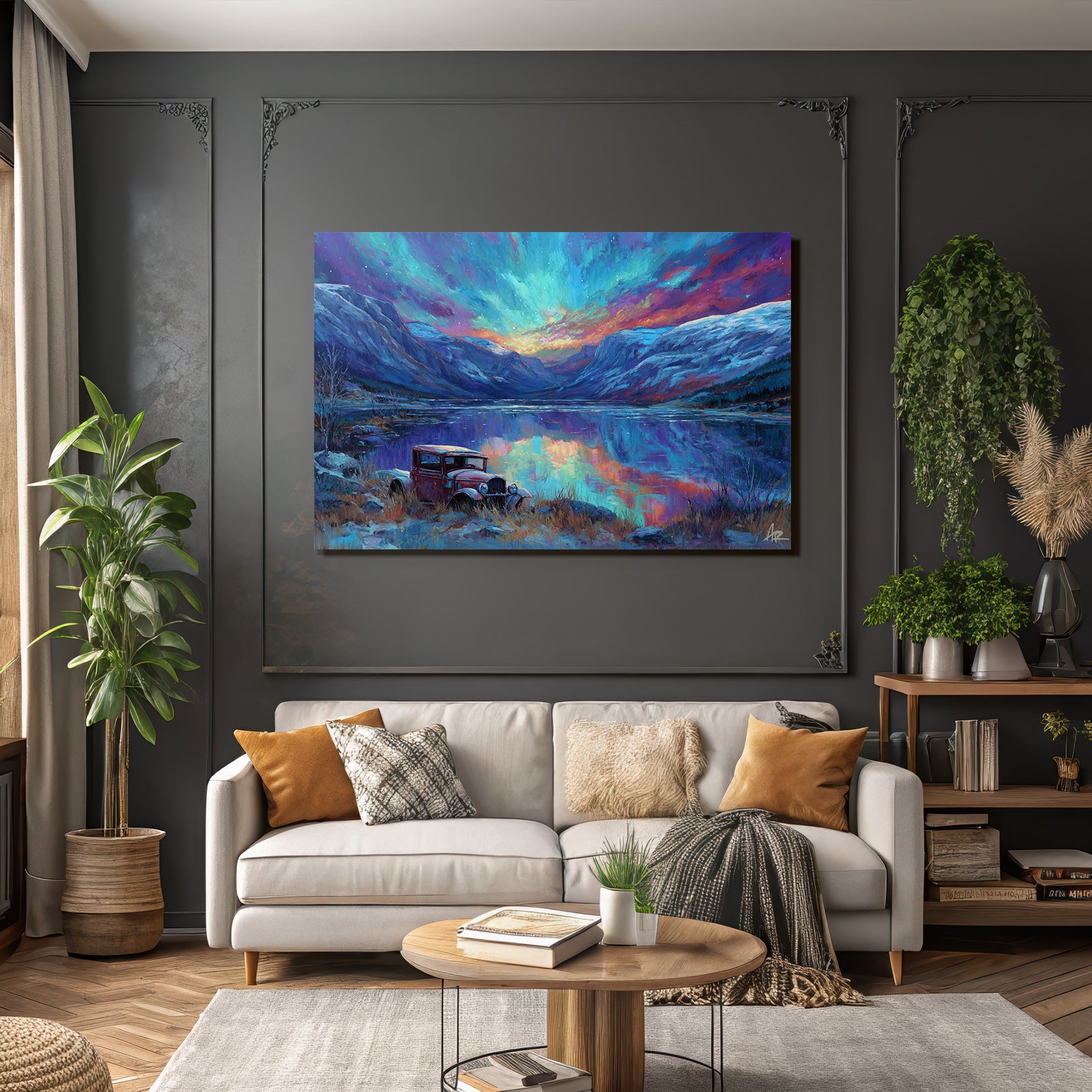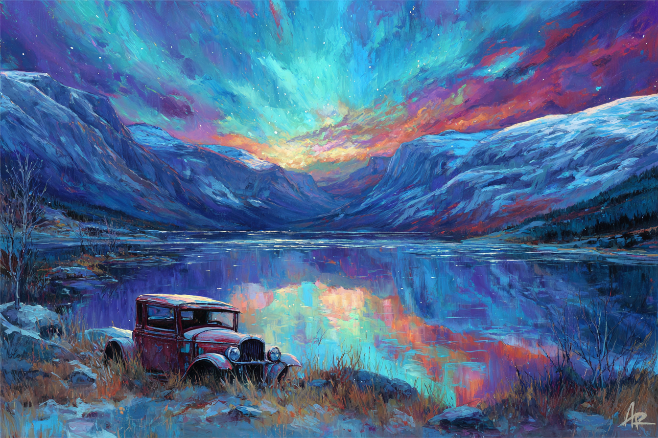Erlebe Kunst im Stil Fjorde und Gletscher neu: „Polarlicht Buntes Landschaftsbild Mit See Und Rotem Auto“ wird durch den eleganten FameFrame™ zum Blickfang in jedem Raum.