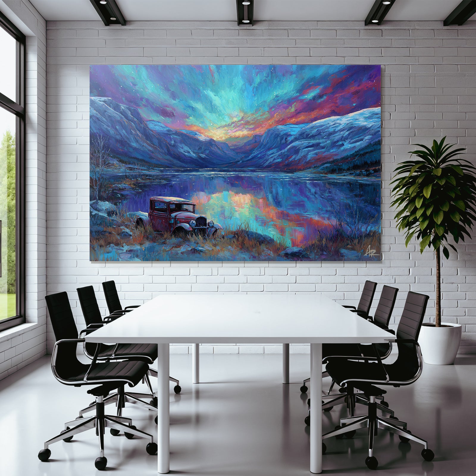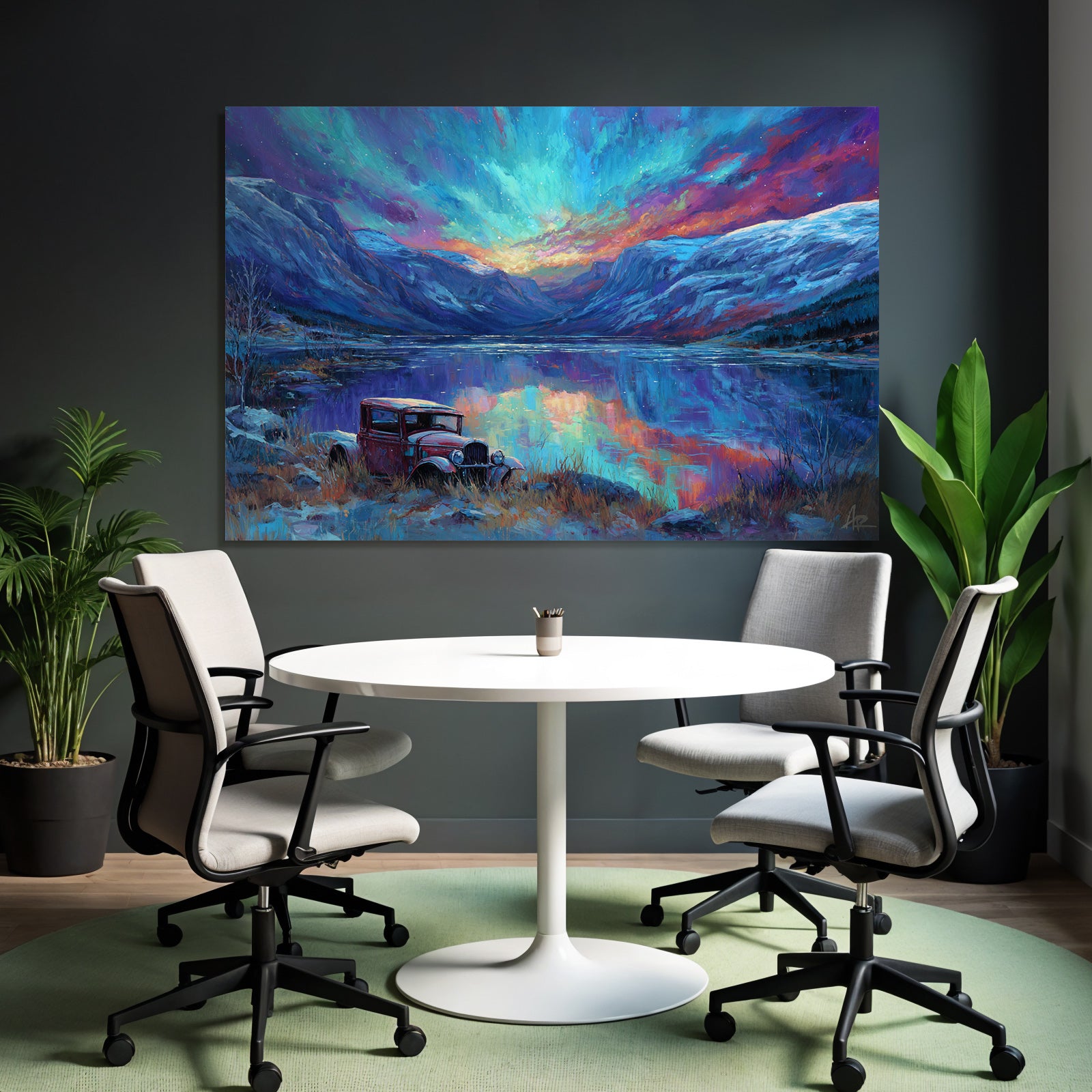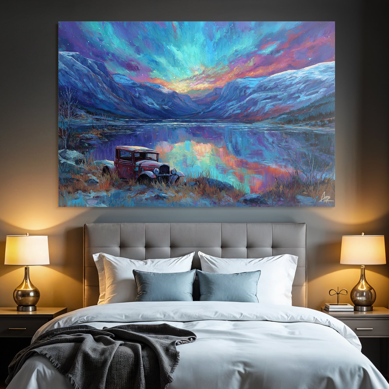 Erlebe Kunst im Stil Fjorde und Gletscher neu: „Polarlicht Buntes Landschaftsbild Mit See Und Rotem Auto“ wird durch den eleganten FameFrame™ zum Blickfang in jedem Raum.