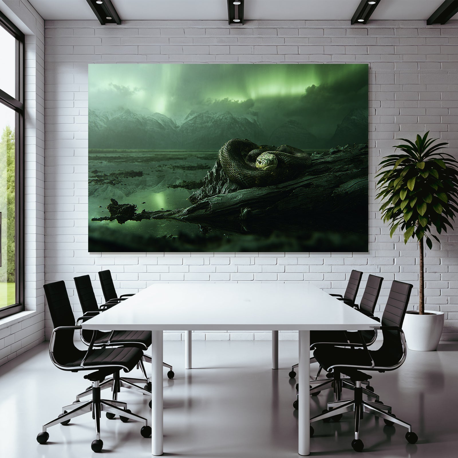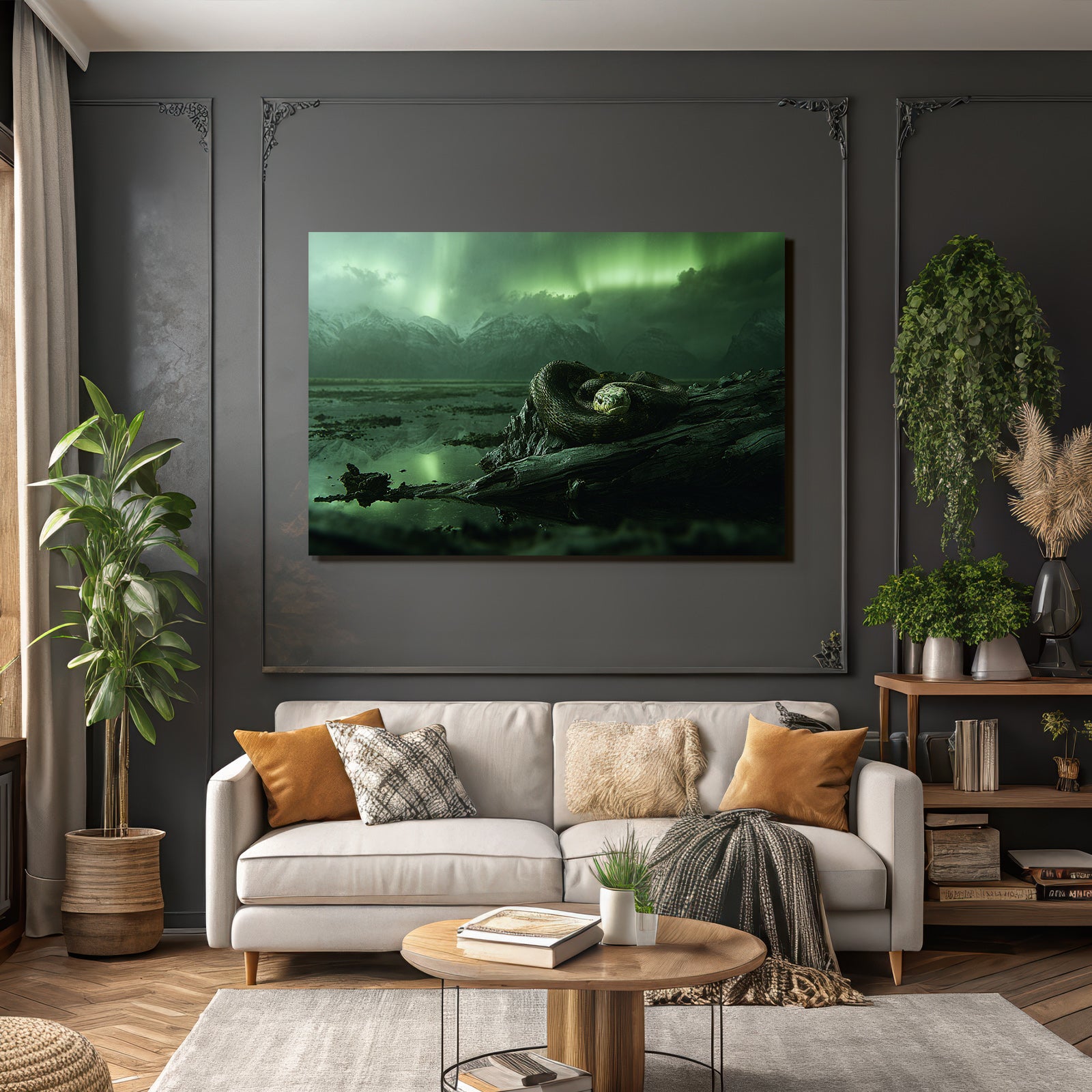 „Polarlicht Grosser Schlange Um Driftwood Mit Grüner Aurora Im Hintergrund“ verleiht Ihrem Raum Charakter. Die Anlehnung an den Stil Fjorde und Gletscher, kombiniert mit der schlichten Eleganz des FameFrame™, schafft eine einzigartige Atmosphäre.