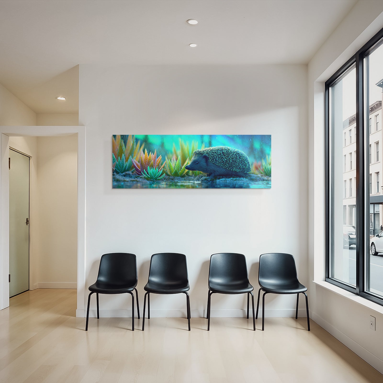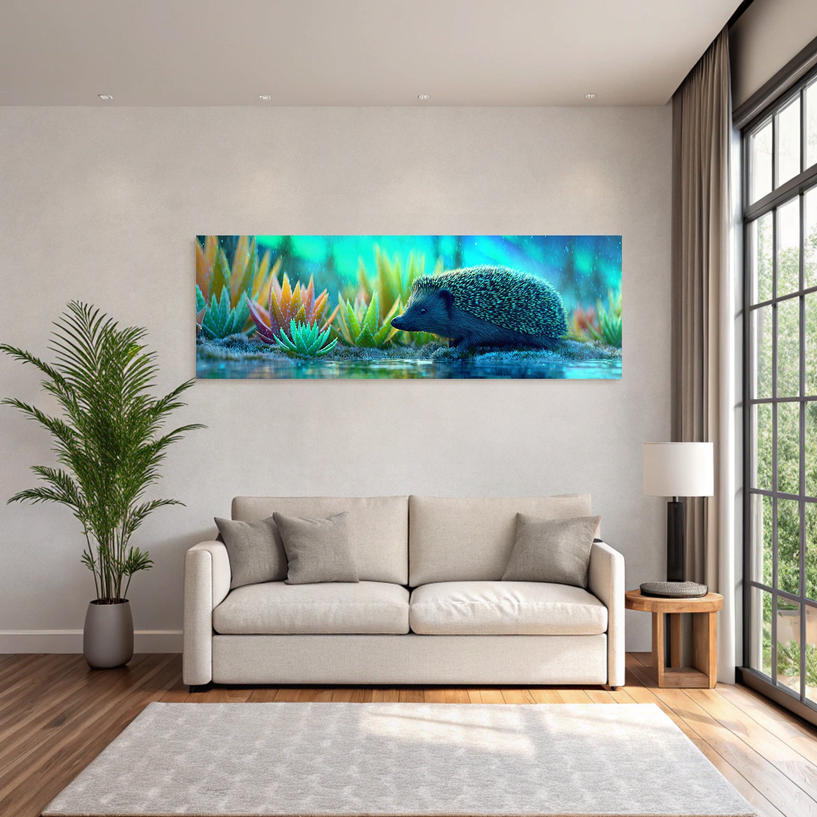 Mit „Polarlicht Hedgehog In Vibrant Colorful Landscape Mit Sukkulenten Regnerischem Atmosphare“ entscheiden Sie sich für ein ausdrucksstarkes Kunstwerk im Stil Fjorde und Gletscher. Der FameFrame™ unterstreicht die moderne und hochwertige Wirkung.