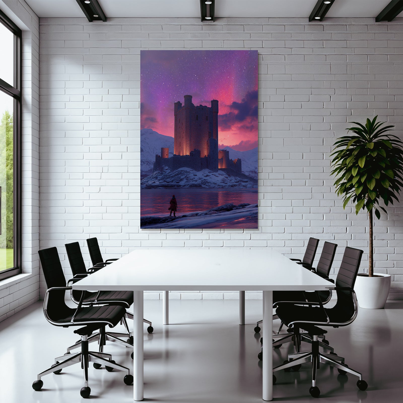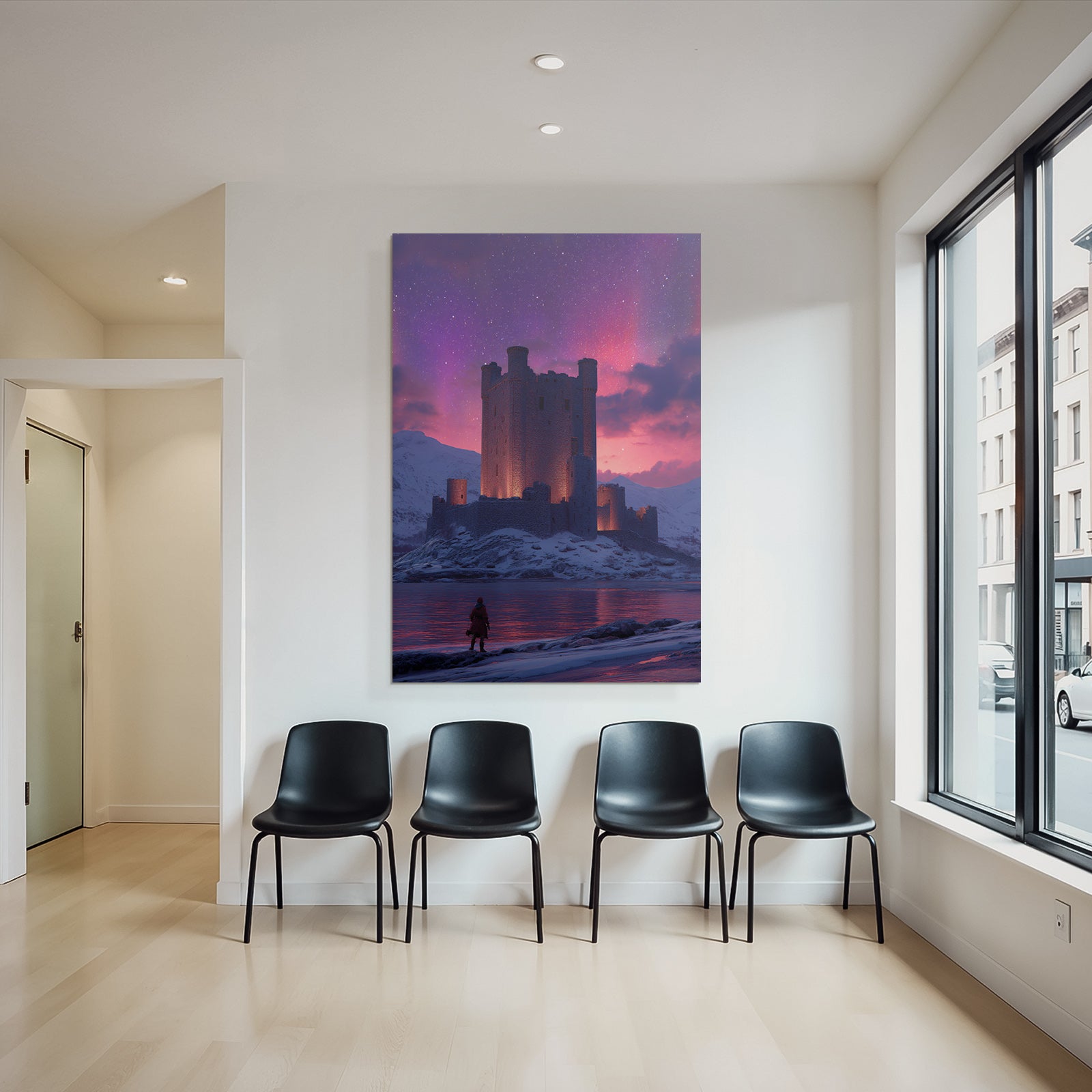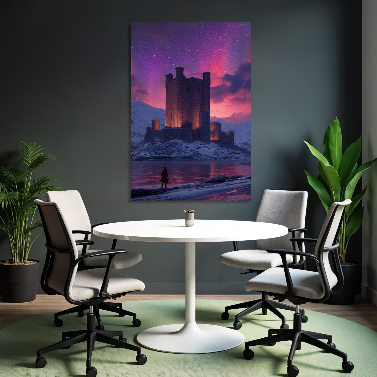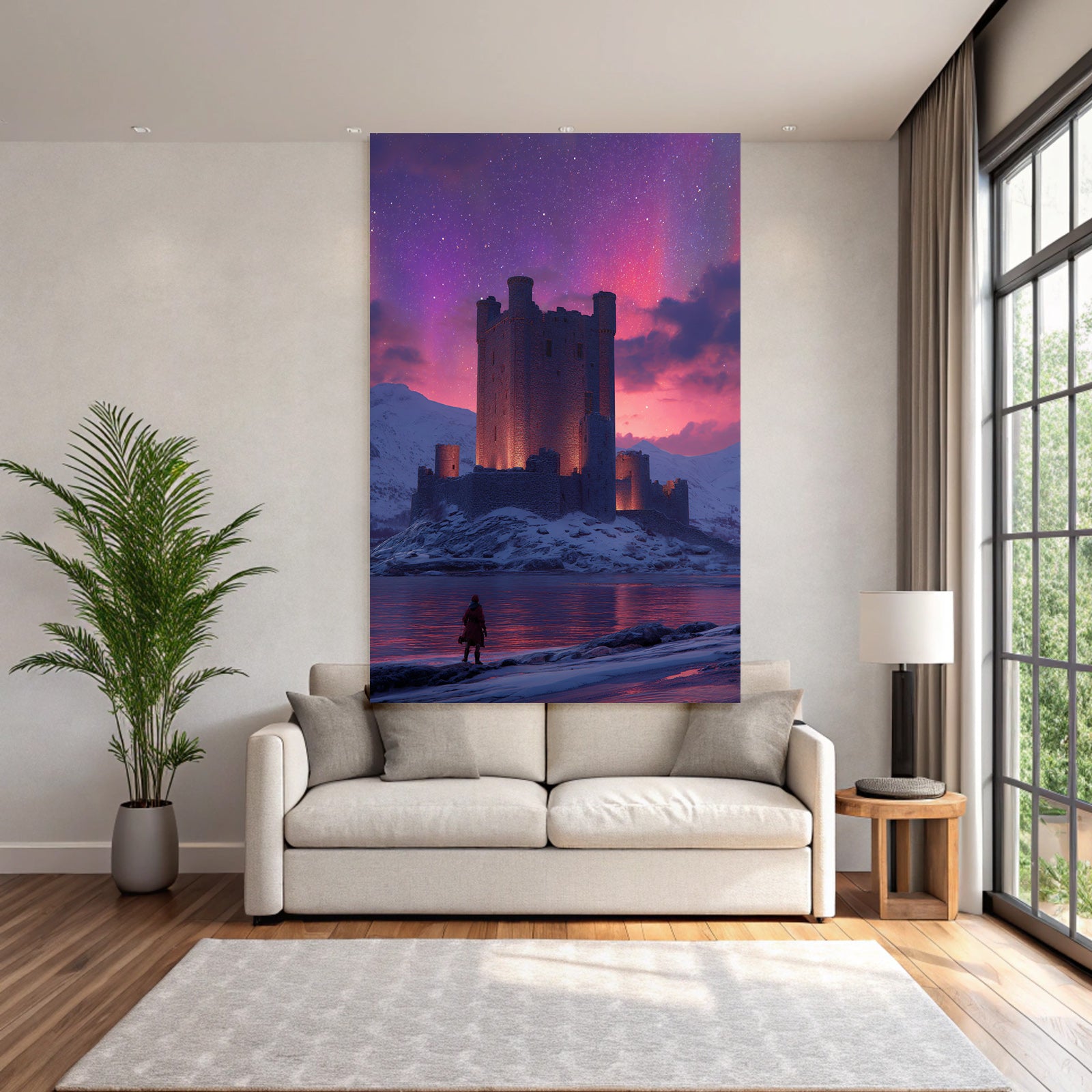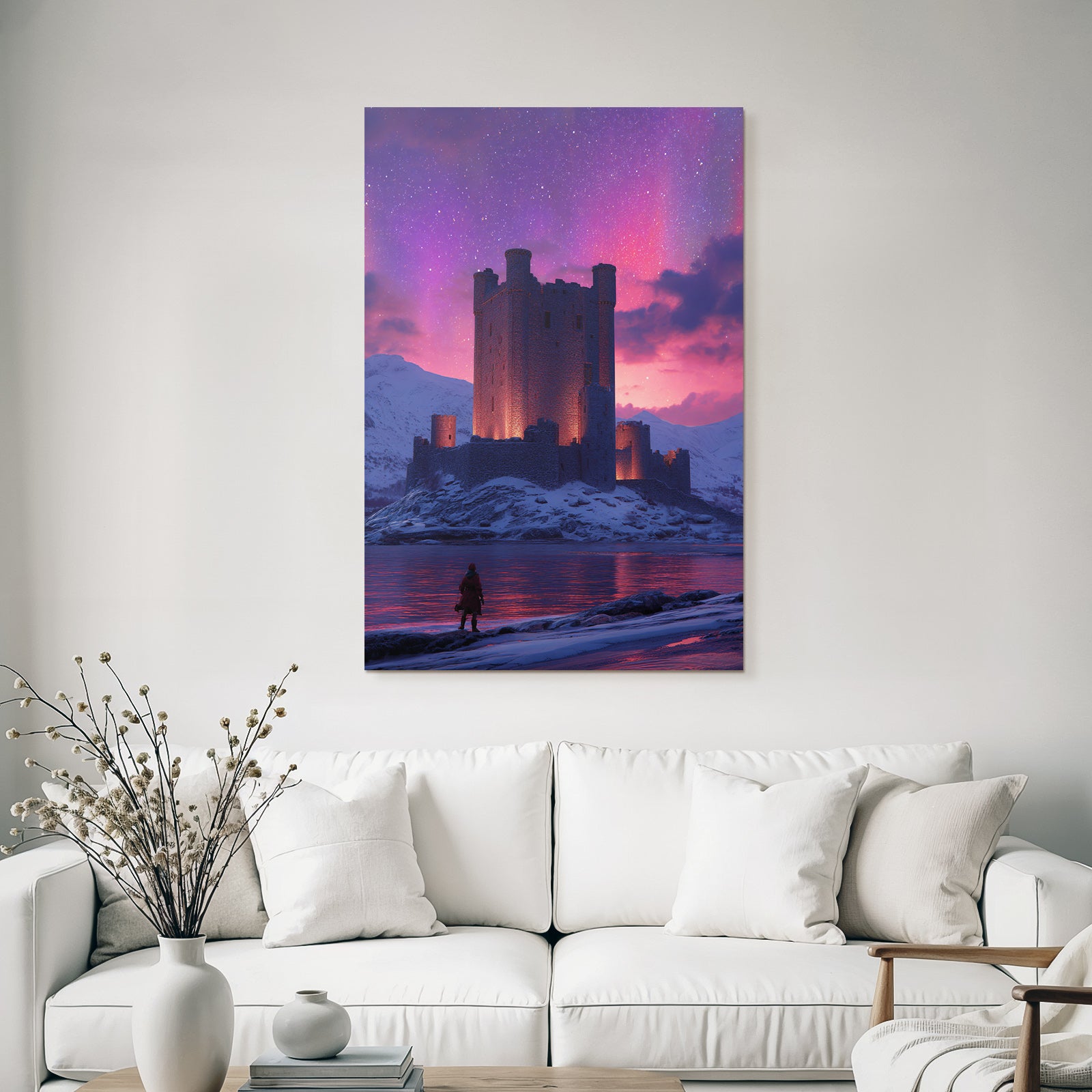 Das Motiv „Polarlicht Mittelalterliches Schloss Am See Bei Twilight Mit Reflexionen Und Sternen“ bringt Fjorde und Gletscher-Inspiration in Dein Zuhause – brillant gedruckt und elegant im FameFrame™ aufgespannt.
