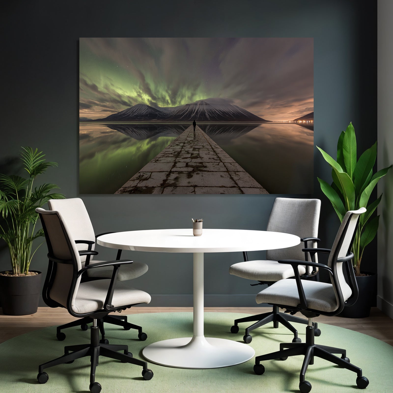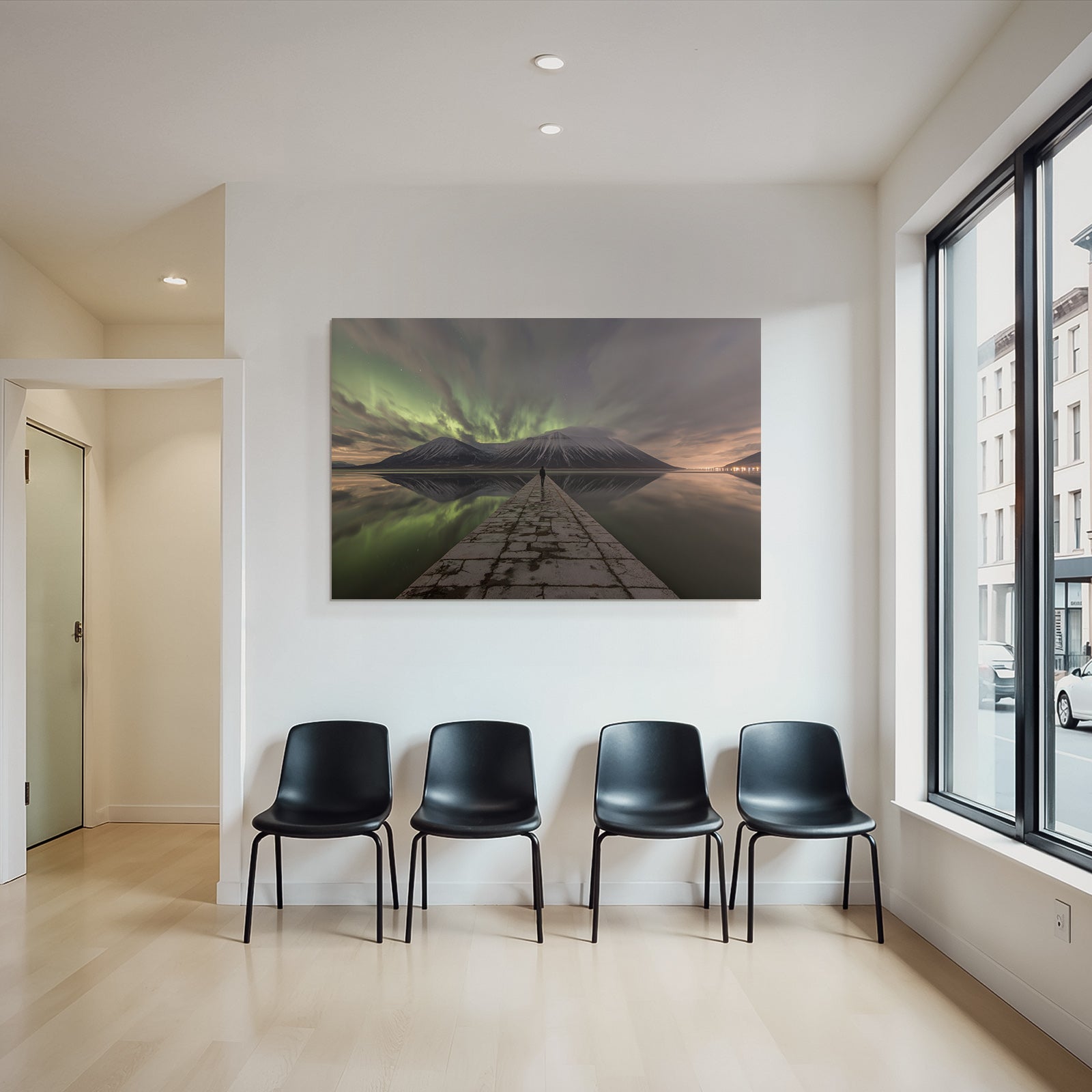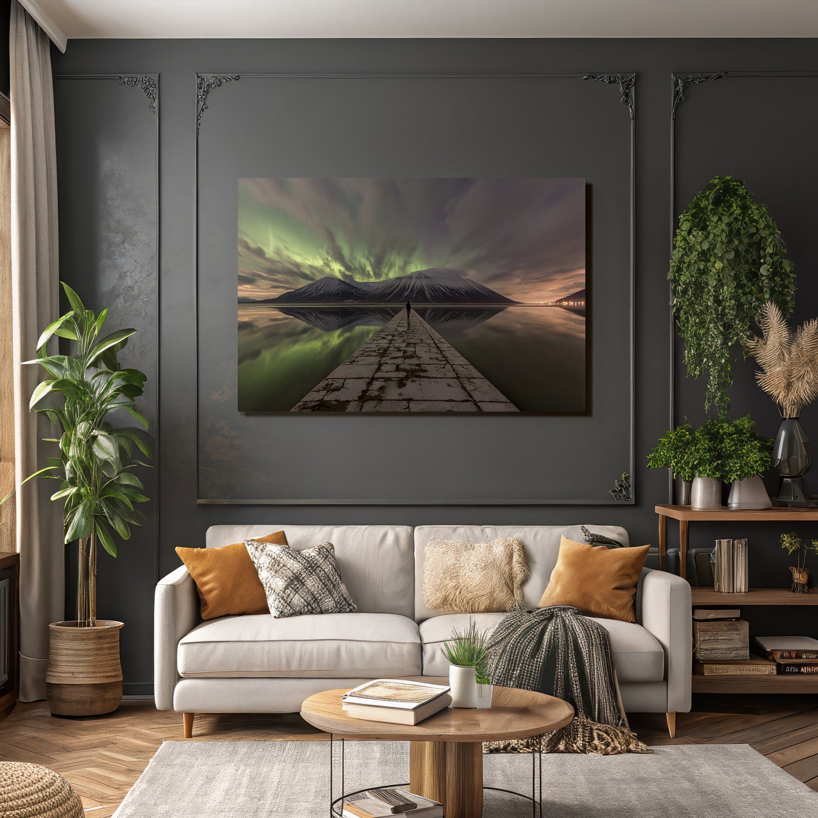 Ob Flur, Wohnraum oder Wartebereich – das Motiv „Polarlicht Naturlandschaft Mit Aurora Borealis Und Bergspiegelung“ im Stil Fjorde und Gletscher wirkt durch den hochwertigen FameFrame™ besonders modern.