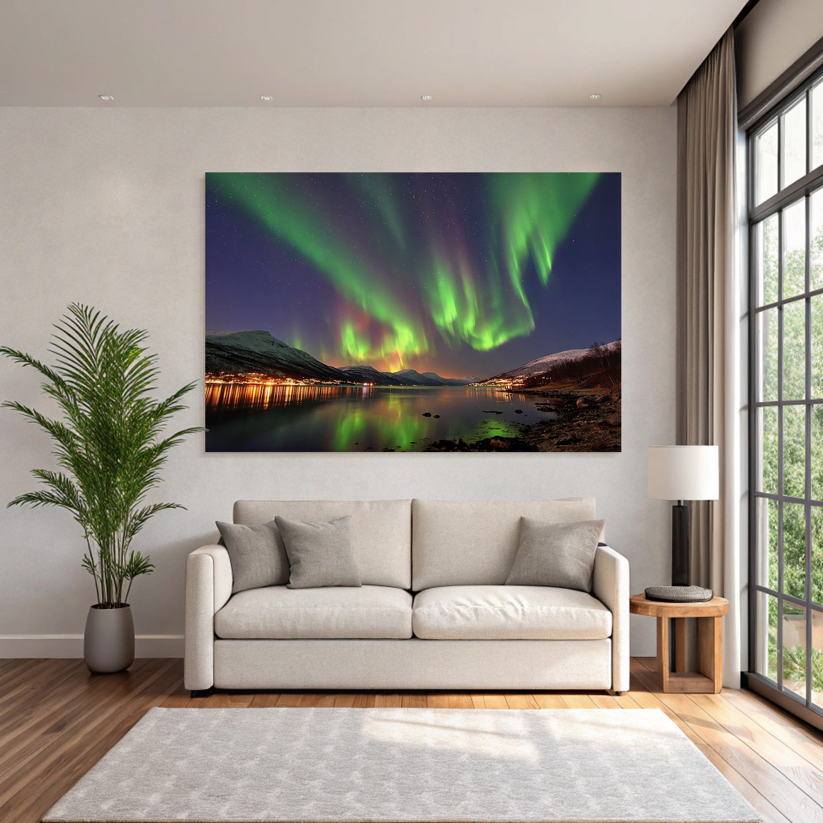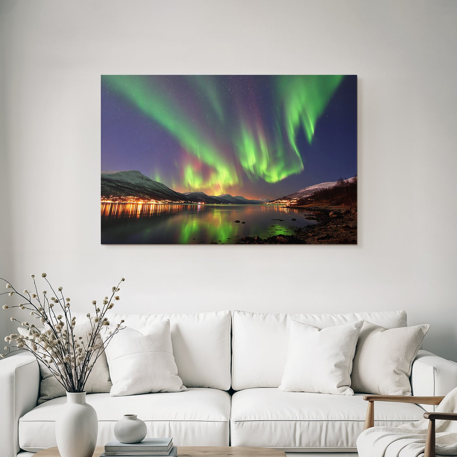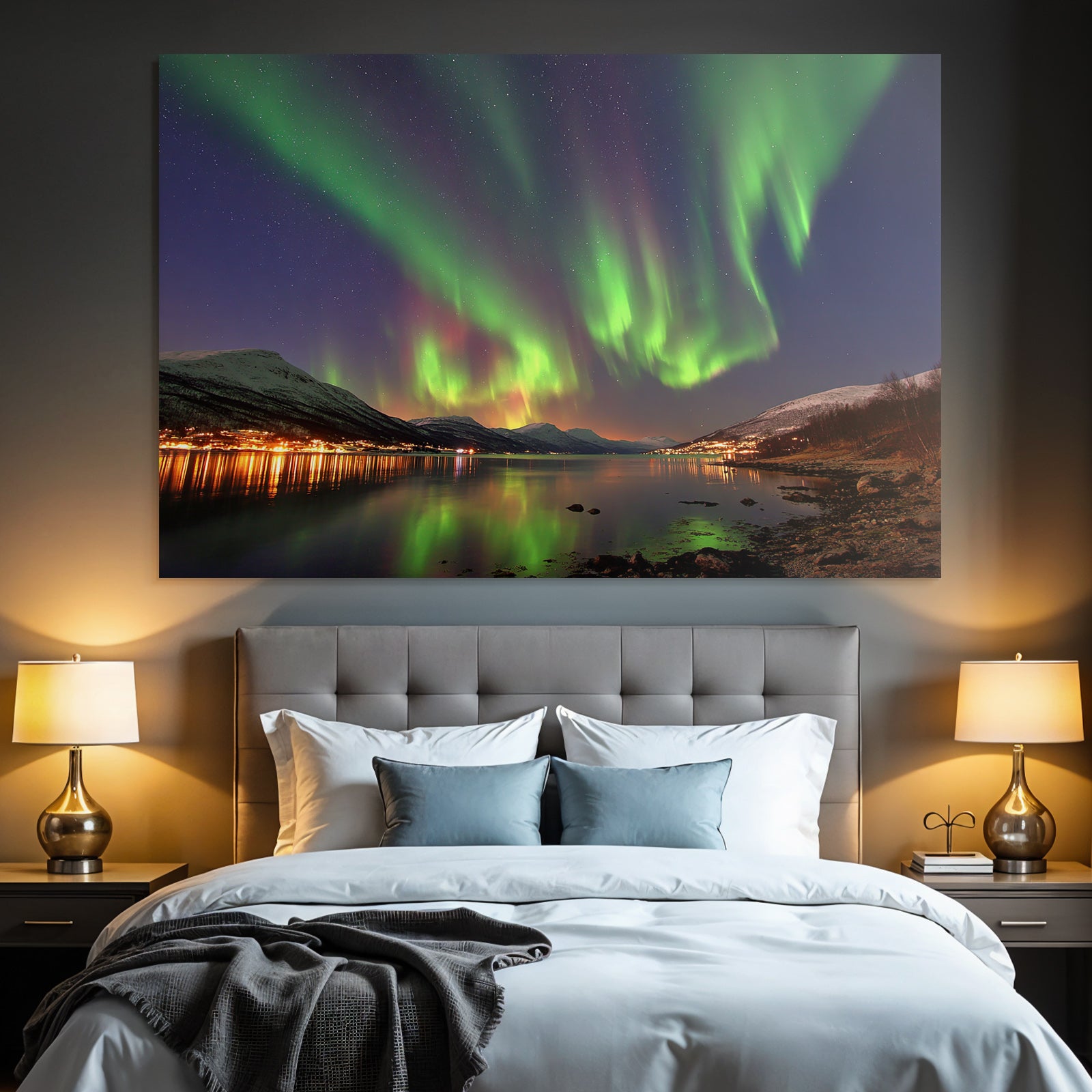 „Polarlicht Nordlichter Mit Reflexion Und Gebirgen“ verbindet das Beste aus Fjorde und Gletscher mit modernem Textildruck – edel präsentiert im hochwertigen FameFrame™.