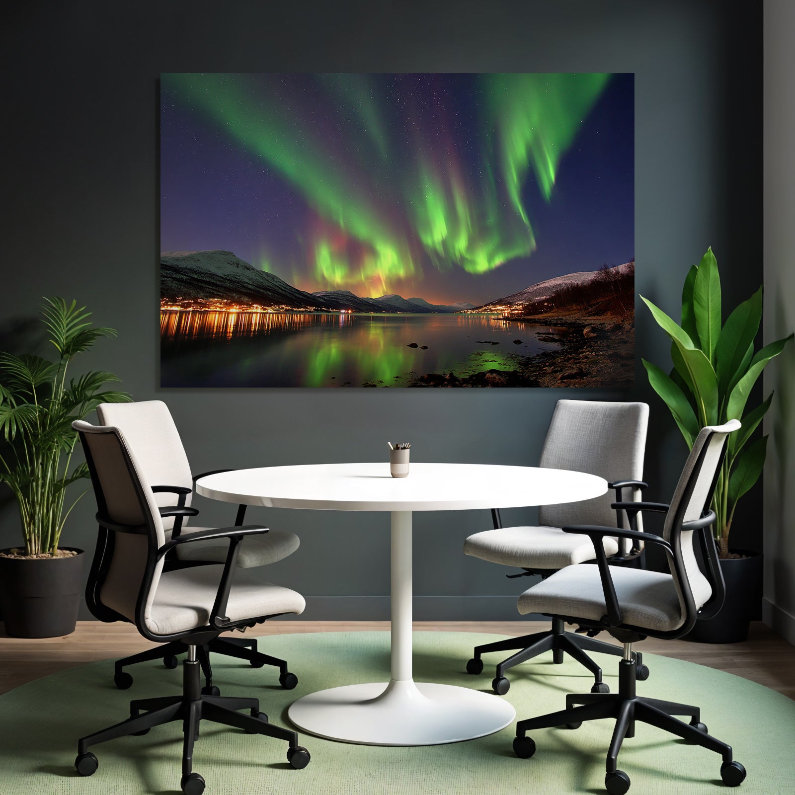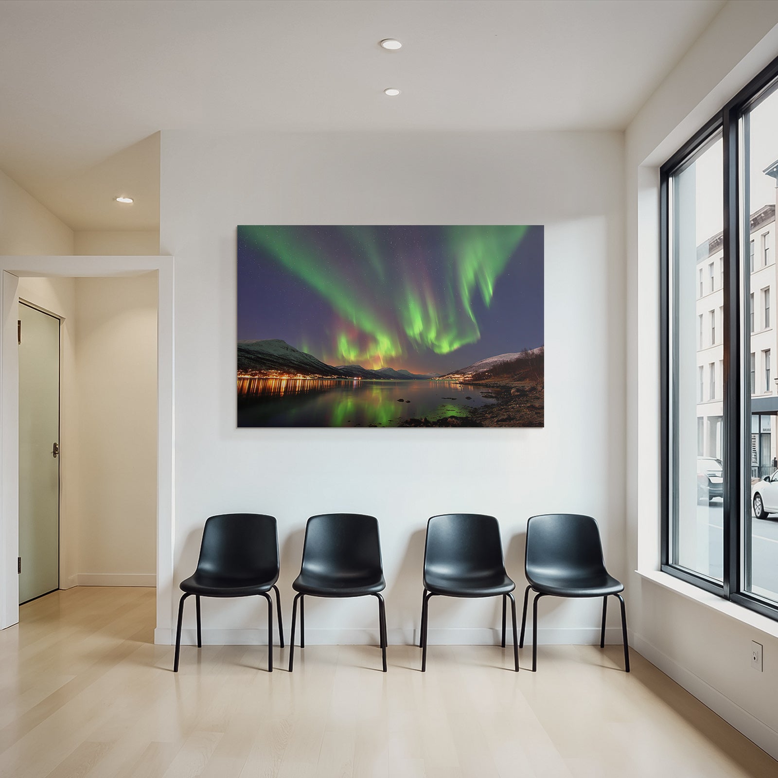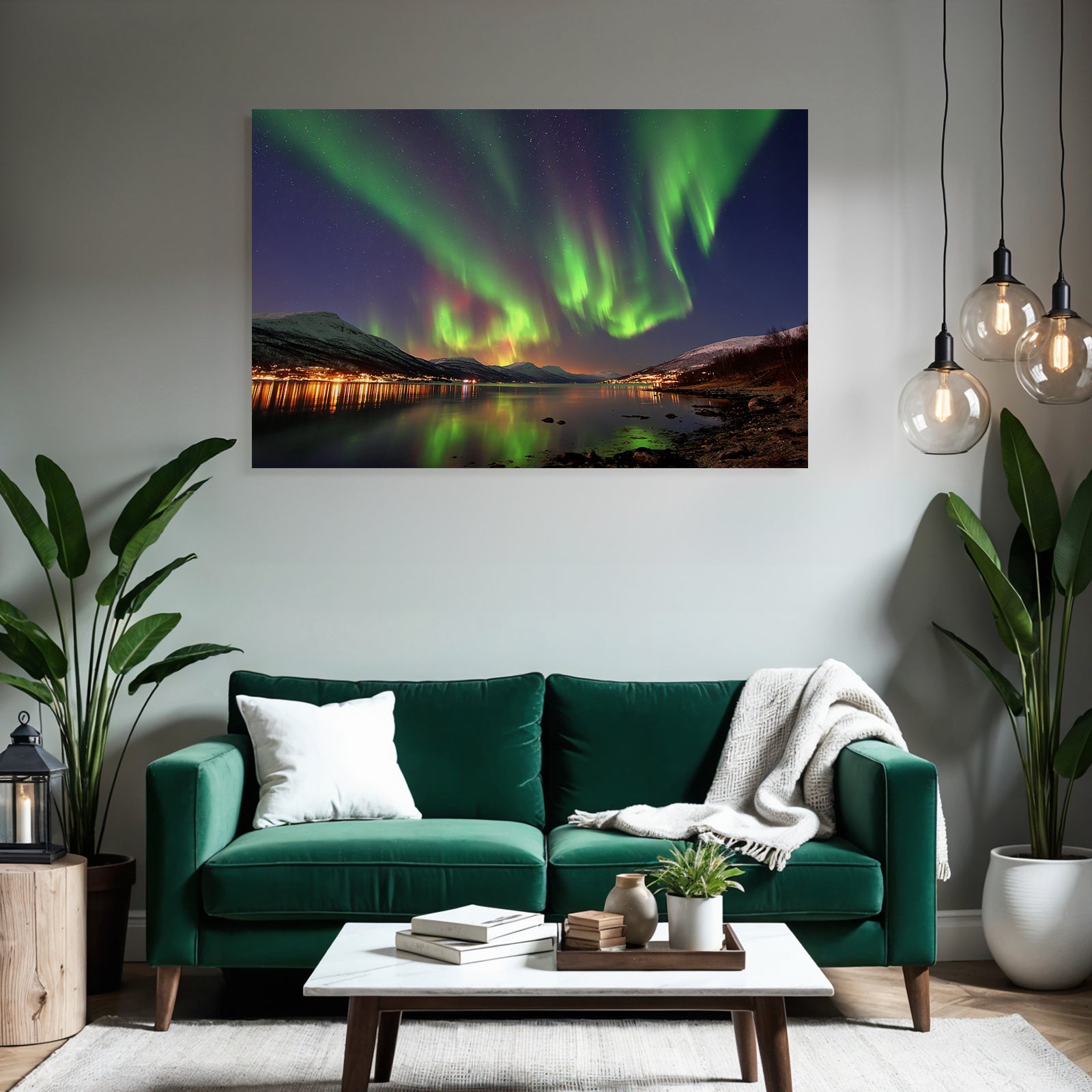 „Polarlicht Nordlichter Mit Reflexion Und Gebirgen“ verbindet das Beste aus Fjorde und Gletscher mit modernem Textildruck – edel präsentiert im hochwertigen FameFrame™.