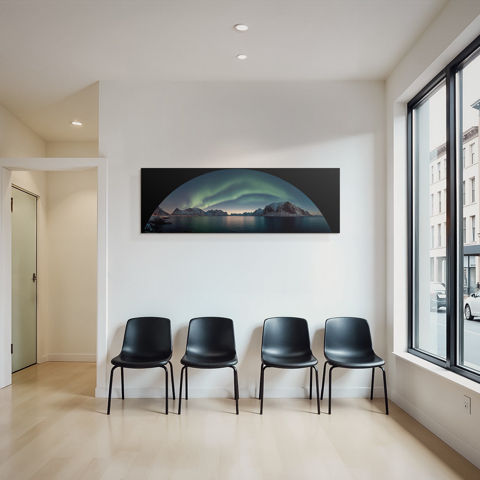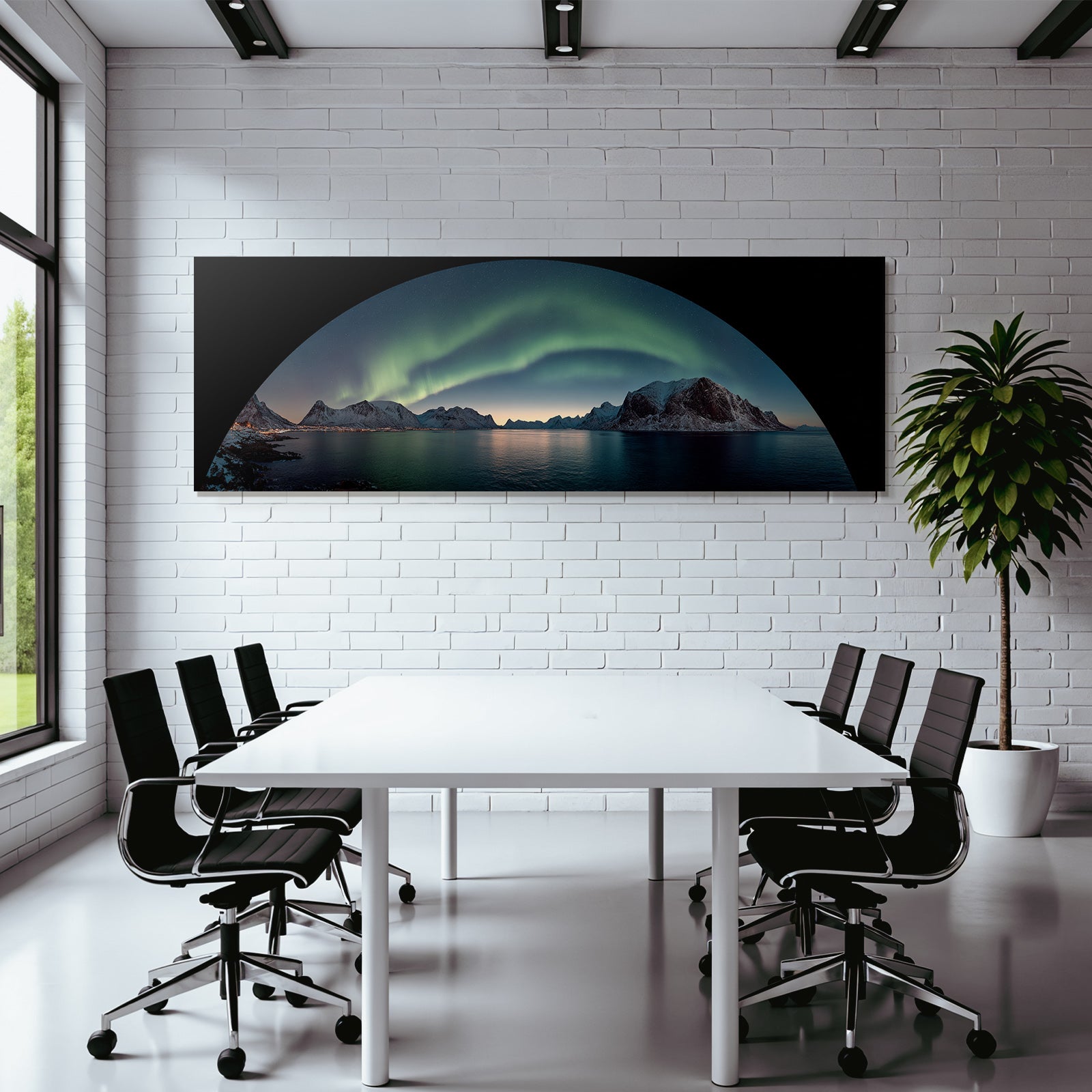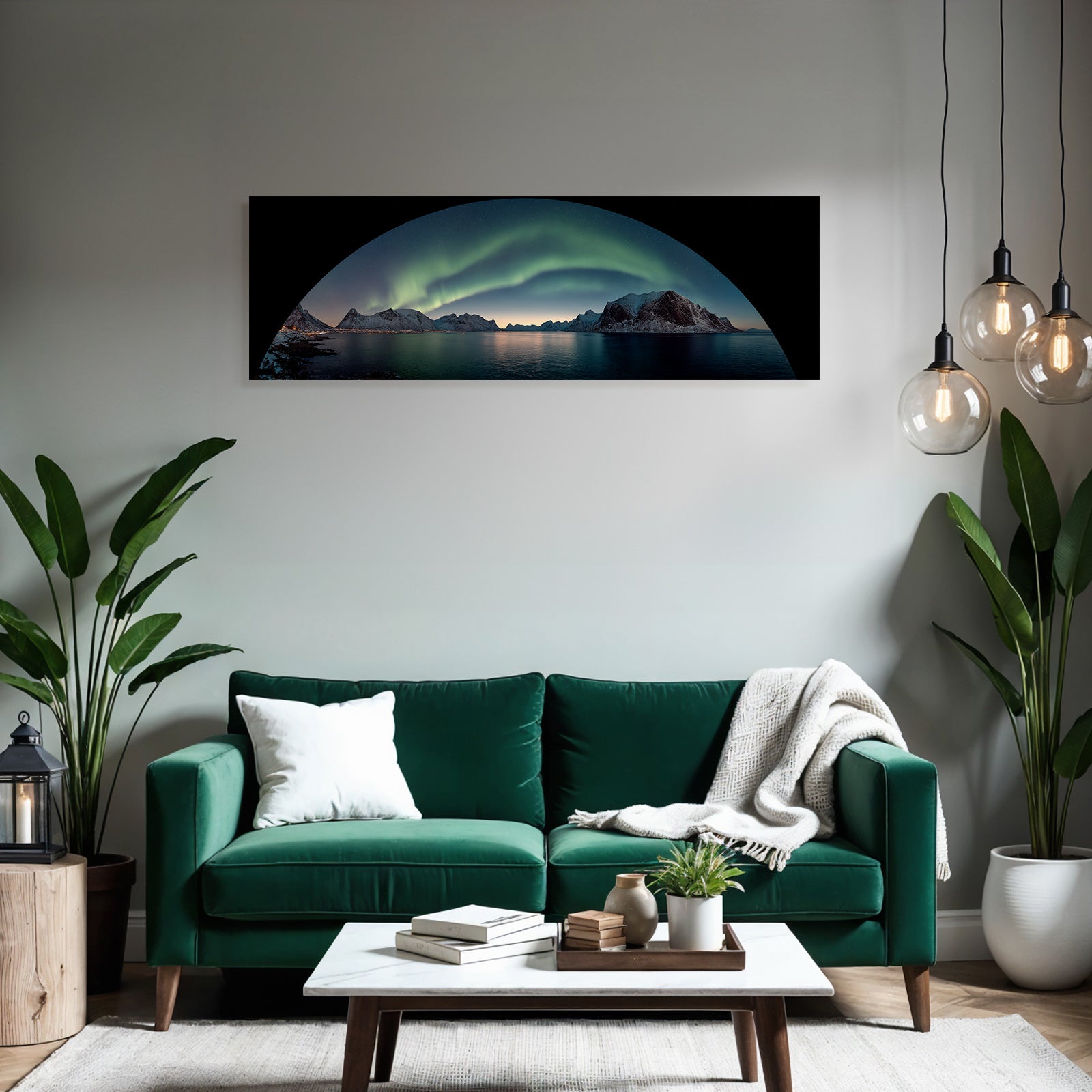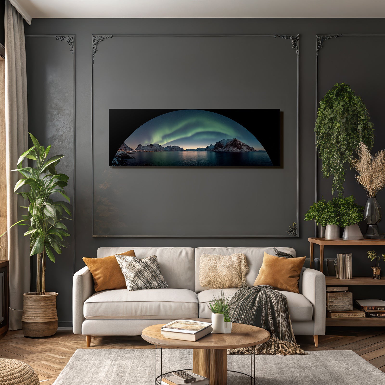 Mach mehr aus Deinem Wohnbereich oder Besprechungszimmer„Polarlicht Nordlichter Nachts Schneebedeckte Landschaft Reflexionen“ im Stil Fjorde und Gletscher überzeugt als eleganter Textildruck im FameFrame™.