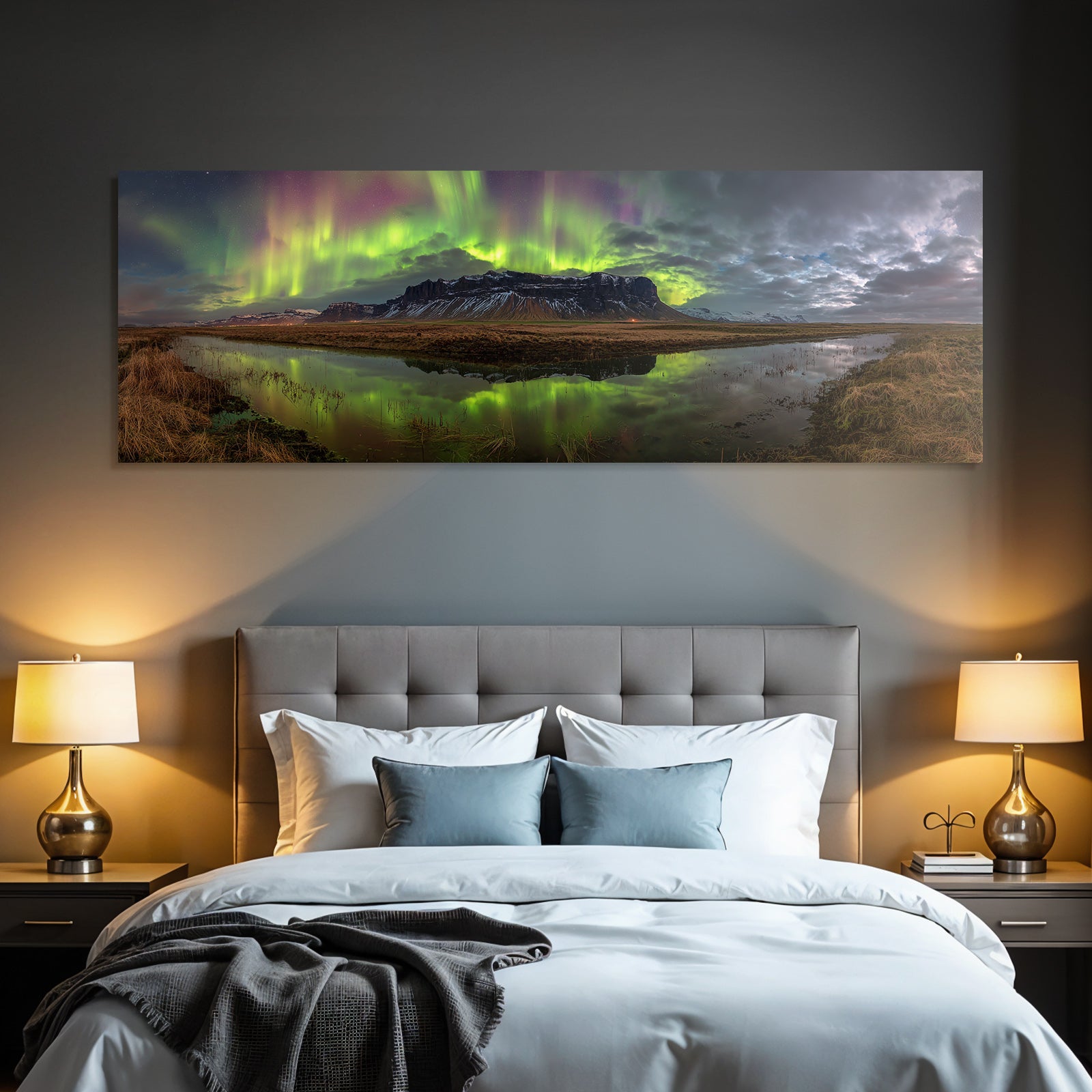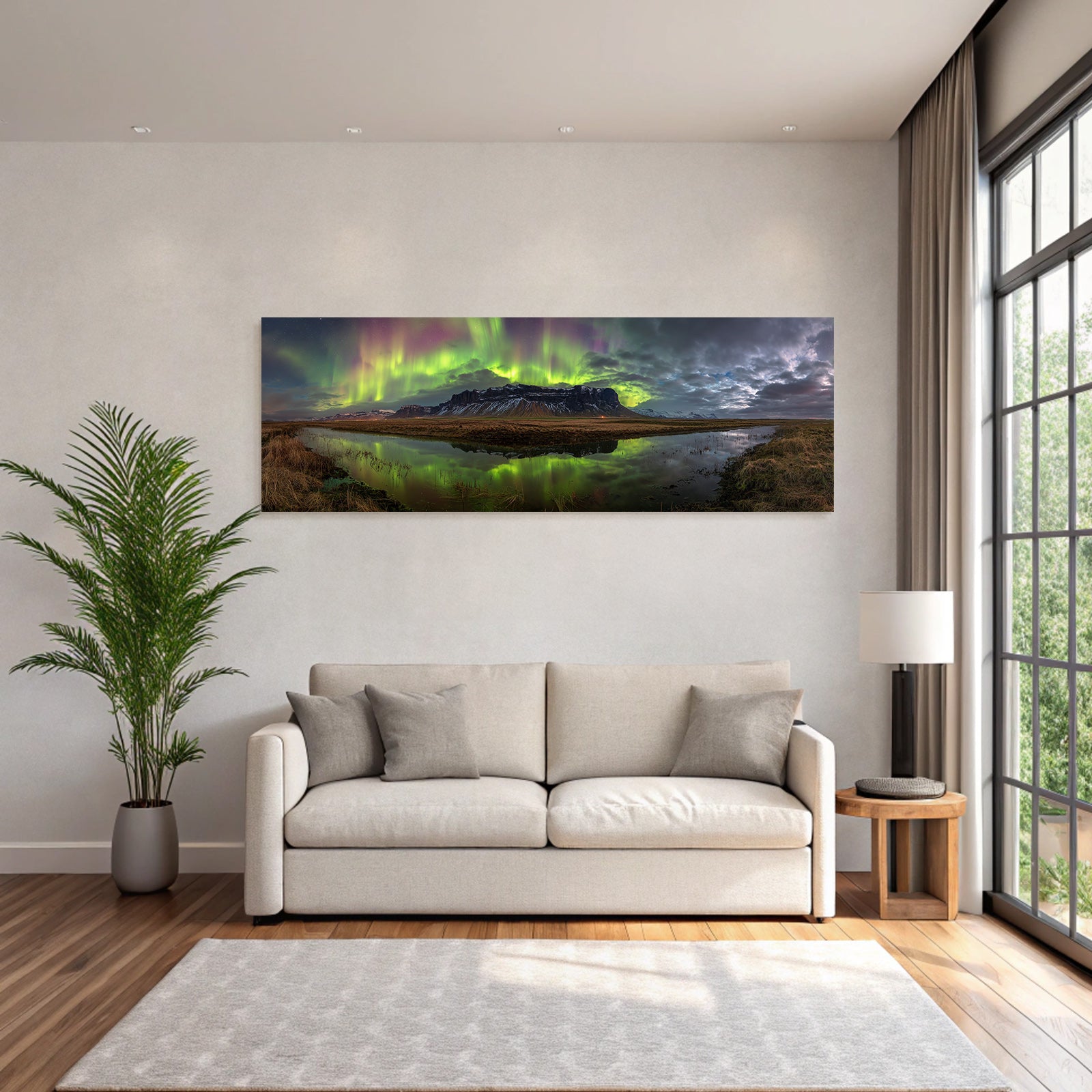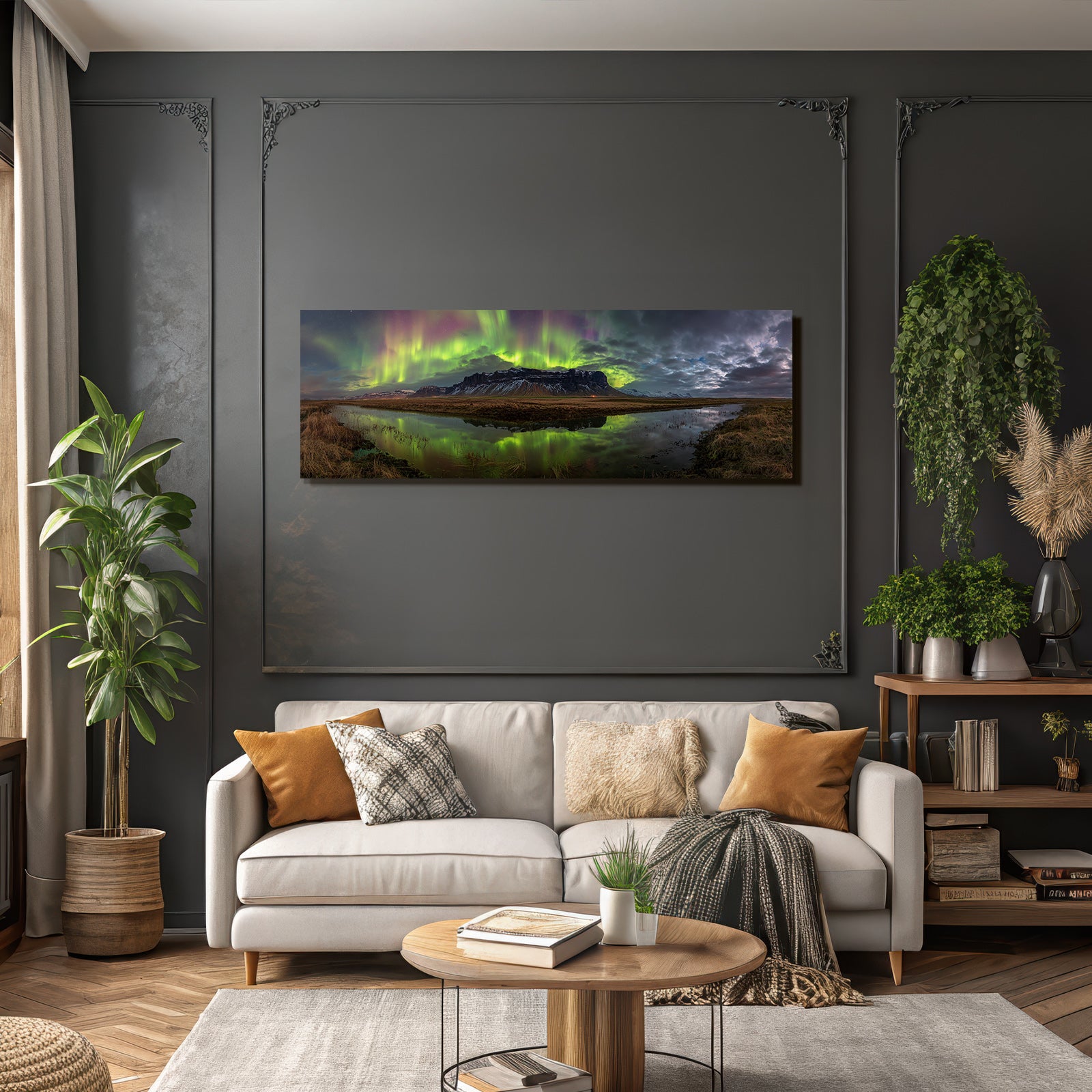 Ein Stück Fjorde und Gletscher für Deine vier Wände: Das Werk „Polarlicht Nordlichter Reflexion Im Wasser Berglandschaft“ im hochwertigen FameFrame™ bringt kreative Energie in jeden Raum.