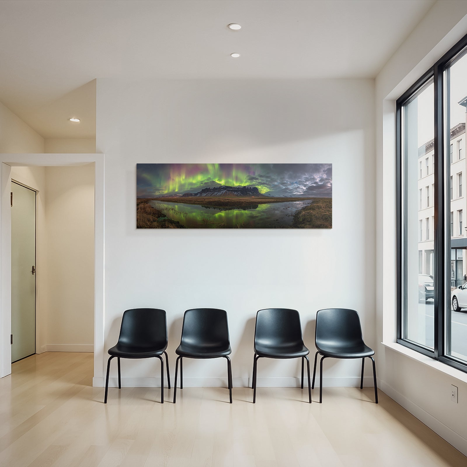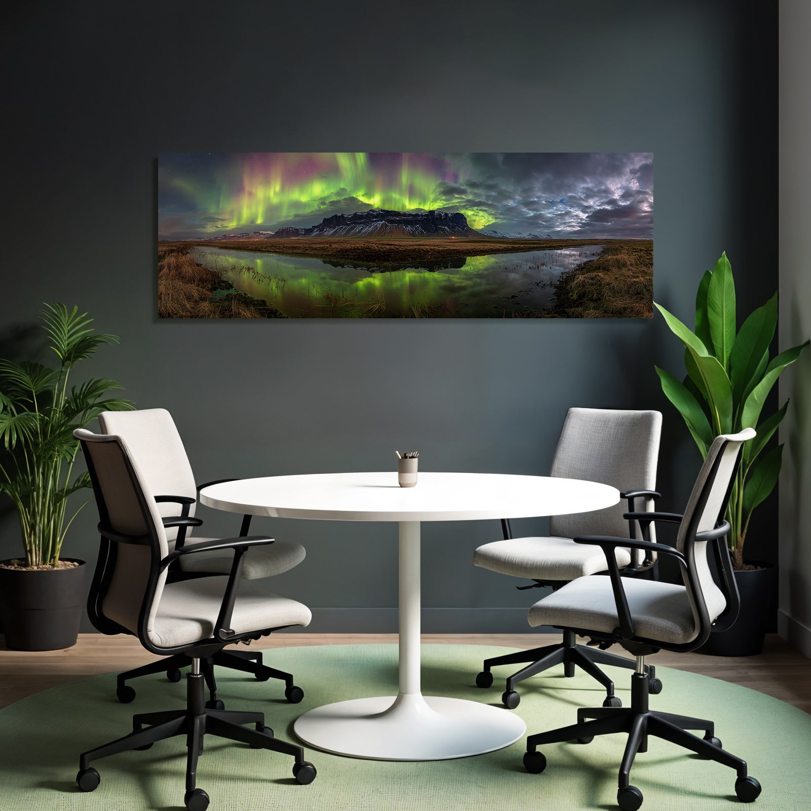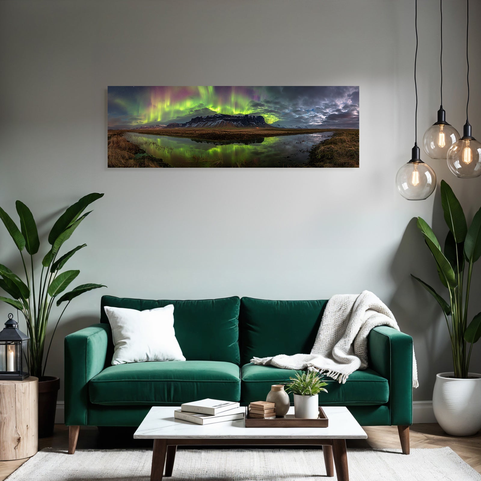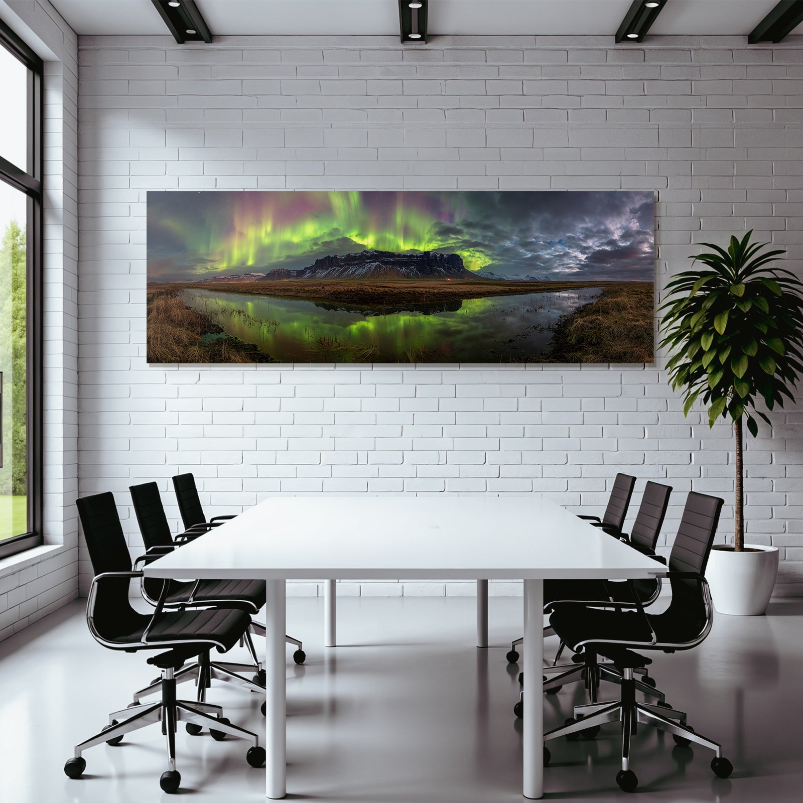 Ein Stück Fjorde und Gletscher für Deine vier Wände: Das Werk „Polarlicht Nordlichter Reflexion Im Wasser Berglandschaft“ im hochwertigen FameFrame™ bringt kreative Energie in jeden Raum.