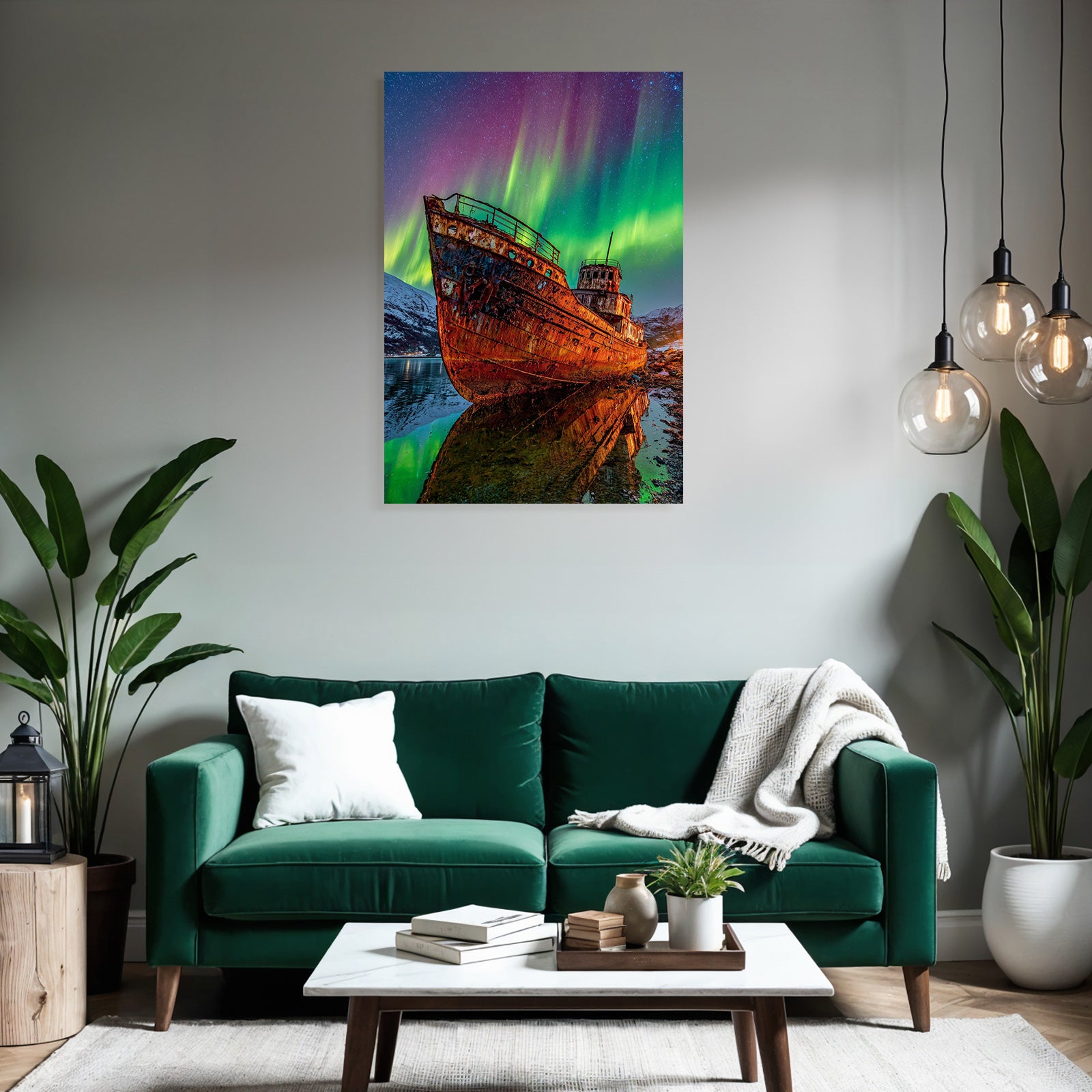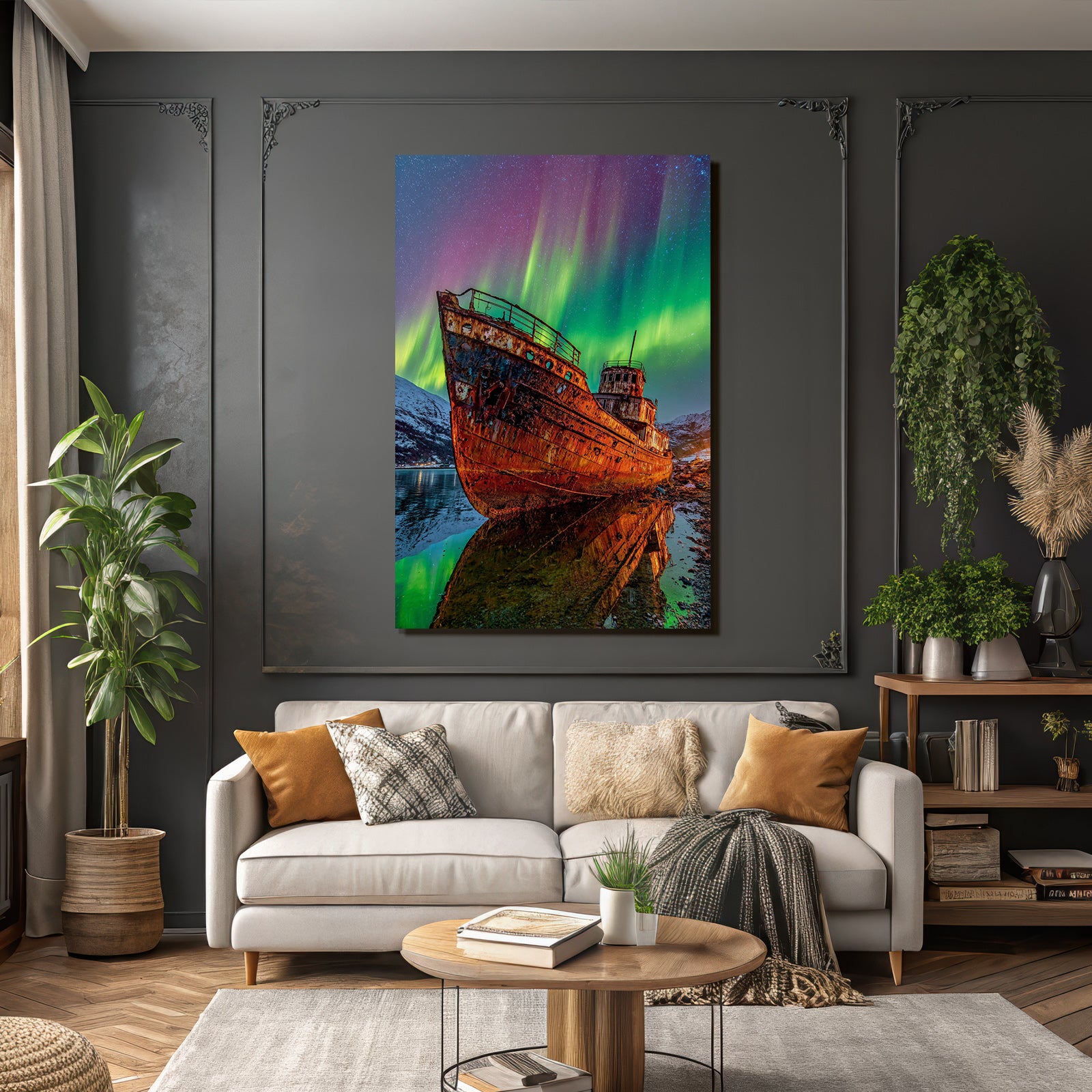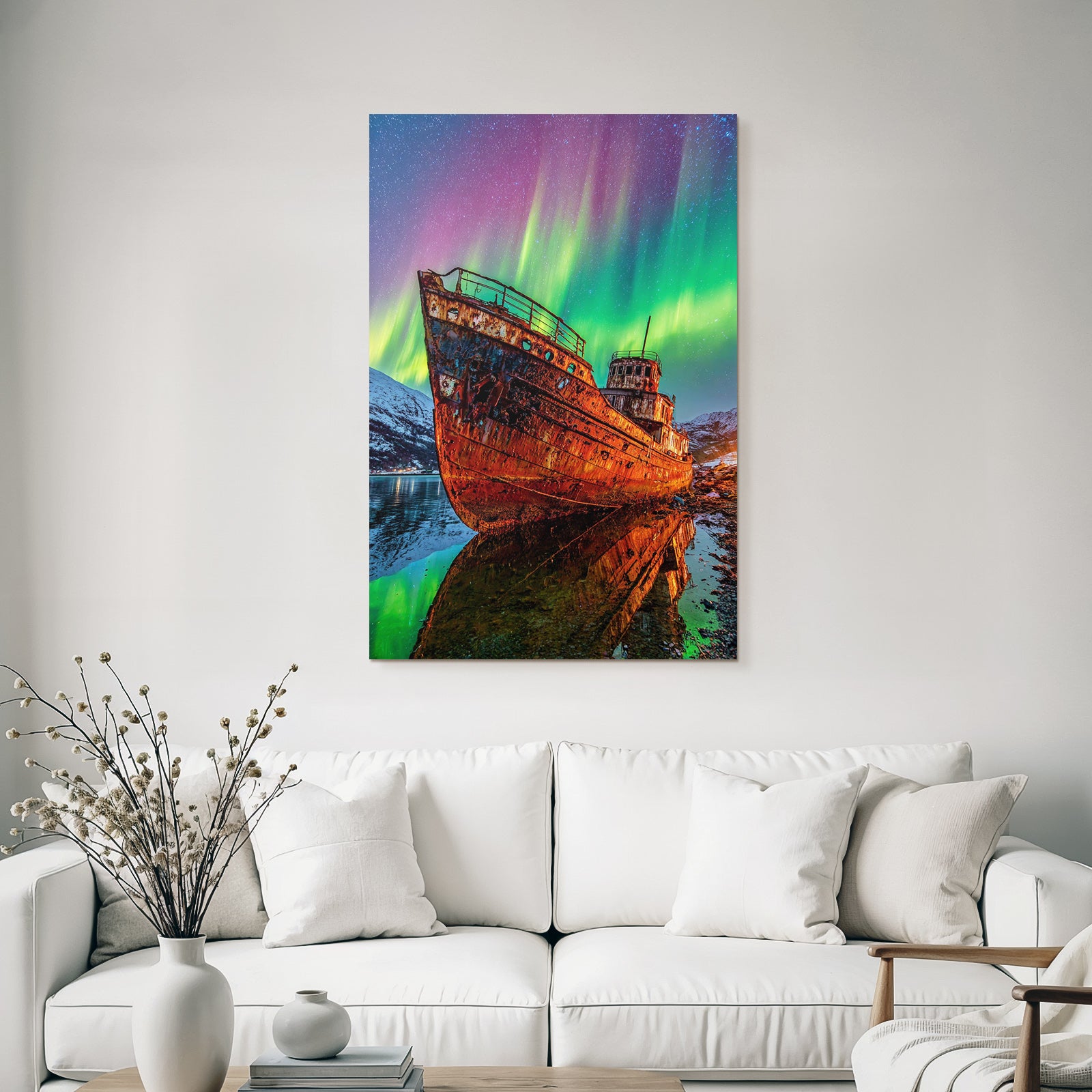 Dieses Werk mit dem Titel „Polarlicht Rustiges Schiffwrack Unter Dem Aurora Borealis Mit Reflexion Im Wasser“ ist eine meisterhafte Interpretation des Stils Fjorde und Gletscher. Auf Stoff gespannt im FameFrame™, entsteht ein fast schwebender Eindruck.