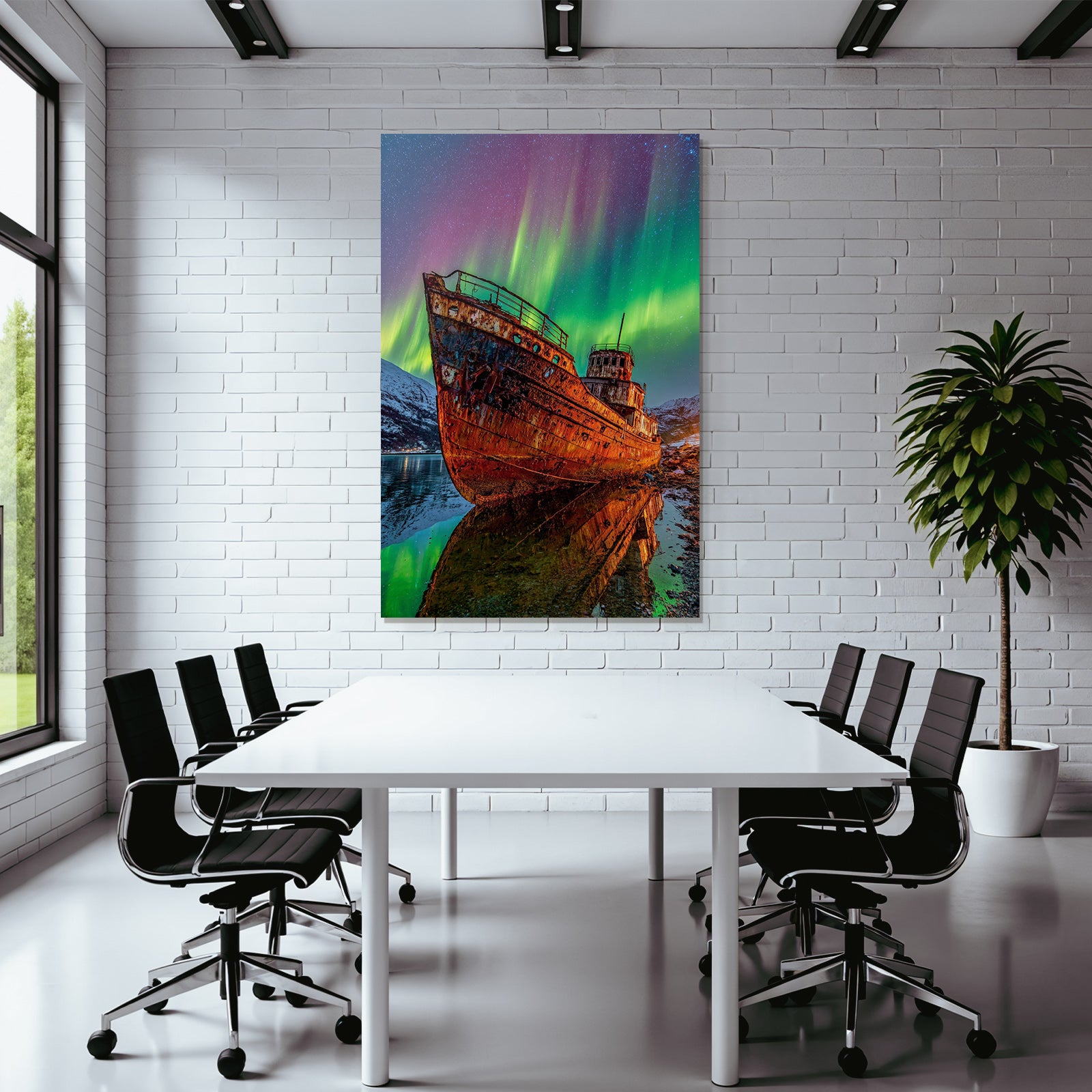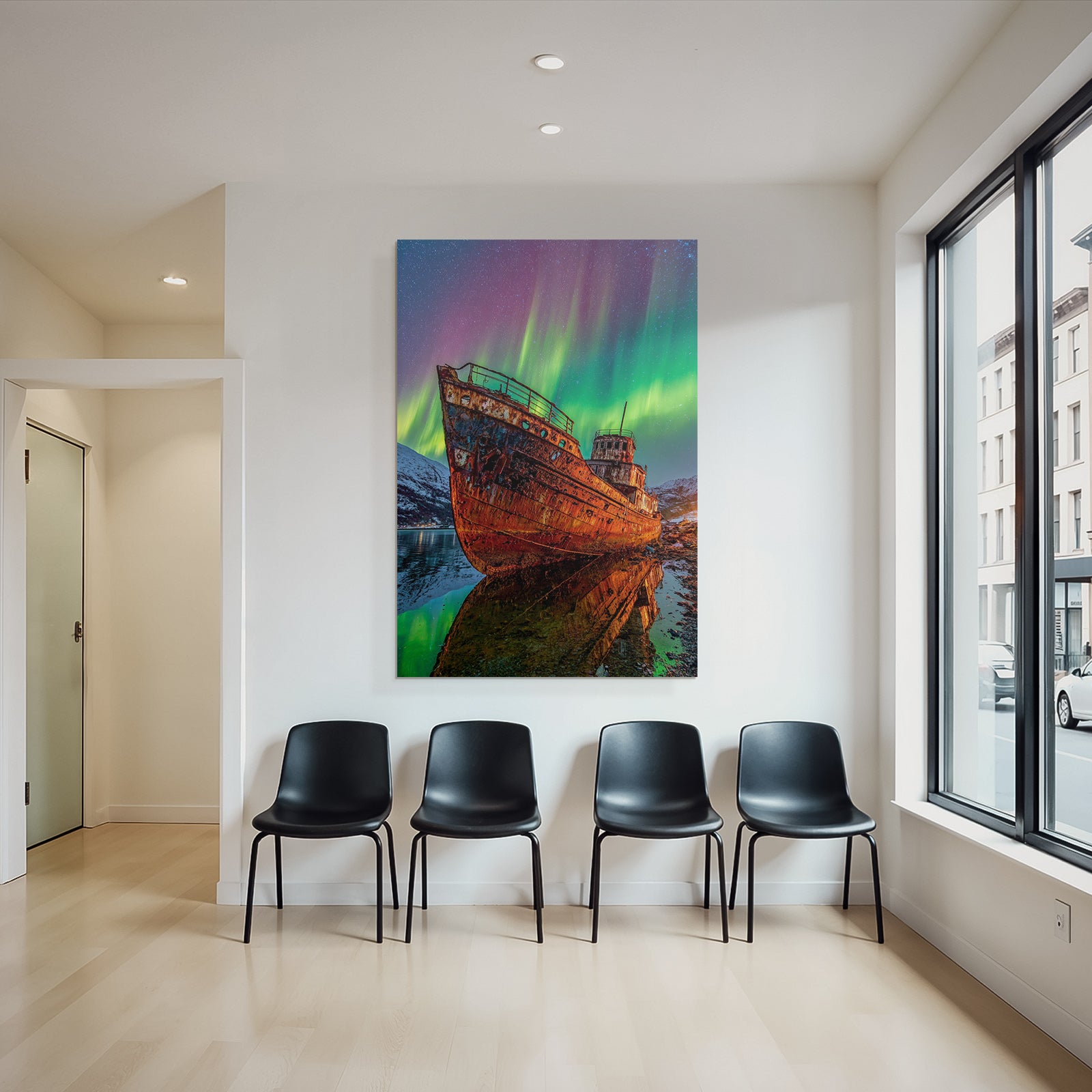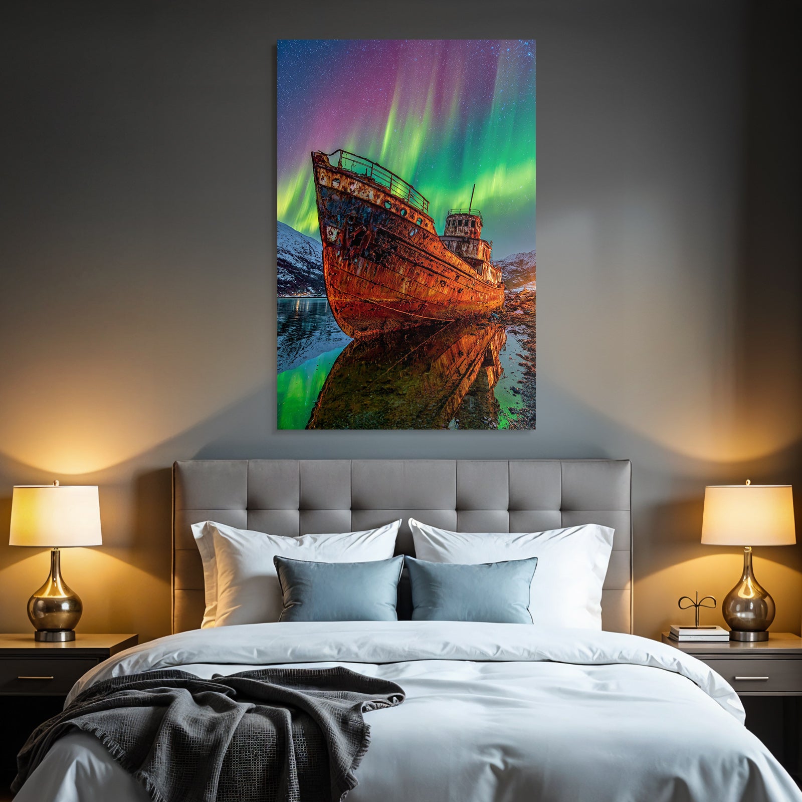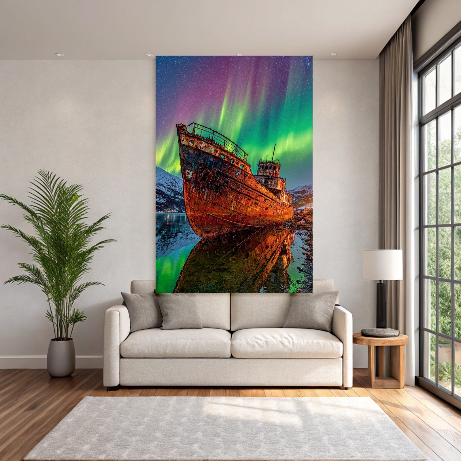 Dieses Werk mit dem Titel „Polarlicht Rustiges Schiffwrack Unter Dem Aurora Borealis Mit Reflexion Im Wasser“ ist eine meisterhafte Interpretation des Stils Fjorde und Gletscher. Auf Stoff gespannt im FameFrame™, entsteht ein fast schwebender Eindruck.