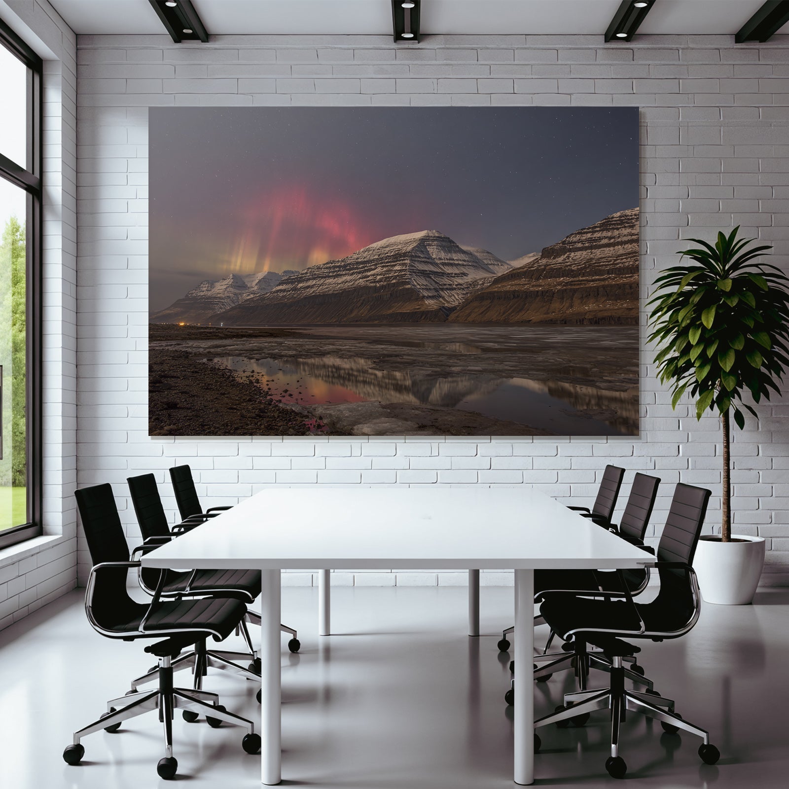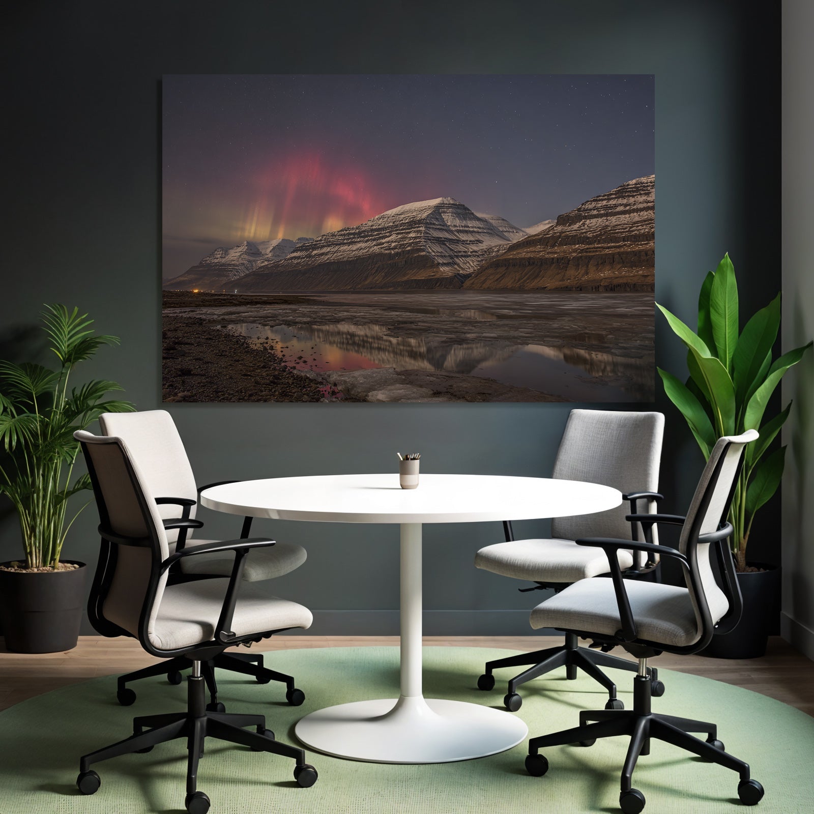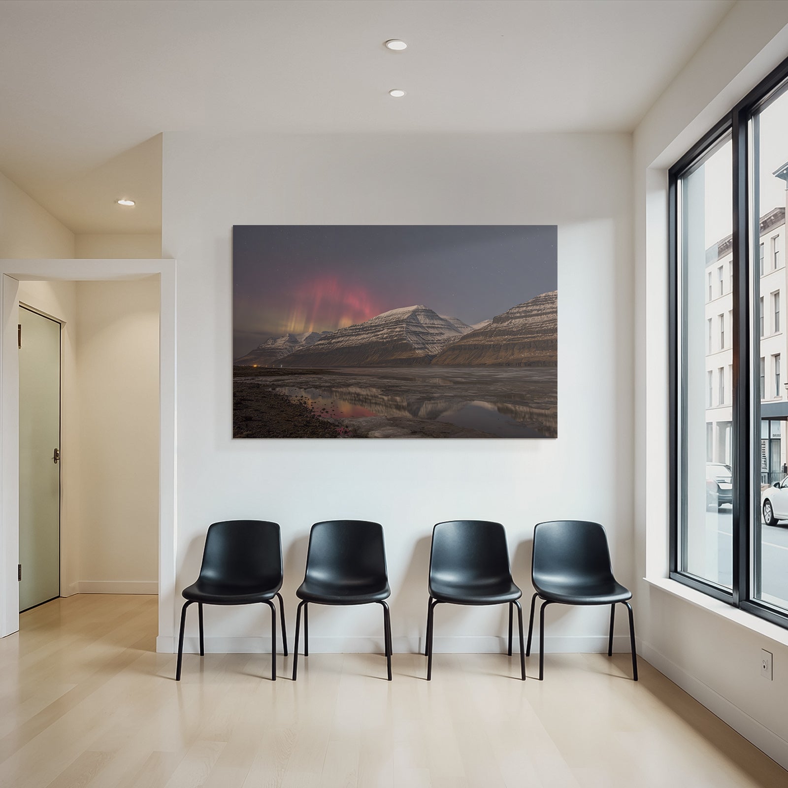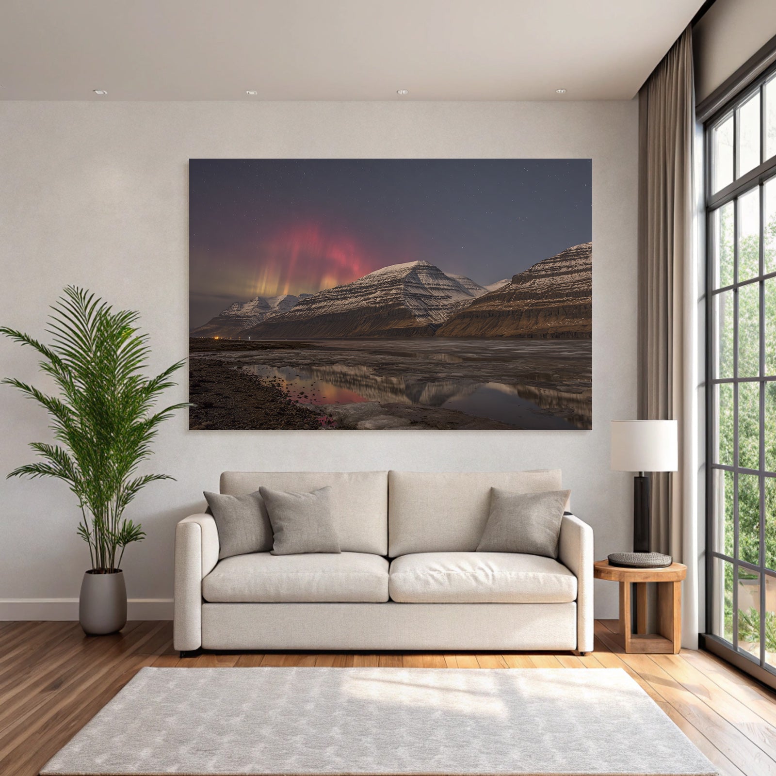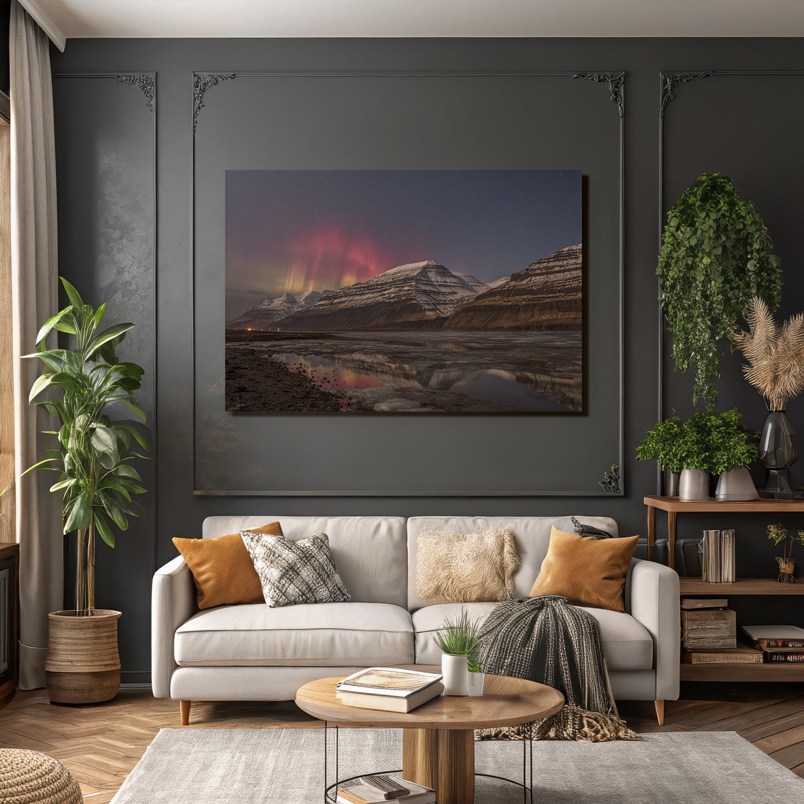 Ein einzigartiges Kunstwerk der Produktlinie FameFrame™ mit dem Titel „Polarlicht Schneebedeckte Berge Und Aurora Reflexion Im Nacht Himmel“, im Stil Fjorde und Gletscher.