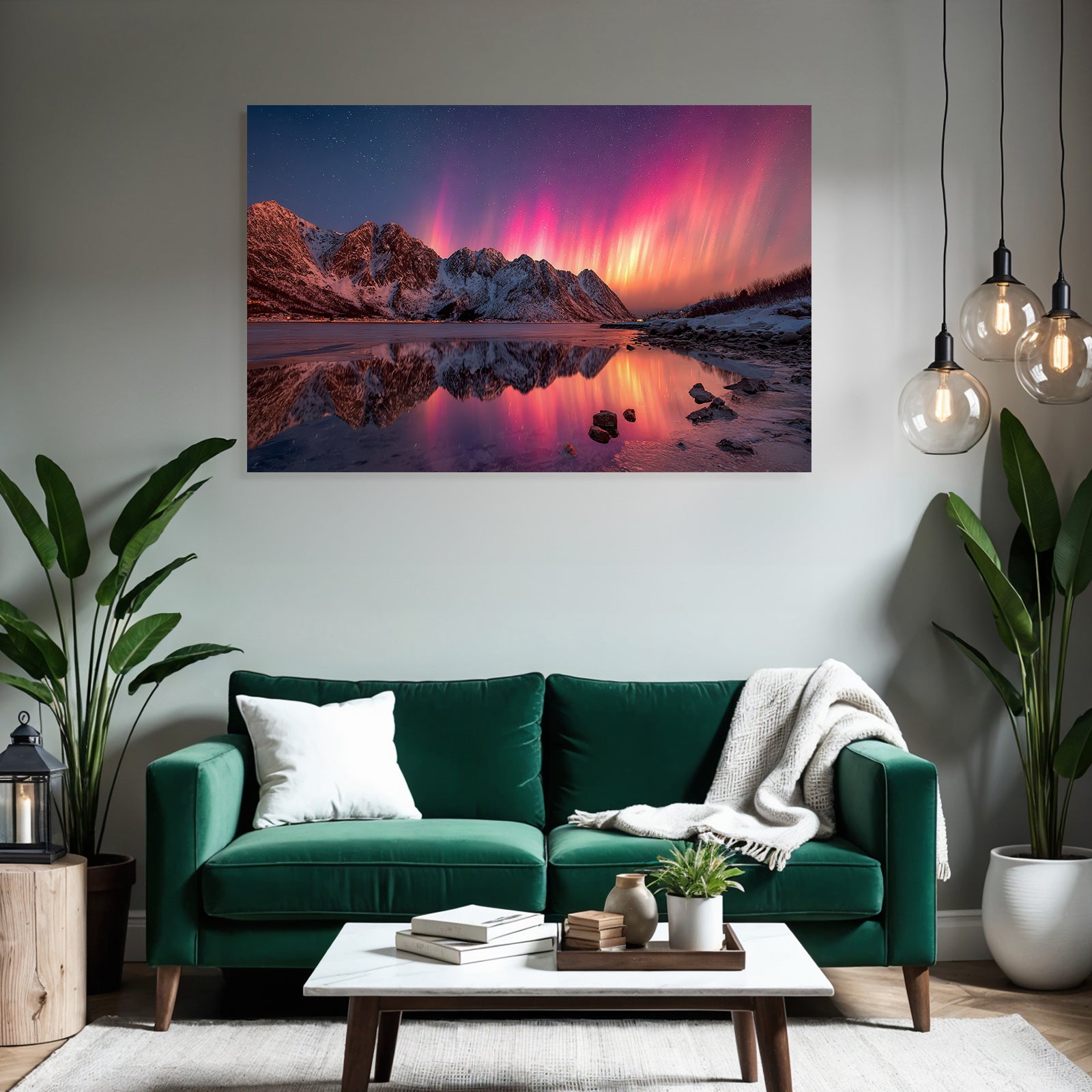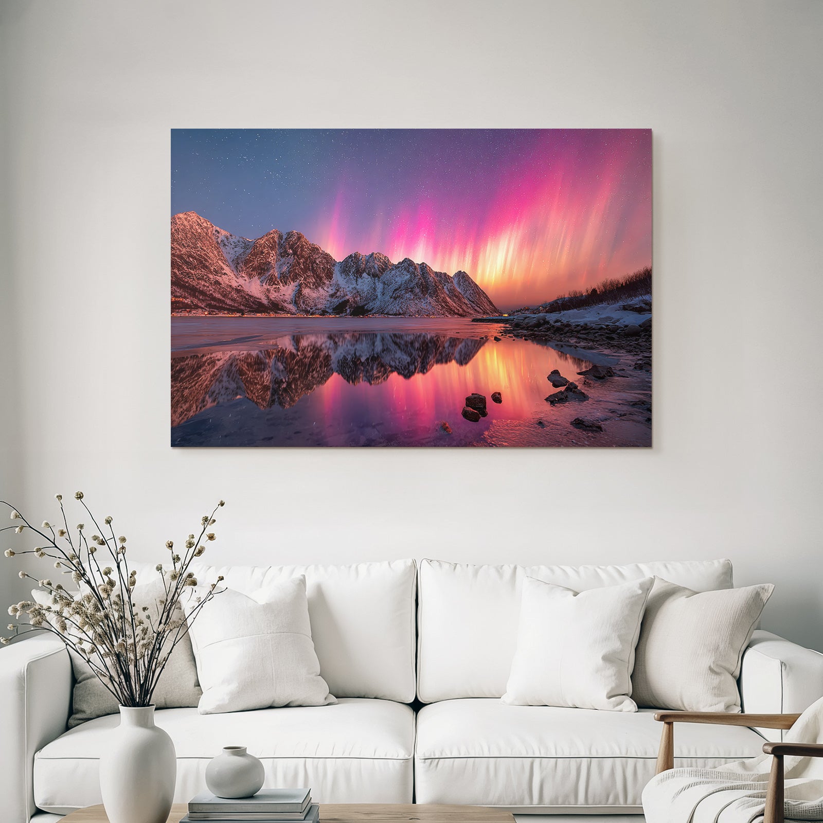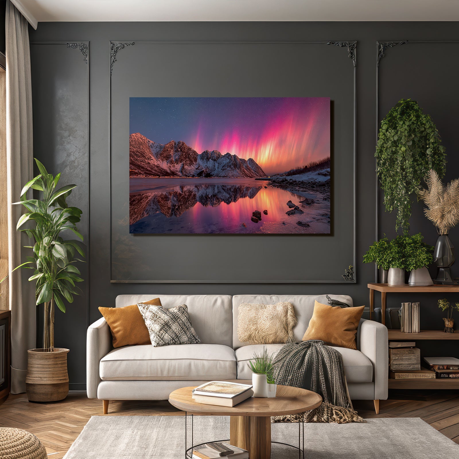 Ein Statement für Individualität: „Polarlicht Schneebedeckte Berge Unter Nordlichter Und Reflektierendes Wasser“ fängt den Geist von Fjorde und Gletscher ein und wird im FameFrame™ zu Ihrem ganz persönlichen Kunst-Highlight.