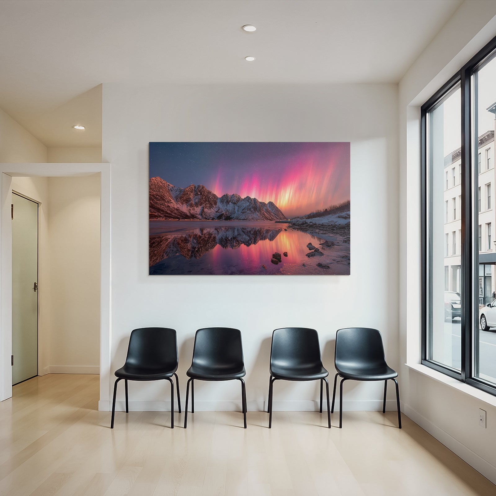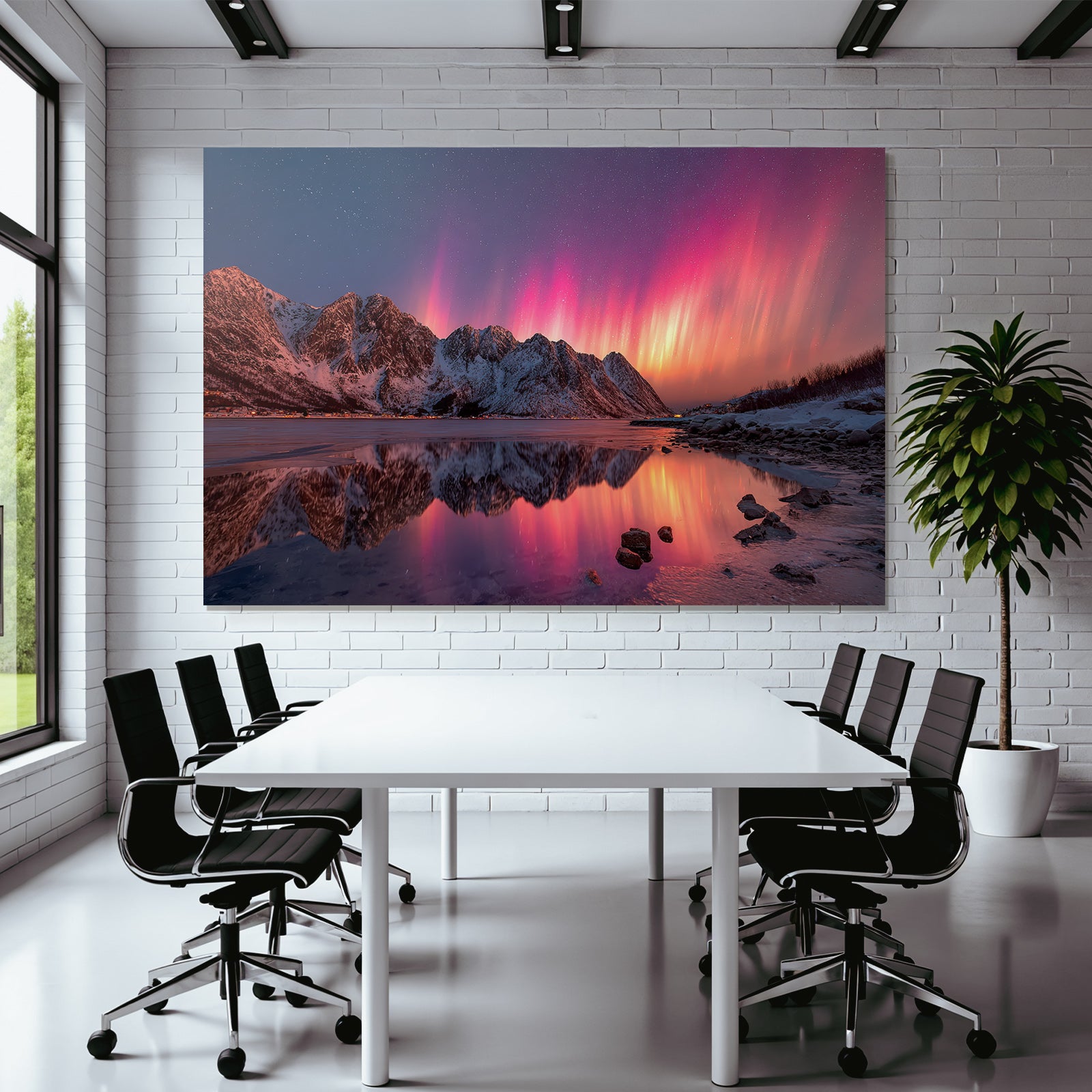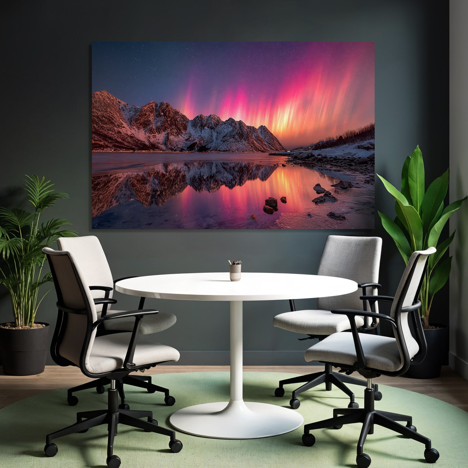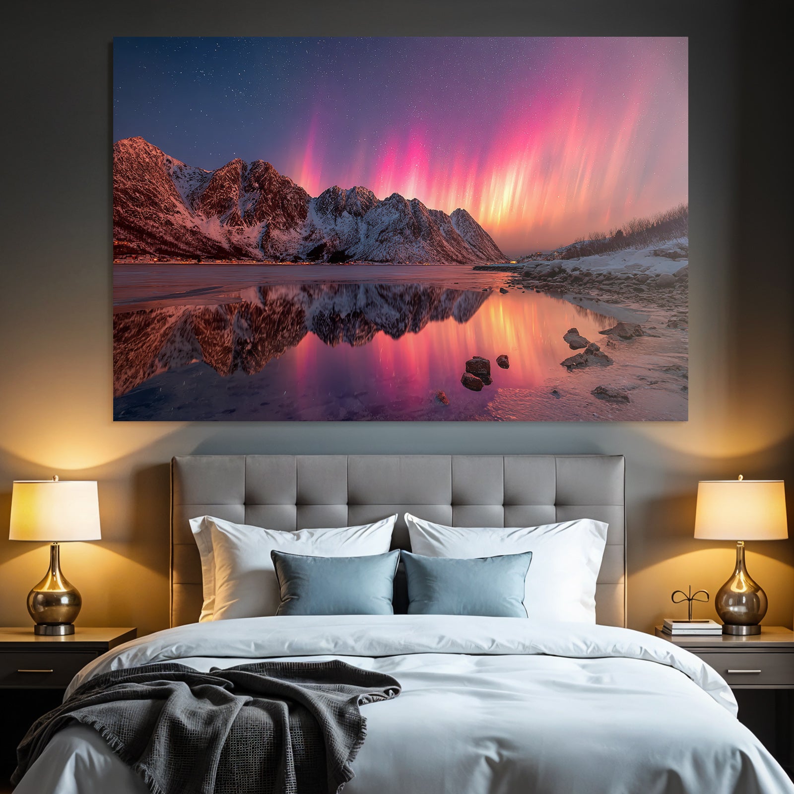 Ein Statement für Individualität: „Polarlicht Schneebedeckte Berge Unter Nordlichter Und Reflektierendes Wasser“ fängt den Geist von Fjorde und Gletscher ein und wird im FameFrame™ zu Ihrem ganz persönlichen Kunst-Highlight.