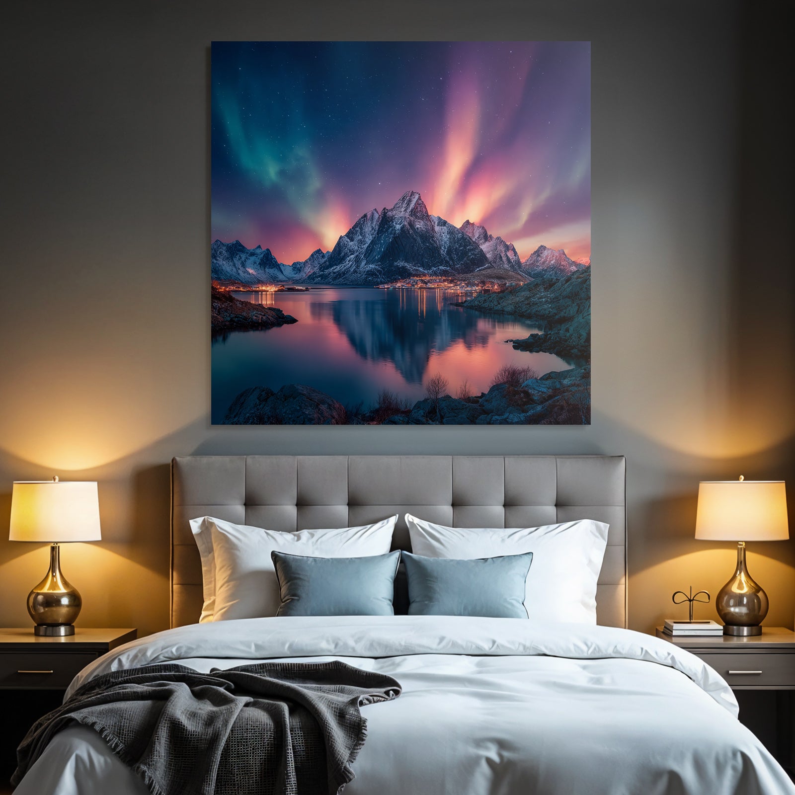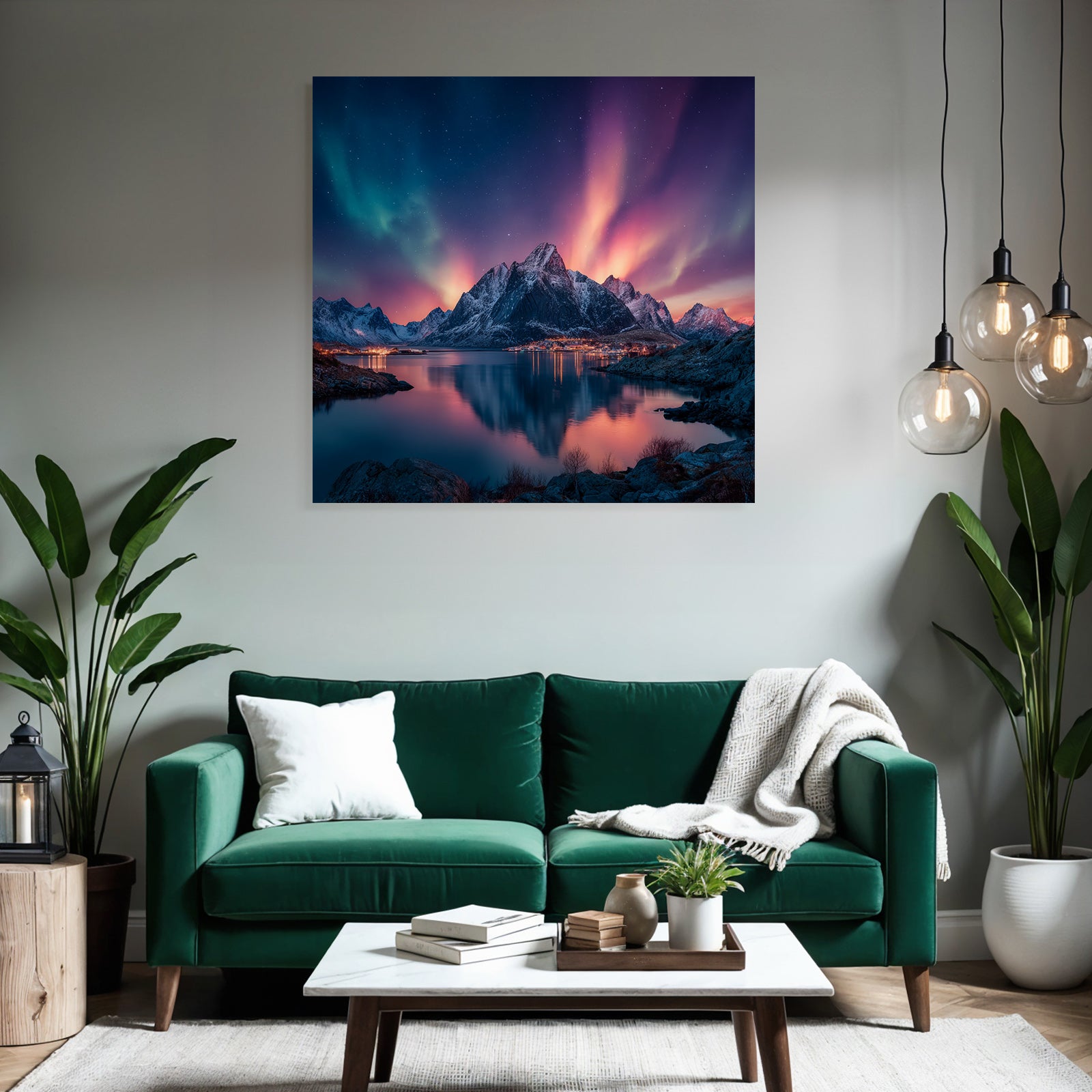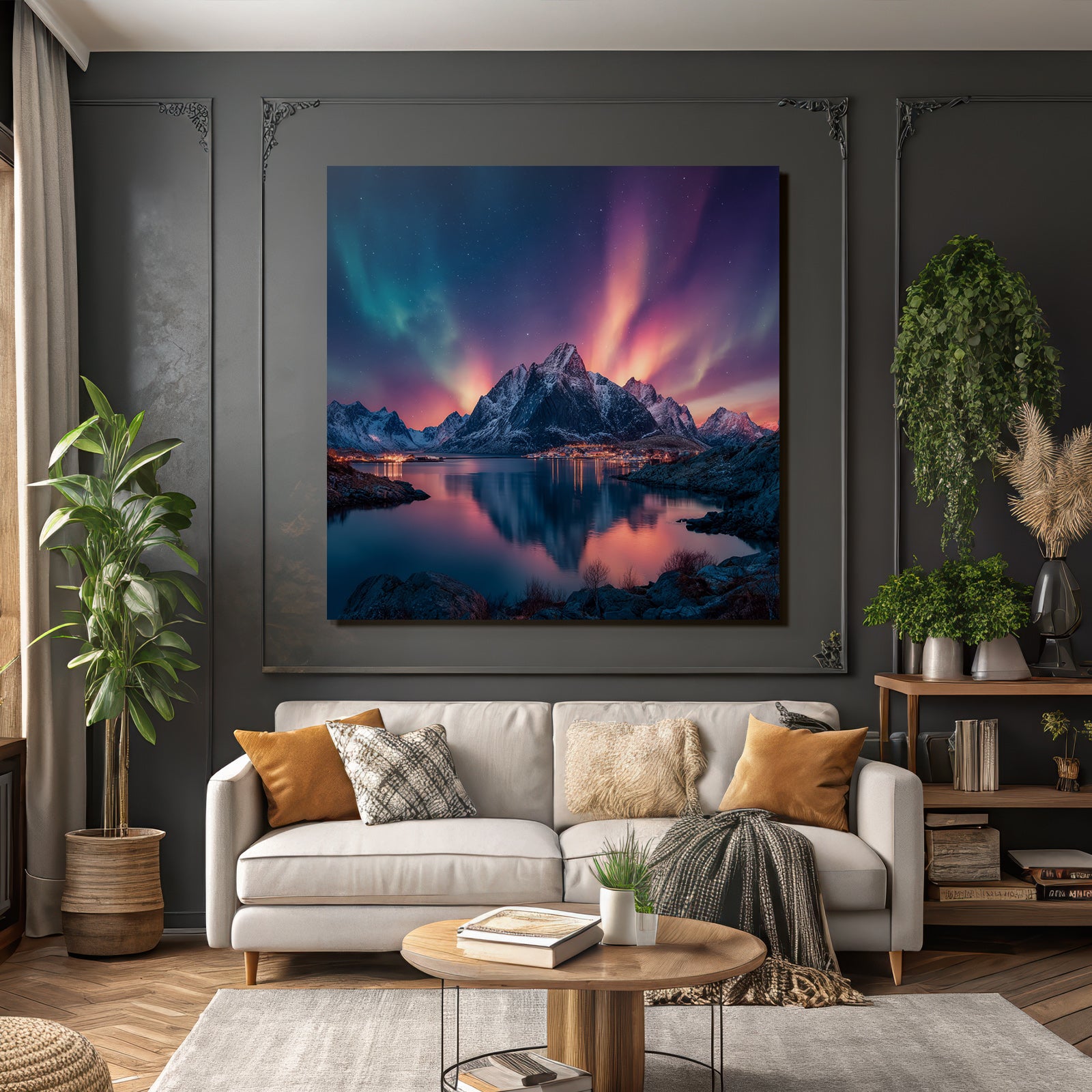 Entdecken Sie die Facetten von „Polarlicht Schneebedeckte Bergen Mit Sternenhimmel Und Auroren Reflektiert Im Wasser“. Dieses Motiv im Look von Fjorde und Gletscher ist eine Zierde für jeden Raum und wird im FameFrame™ elegant inszeniert.