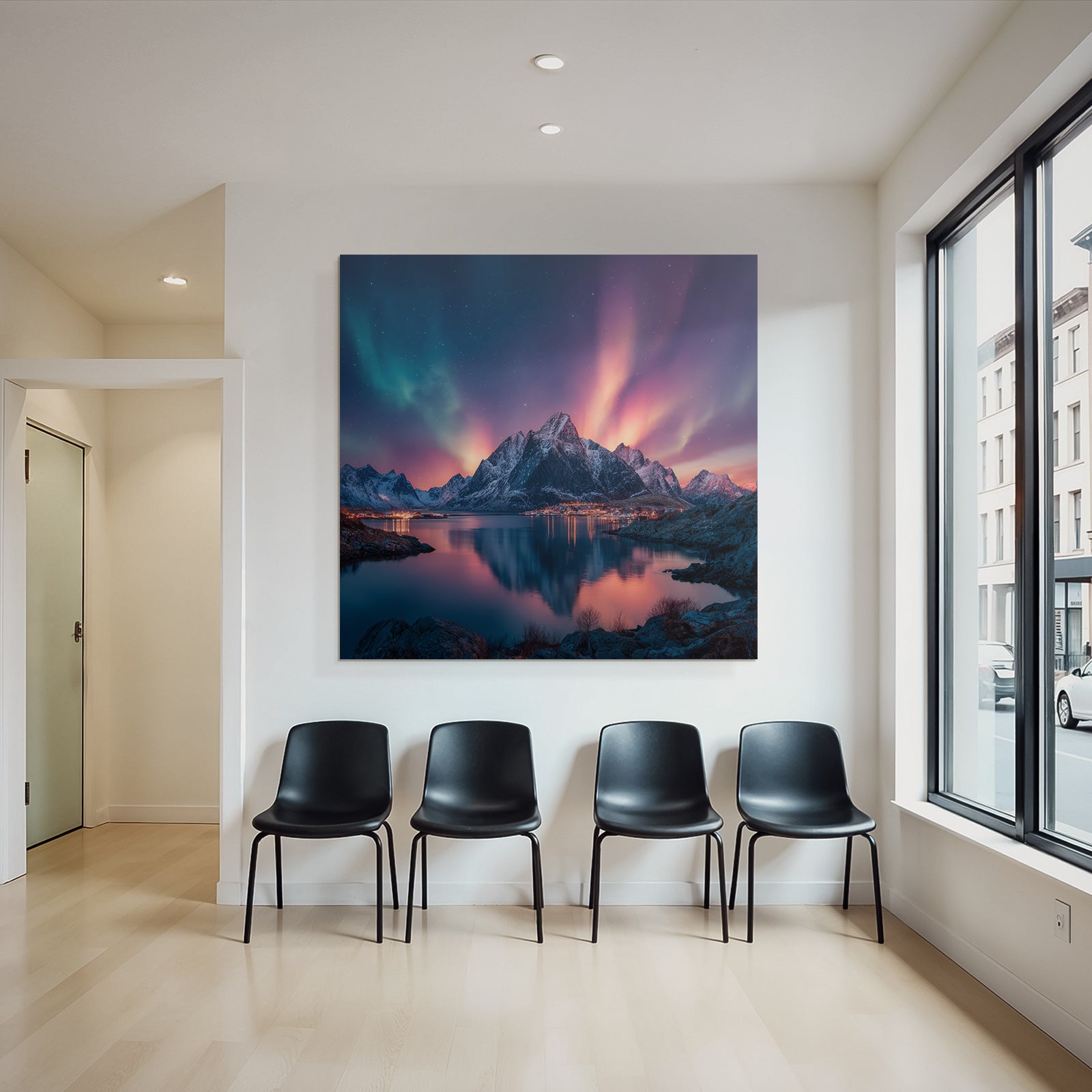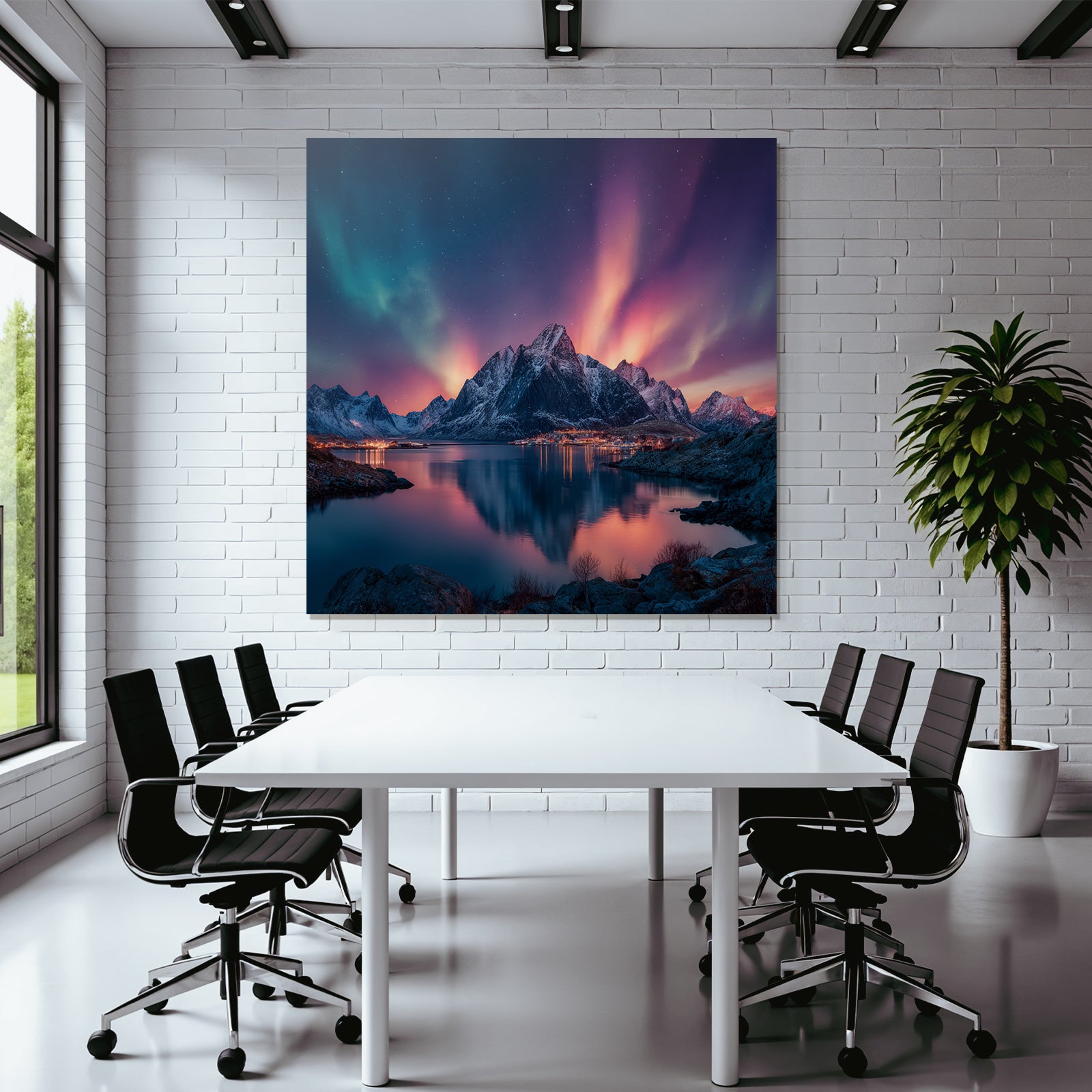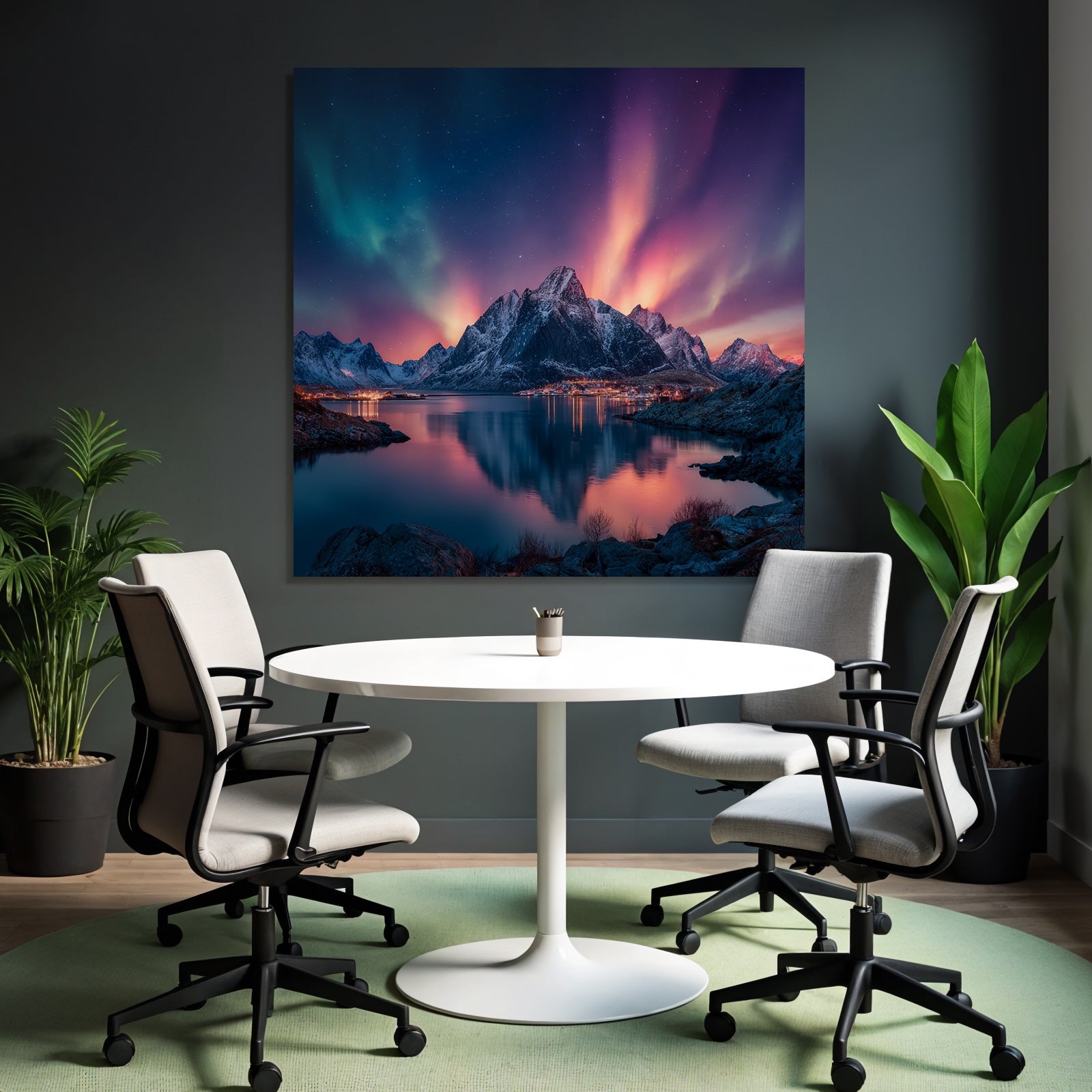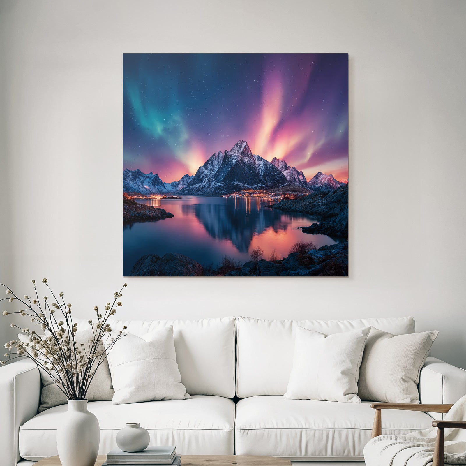 Entdecken Sie die Facetten von „Polarlicht Schneebedeckte Bergen Mit Sternenhimmel Und Auroren Reflektiert Im Wasser“. Dieses Motiv im Look von Fjorde und Gletscher ist eine Zierde für jeden Raum und wird im FameFrame™ elegant inszeniert.