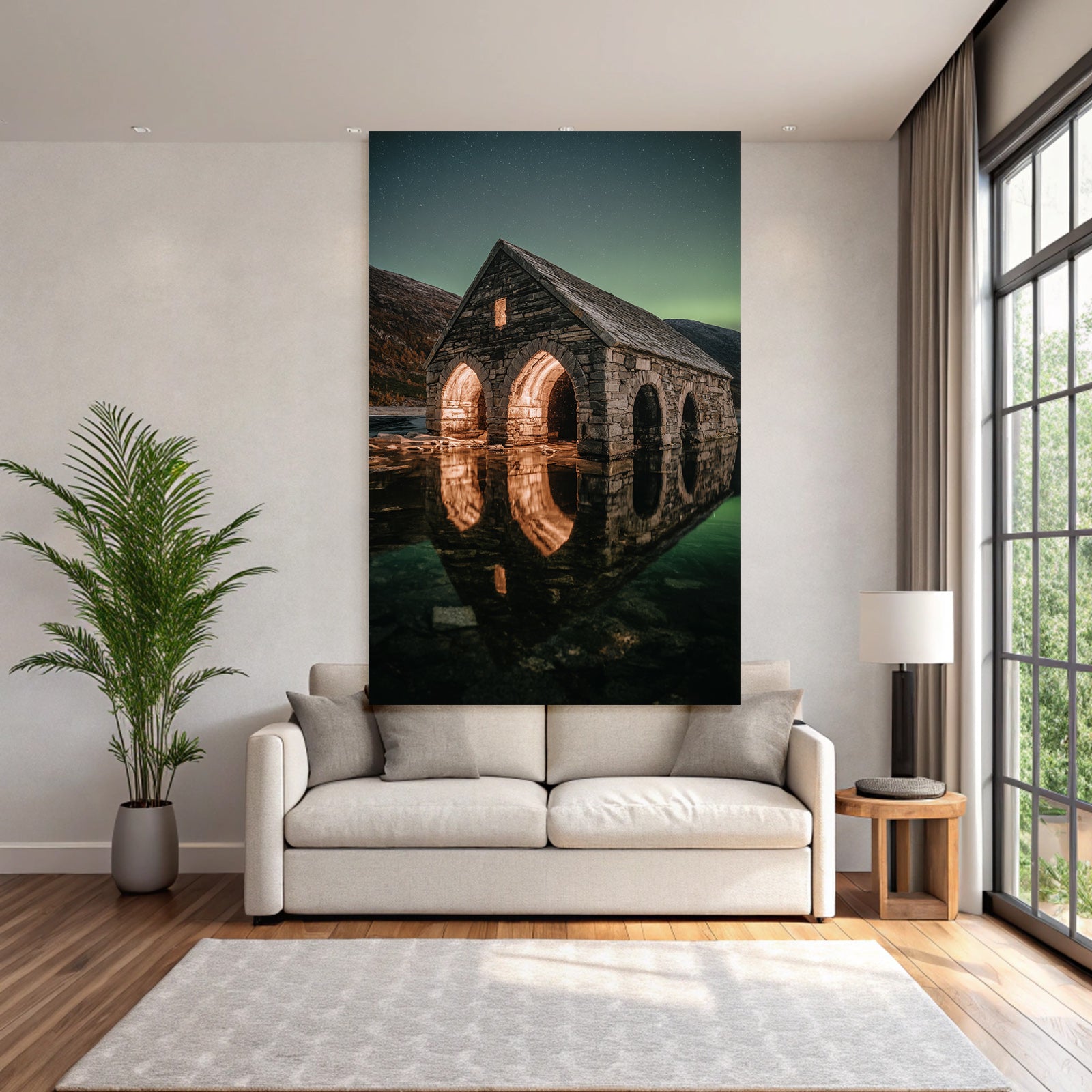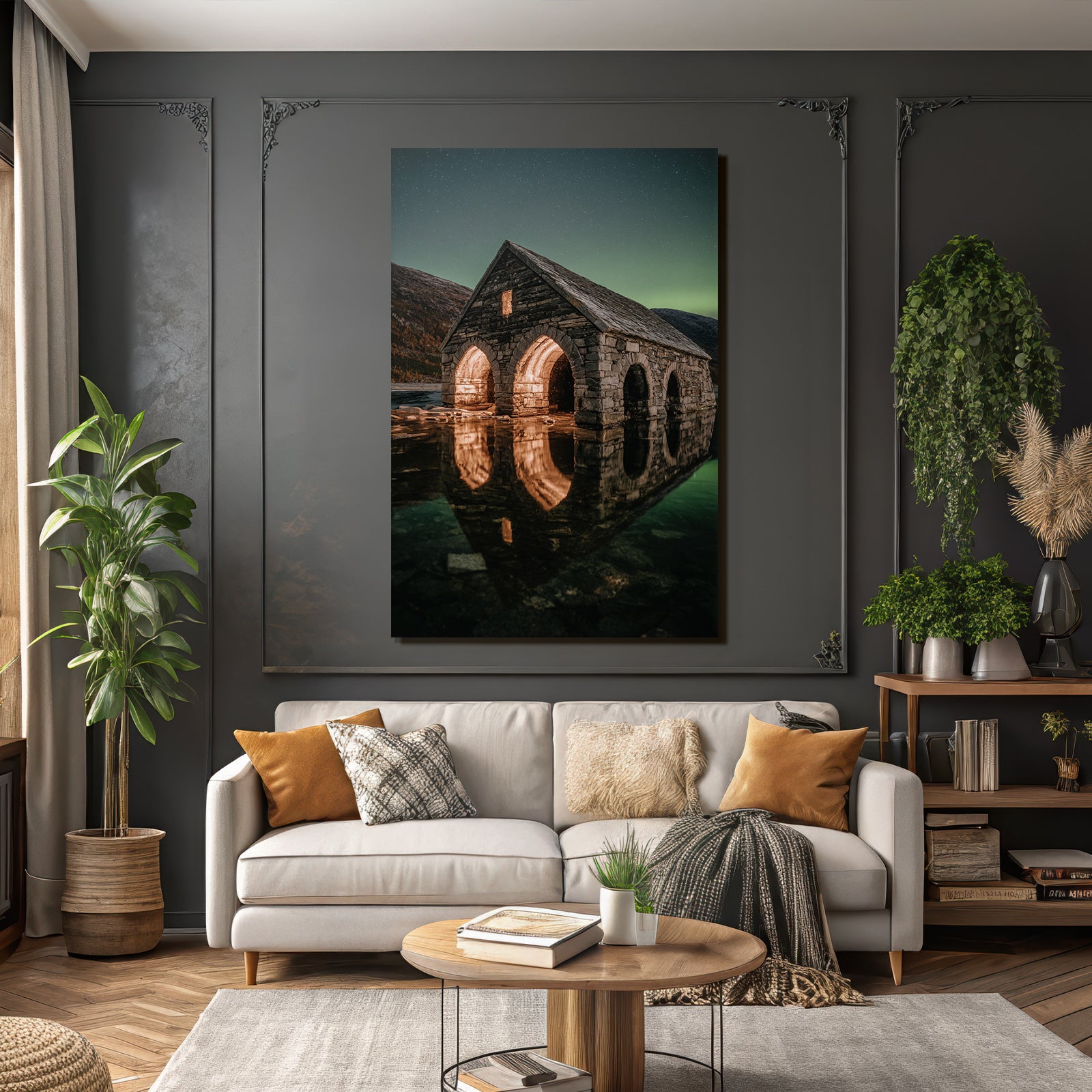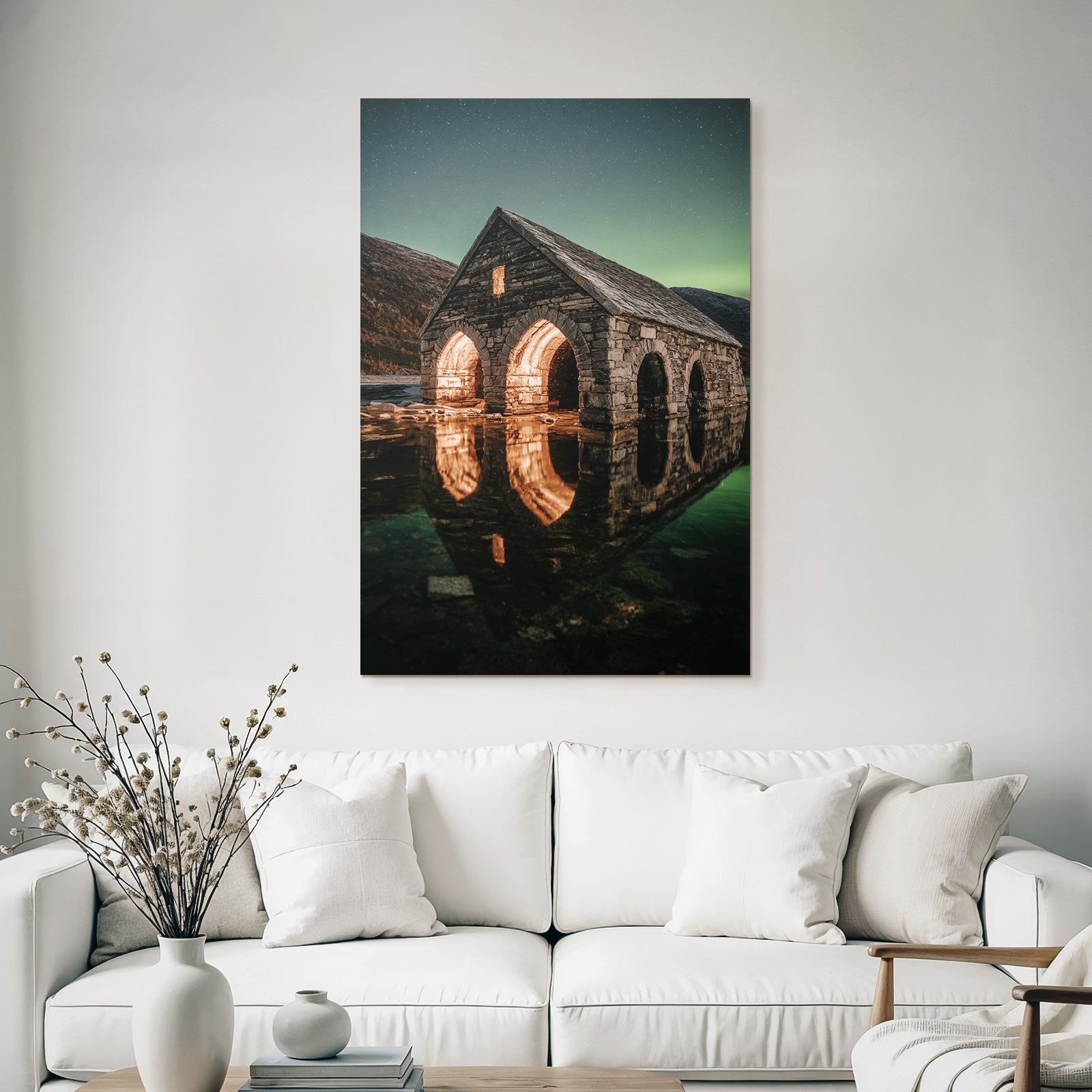 Verschönere Dein Zuhause mit diesem Werk im Stil Fjorde und Gletscher. Der Titel „Polarlicht Steinbau Im Wasser Nachtsternhimmel Nordlichter Berglandschaft“ kommt im hochwertigen FameFrame™ perfekt zur Geltung.