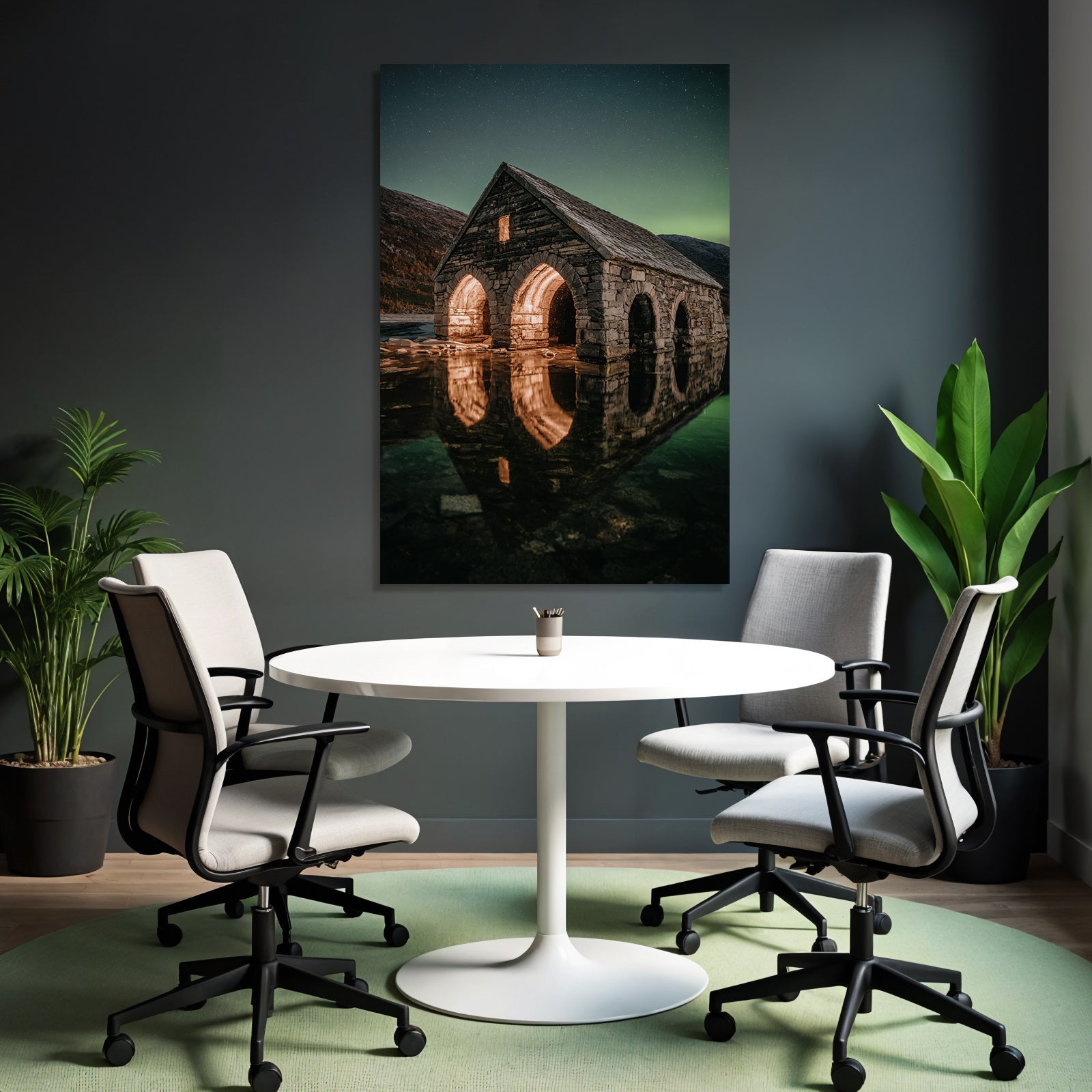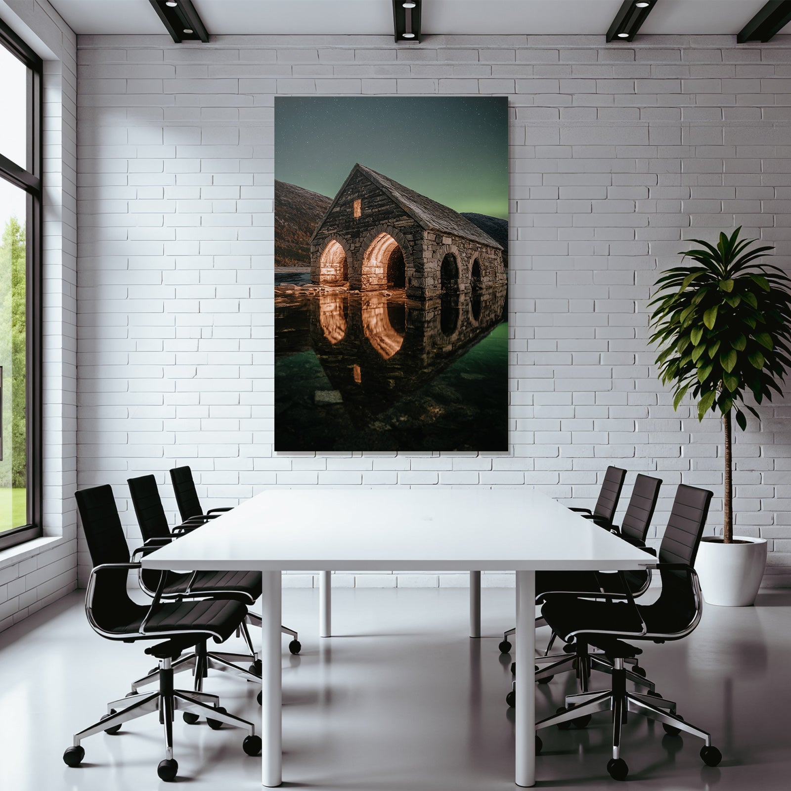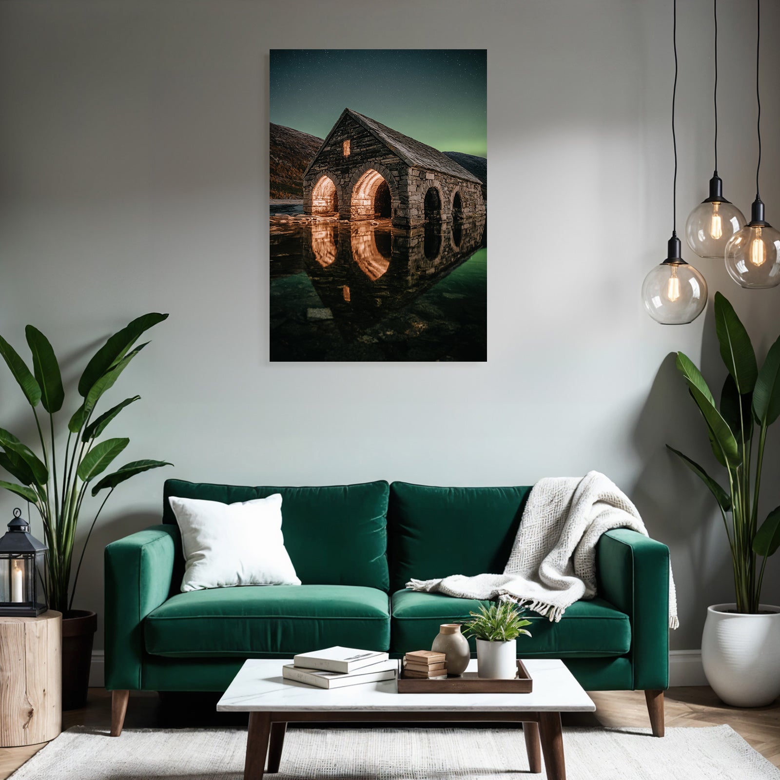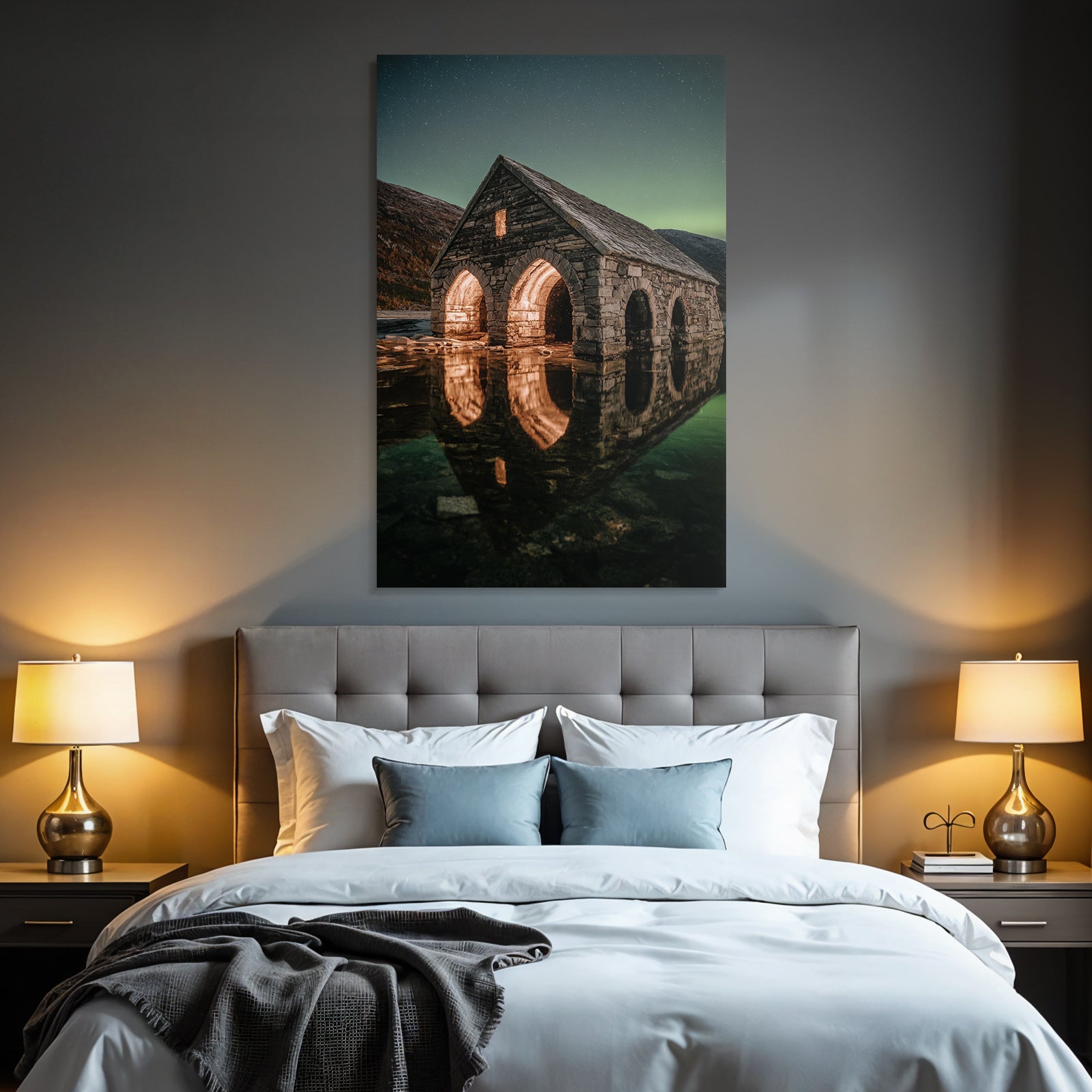 Verschönere Dein Zuhause mit diesem Werk im Stil Fjorde und Gletscher. Der Titel „Polarlicht Steinbau Im Wasser Nachtsternhimmel Nordlichter Berglandschaft“ kommt im hochwertigen FameFrame™ perfekt zur Geltung.