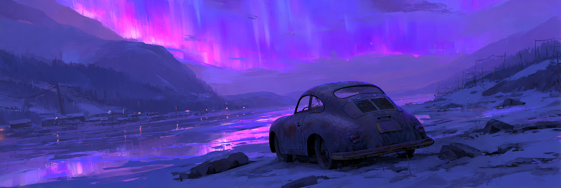 Setzen Sie auf zeitlose Ästhetik. Das Werk „Polarlicht Vergessenes Auto Im Schneebedeckten Landscape Mit Auroraborealis Himmel“ im Stil Fjorde und Gletscher ist eine Investition in Ihr Ambiente, die dank des austauschbaren FameFrame™ immer modern bleibt.