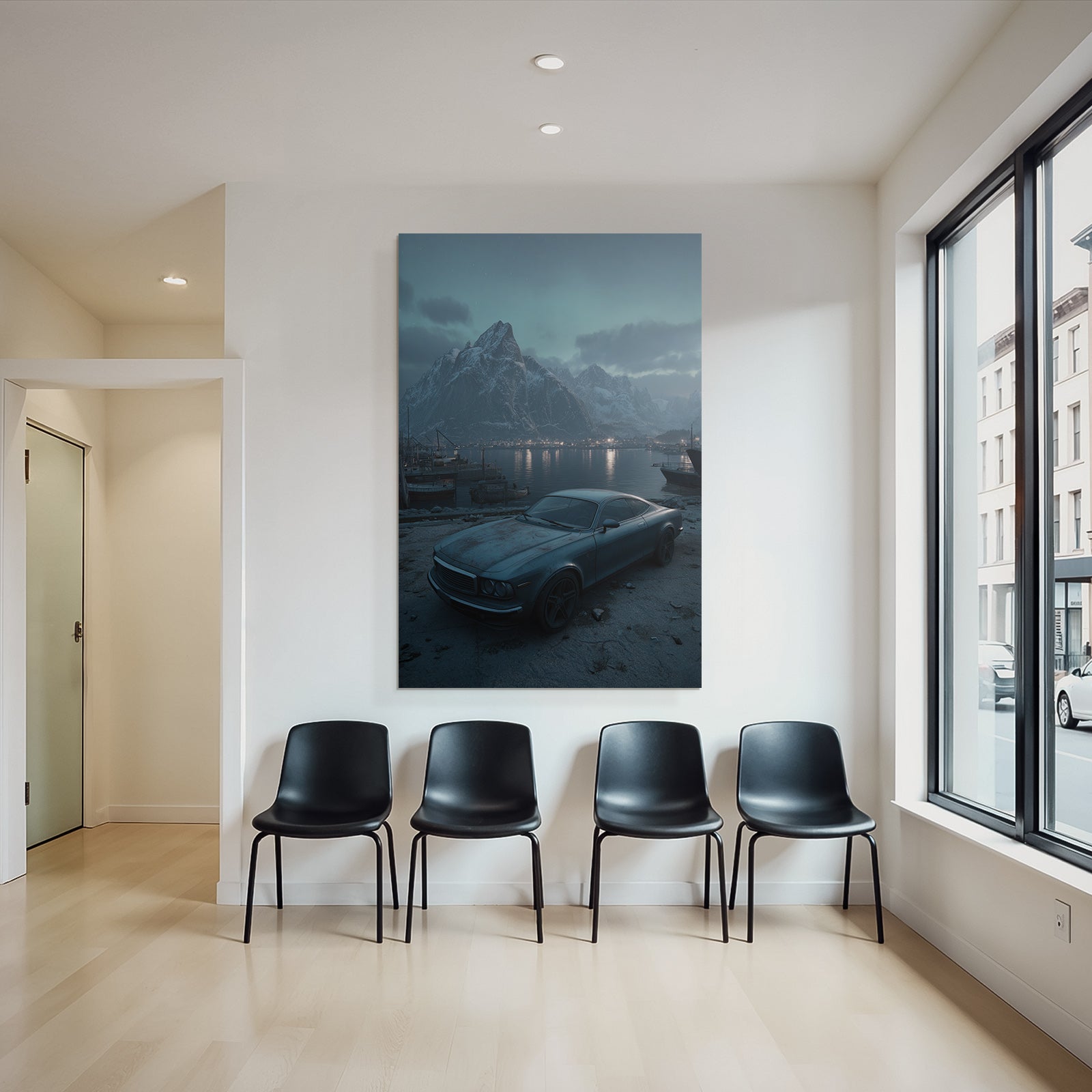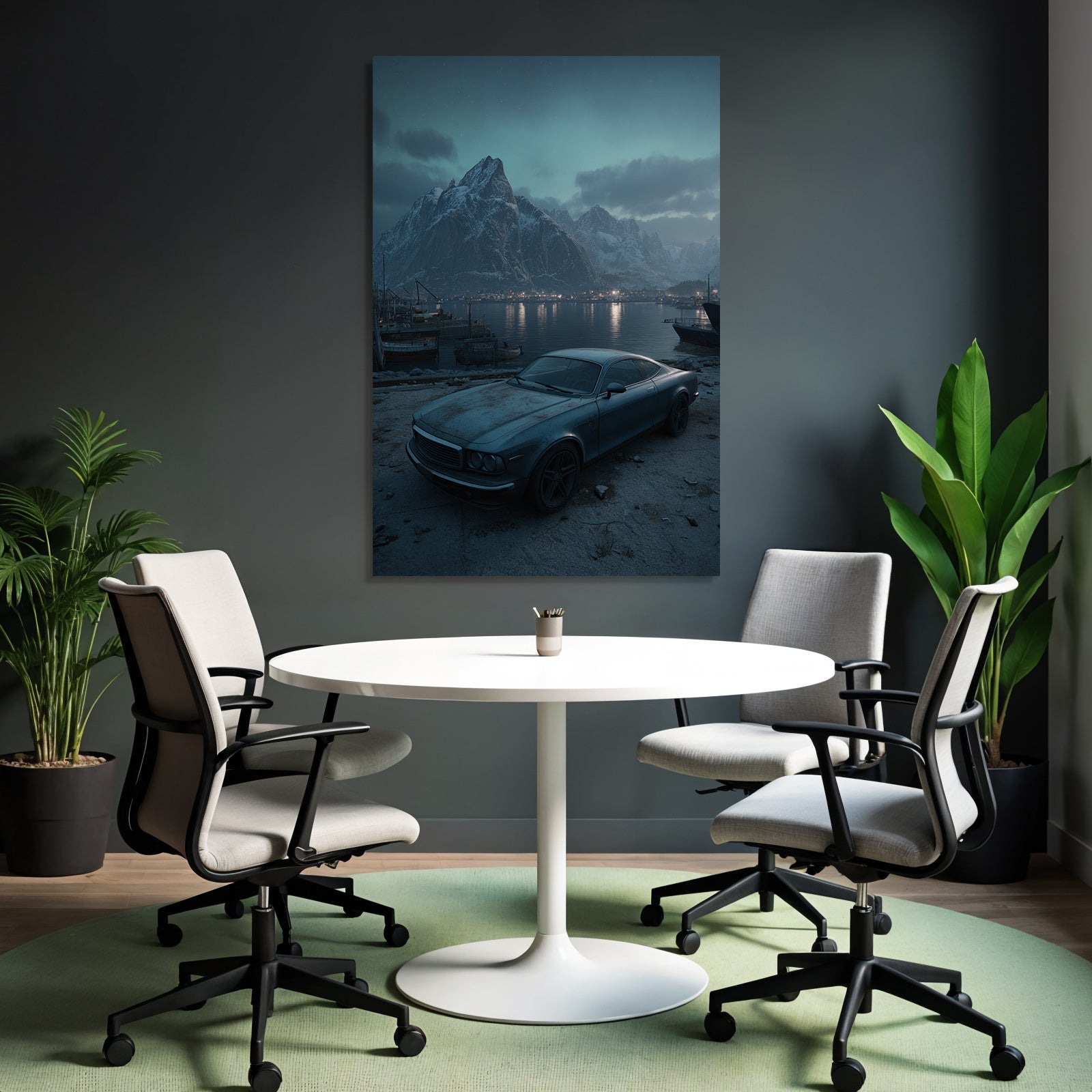 Ob für eine exklusive Boutique, ein modernes Restaurant oder Ihr Esszimmer„Polarlicht Vintage Auto Hafen Hintergrund Schneebedeckte Berge Sonnenuntergang“ im Fjorde und Gletscher-Design schafft im FameFrame™ ein unvergessliches Ambiente.