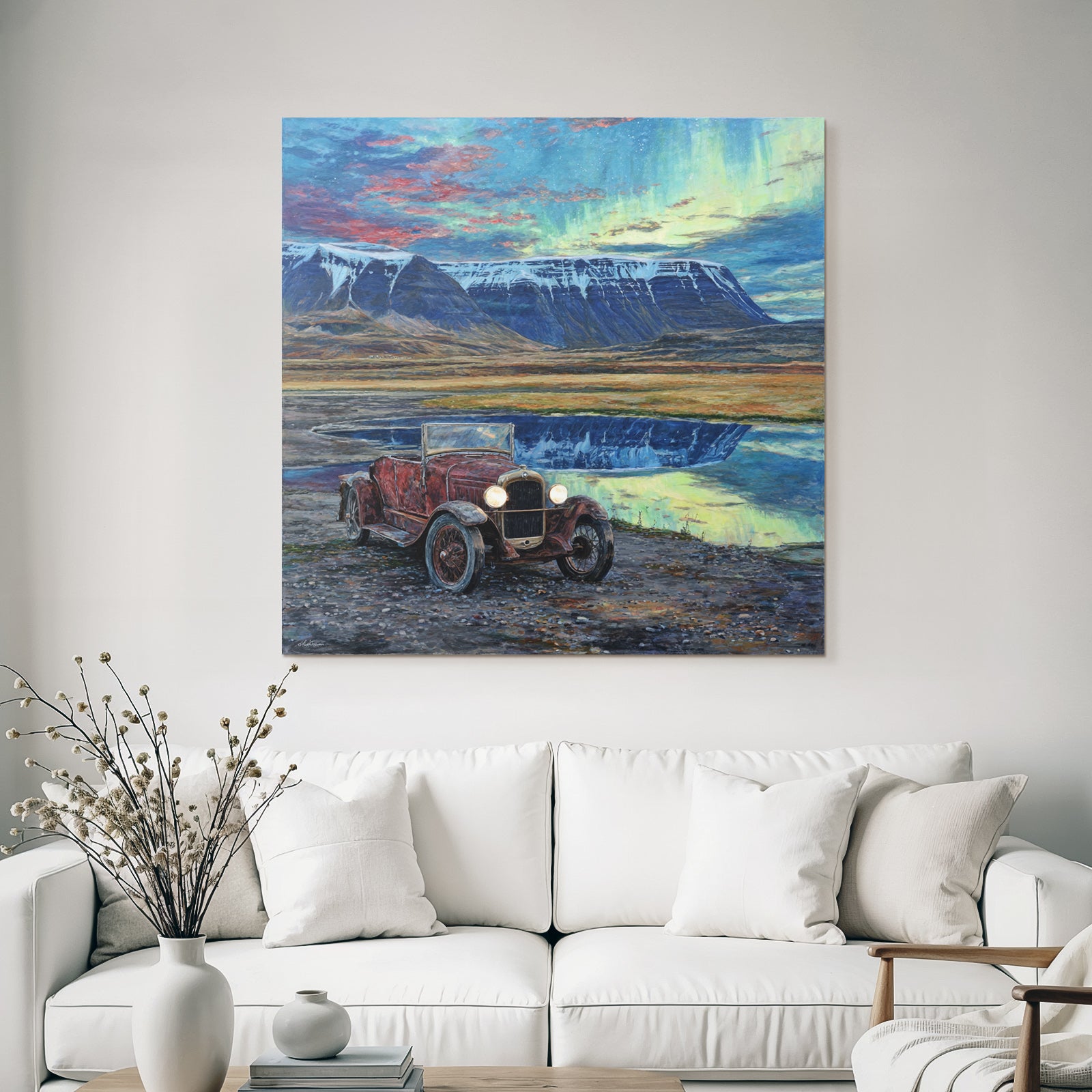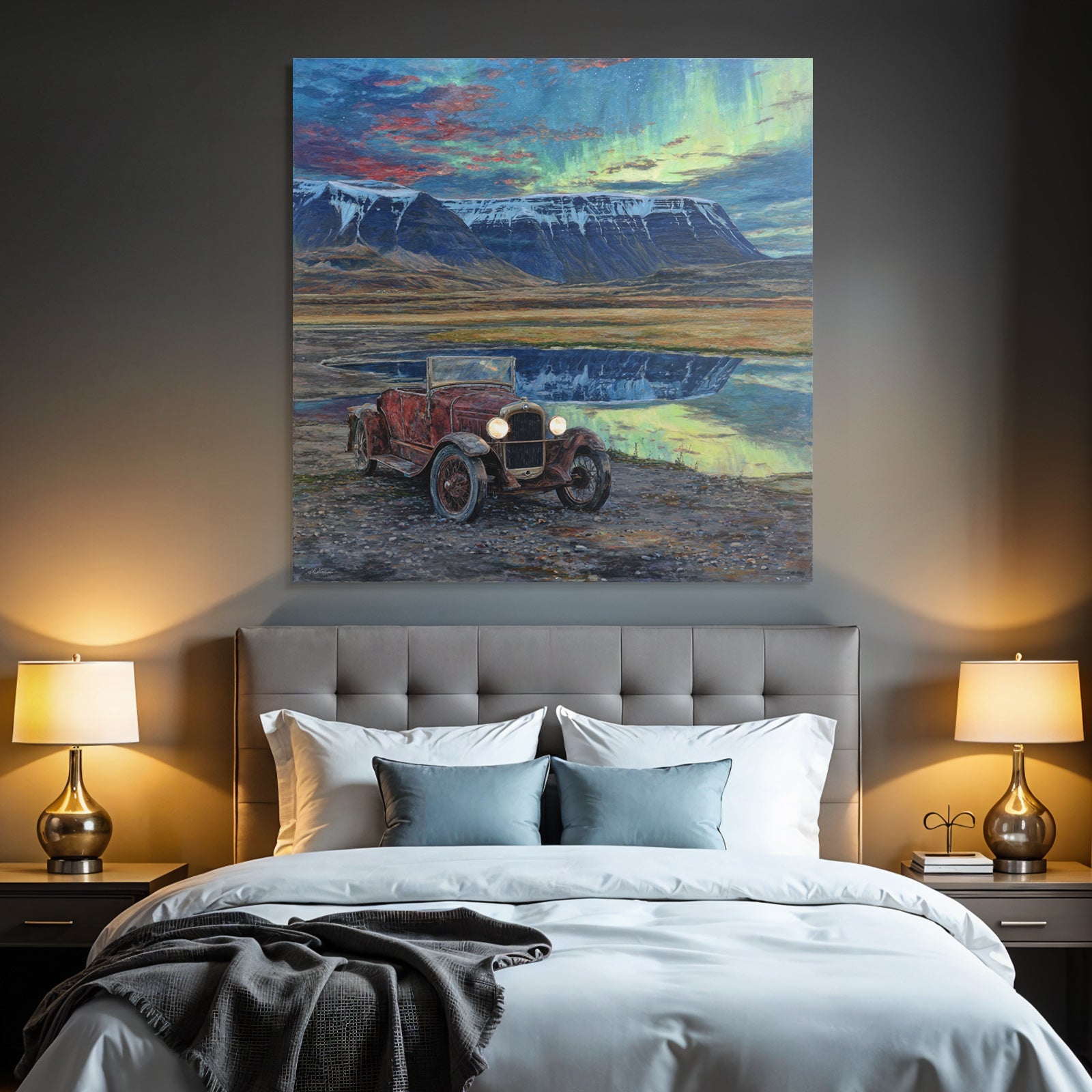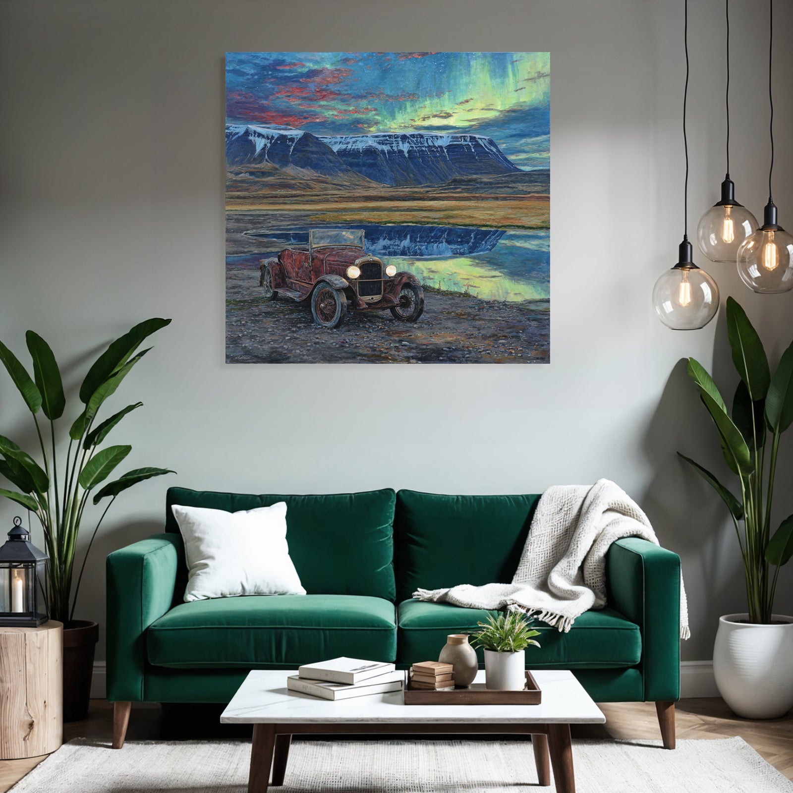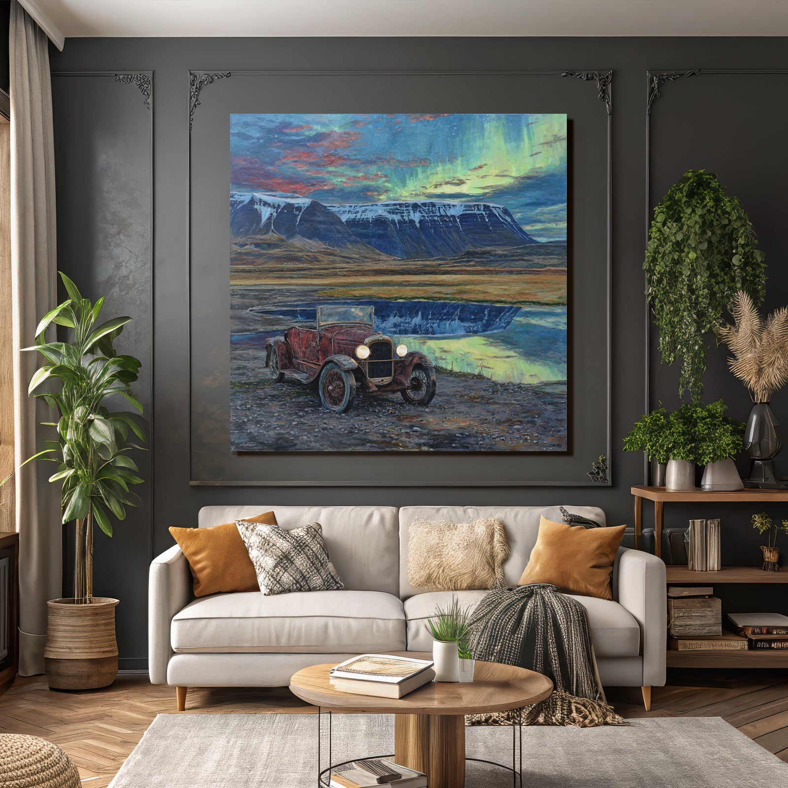 Ein Stück Fjorde und Gletscher für Deine vier Wände: Das Werk „Polarlicht Vintage Auto In Natur Mit Bergen Und Seen Reflection“ im hochwertigen FameFrame™ bringt kreative Energie in jeden Raum.