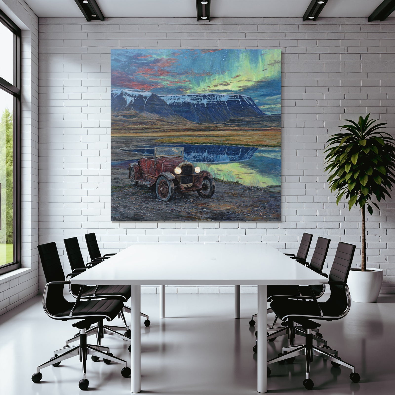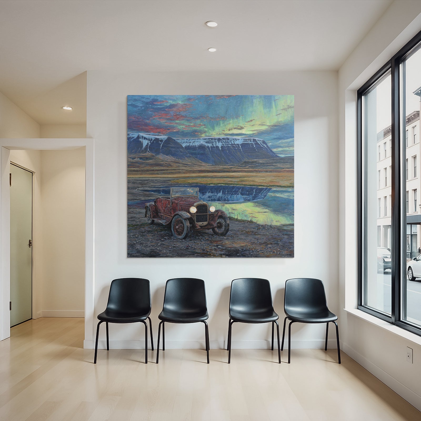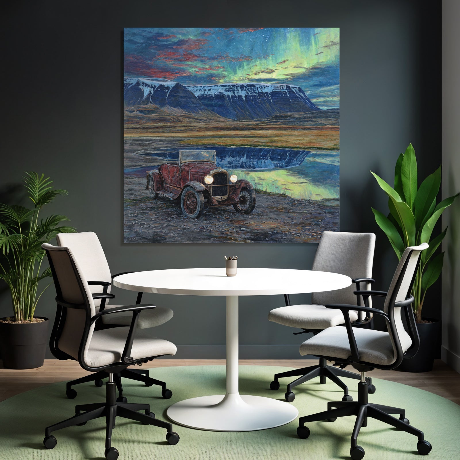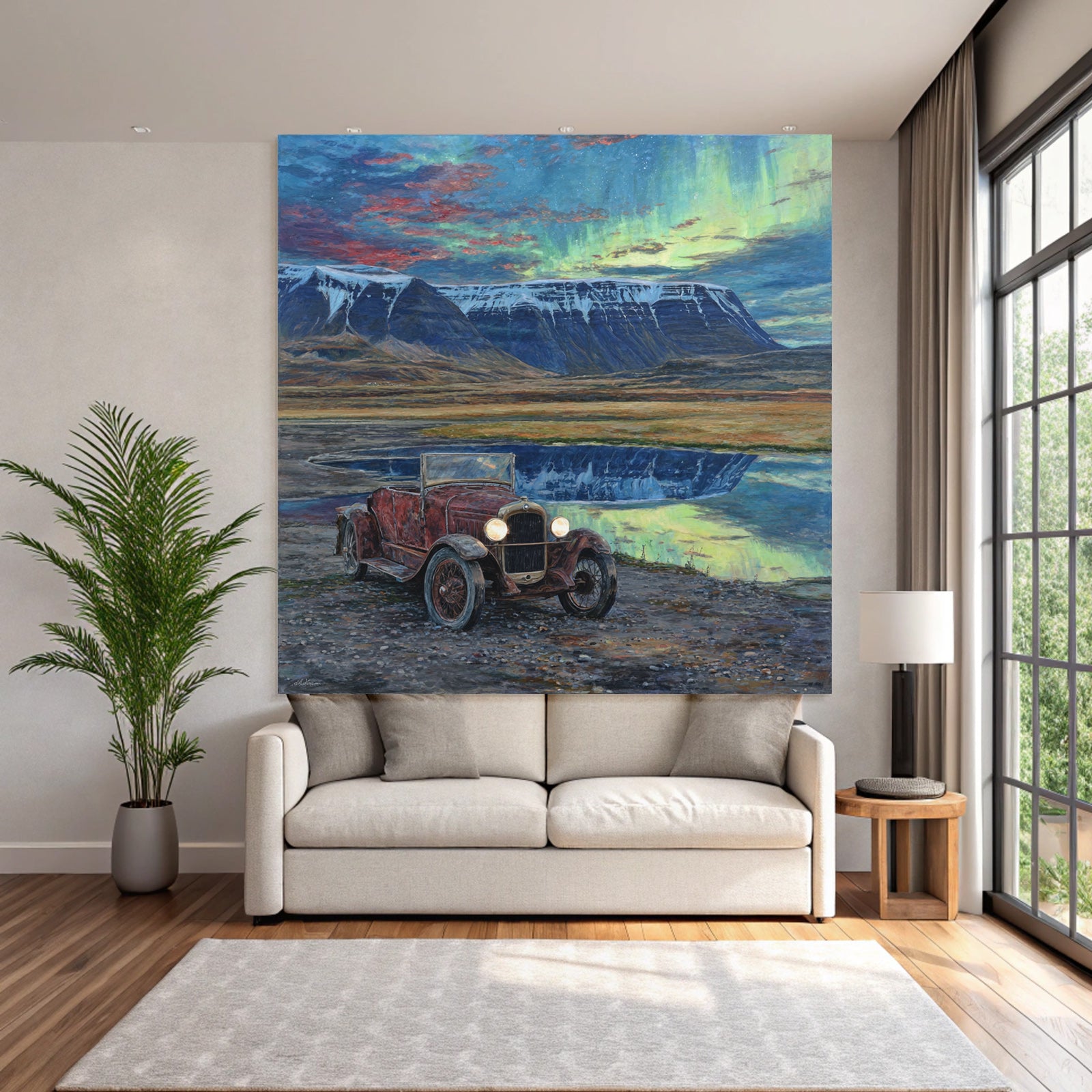 Ein Stück Fjorde und Gletscher für Deine vier Wände: Das Werk „Polarlicht Vintage Auto In Natur Mit Bergen Und Seen Reflection“ im hochwertigen FameFrame™ bringt kreative Energie in jeden Raum.