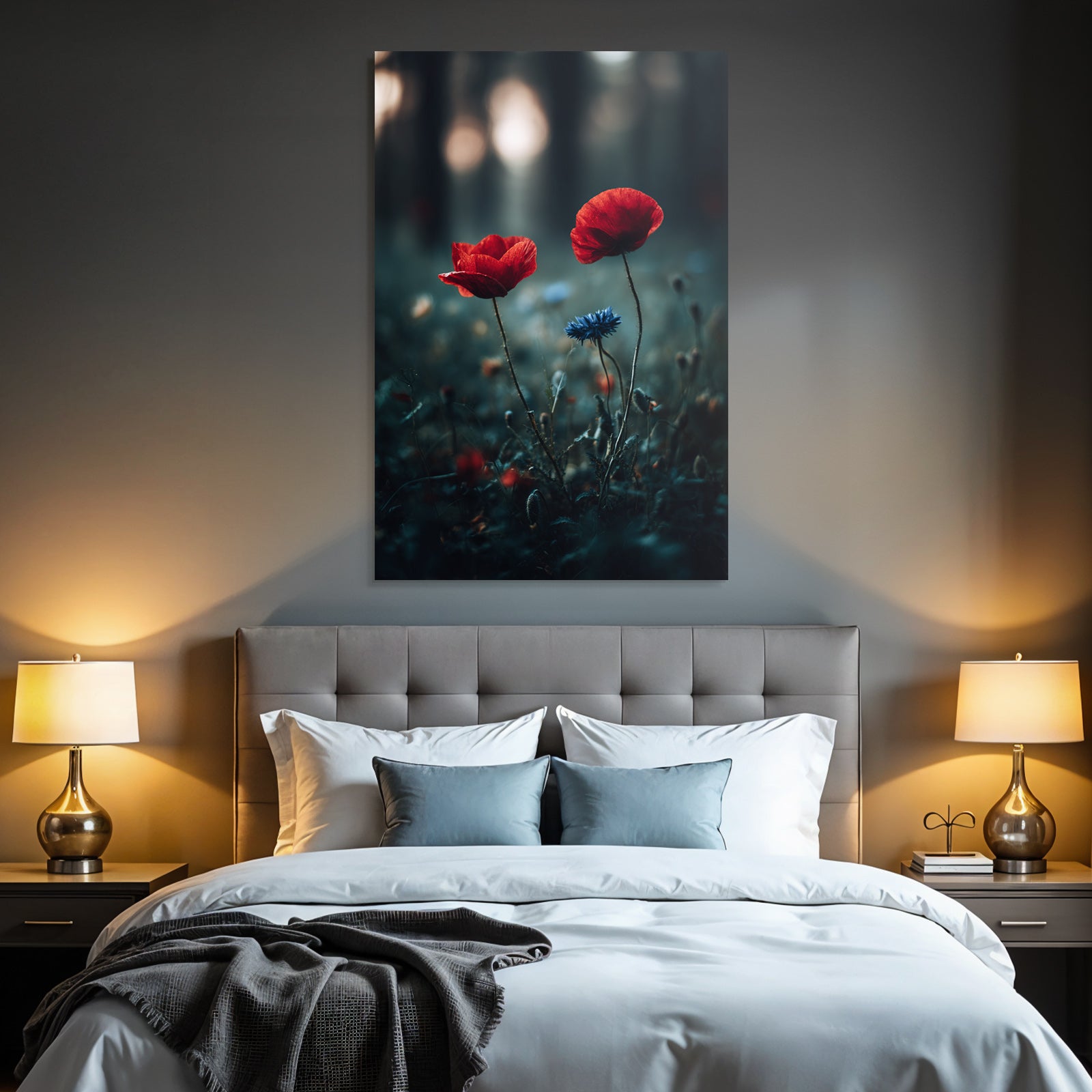 Ein Highlight für Wohnzimmer, Studio oder Empfangsbereich: „Rote Mohn Und Blaü Kornblume Im Morgendunst“ bringt den Stil Mohn Pusteblume Kornblume auf Stoff – gespannt im edlen FameFrame.