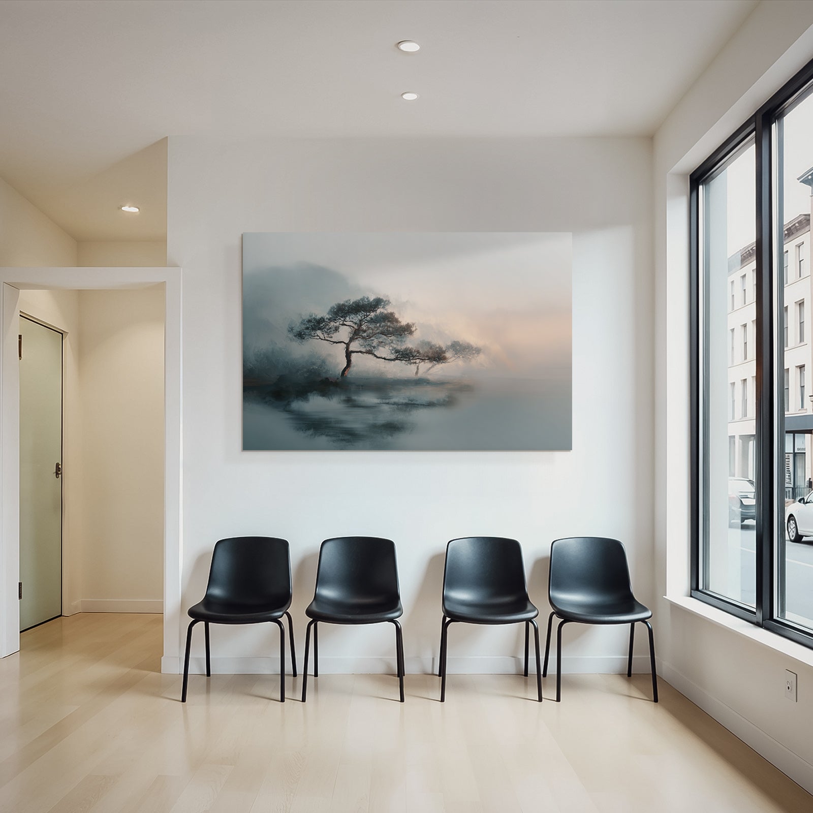 Modern, stilvoll, individuell: „„Ruhige Landschaft Mit Baeumen““ im Stil Japandi überzeugt im hochwertigen FameFrame durch klare Formen und starke Farben.