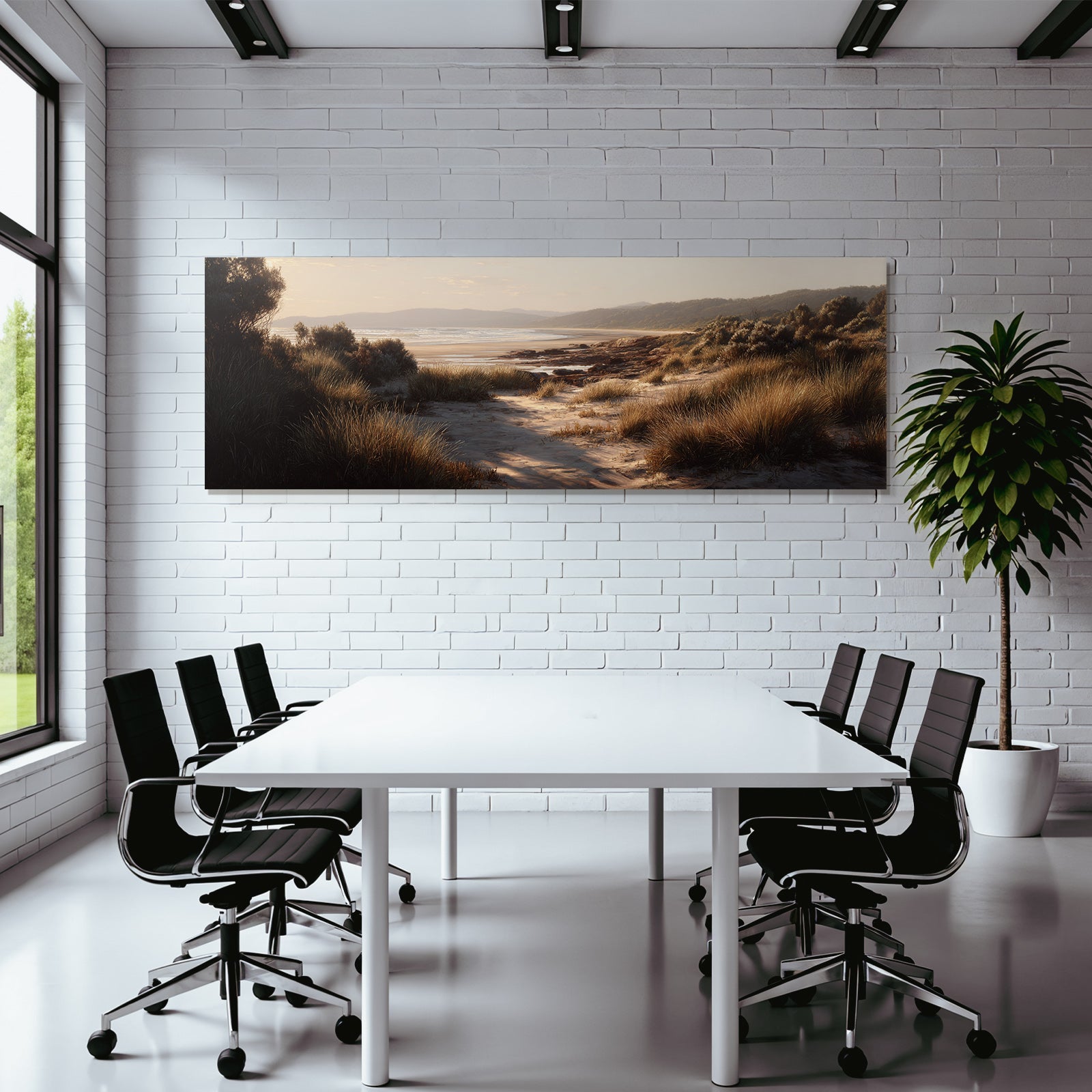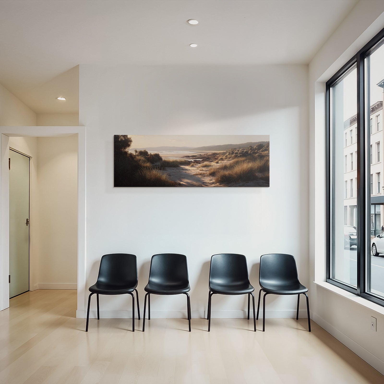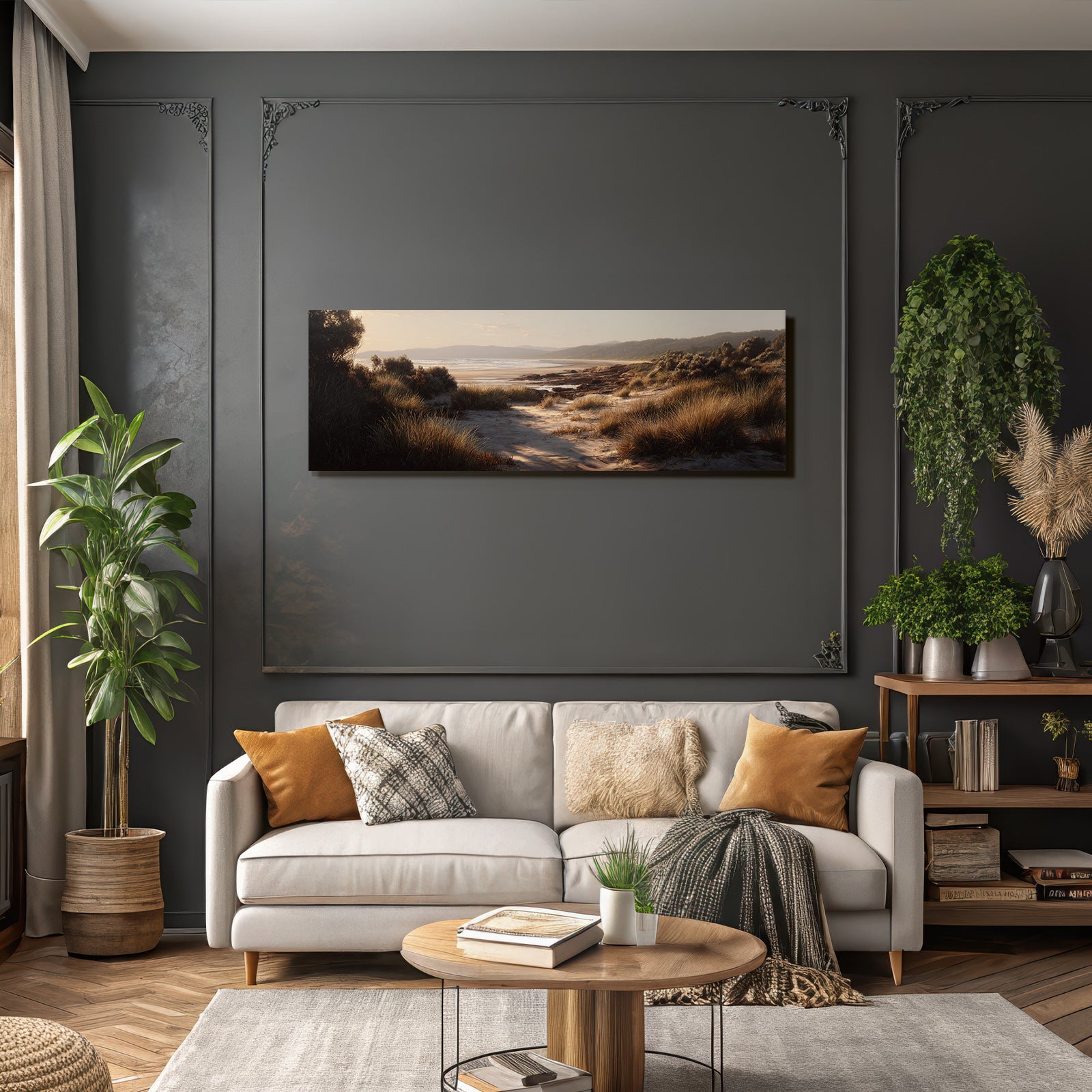 Ein Meisterwerk im Stil Dünen und Heide: „Ruhige Strandlandschaft Mit Gras Und Meer“ fängt die Atmosphäre und die typischen Elemente dieses Stils ein und wird im FameFrame™ zum zeitlosen Hingucker.