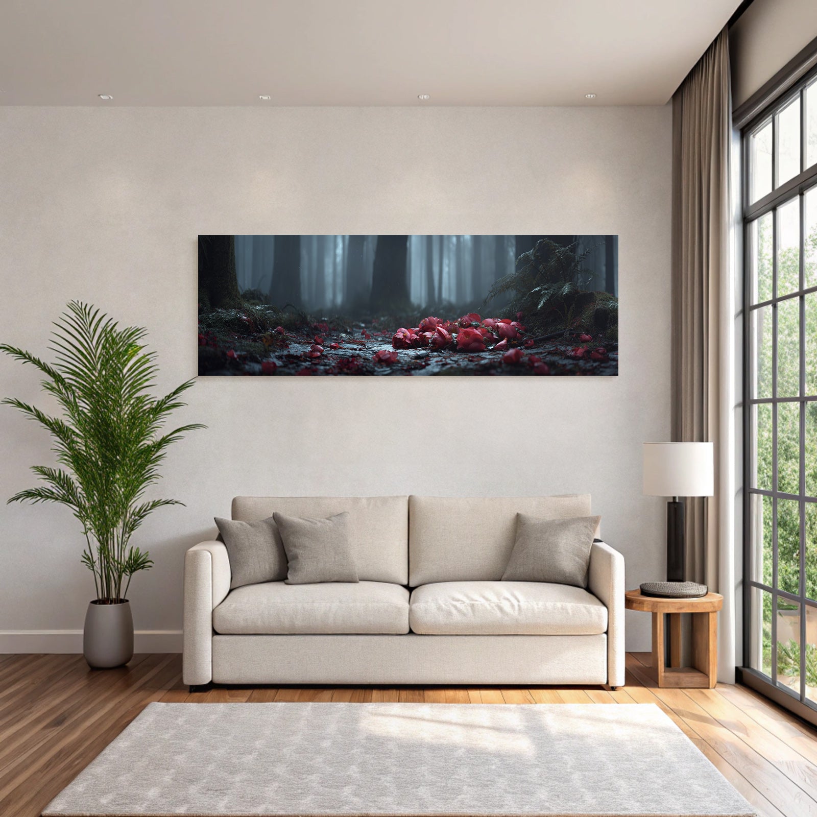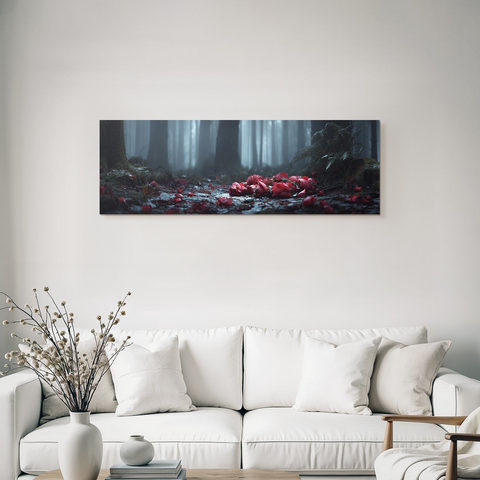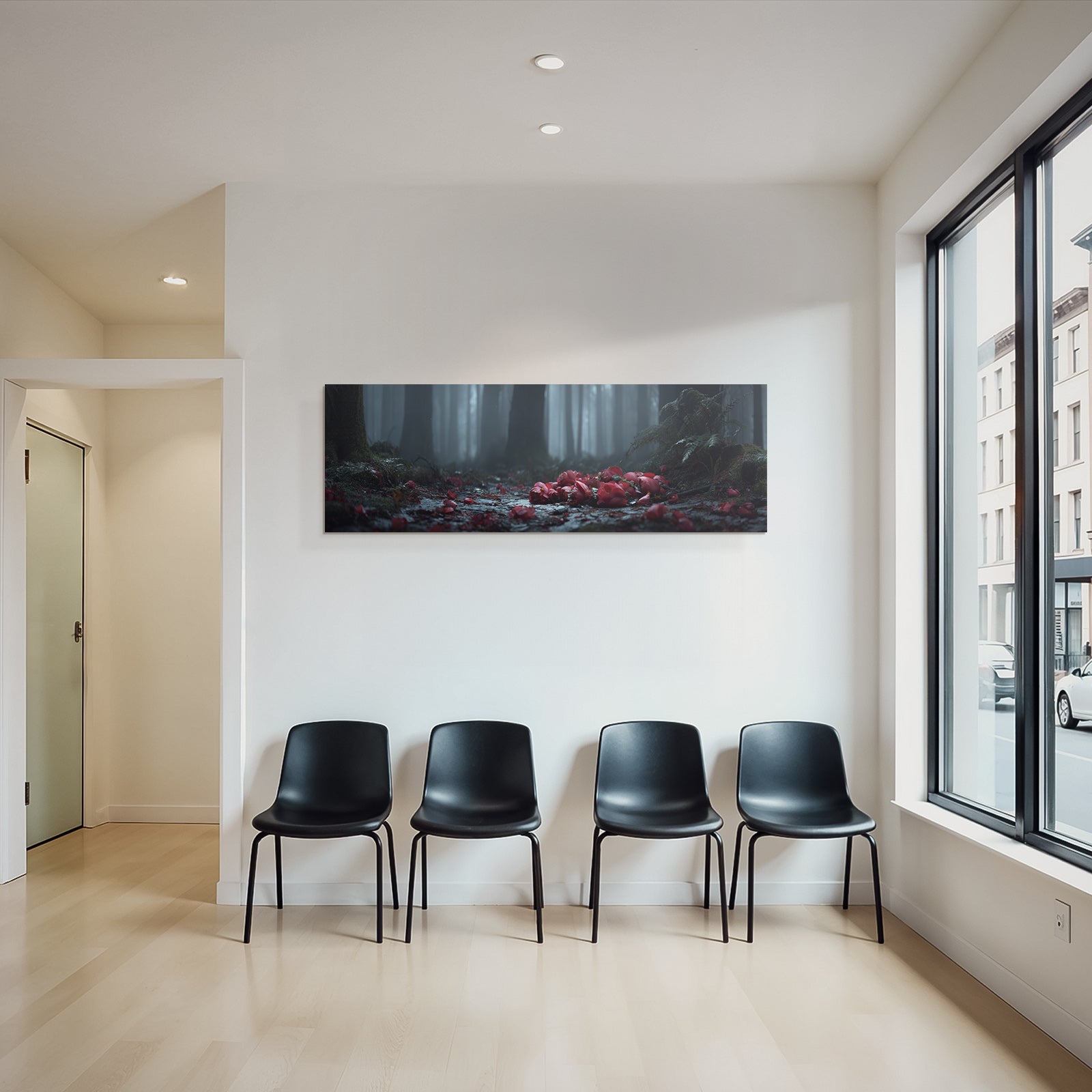 Ob Flur, Wohnraum oder Wartebereich – das Motiv „Ruhiger Wald Mit Blüten“ im Stil Fotografie wirkt durch den hochwertigen FameFrame besonders modern.