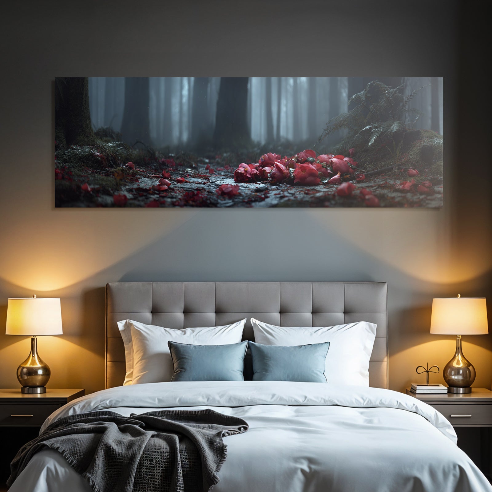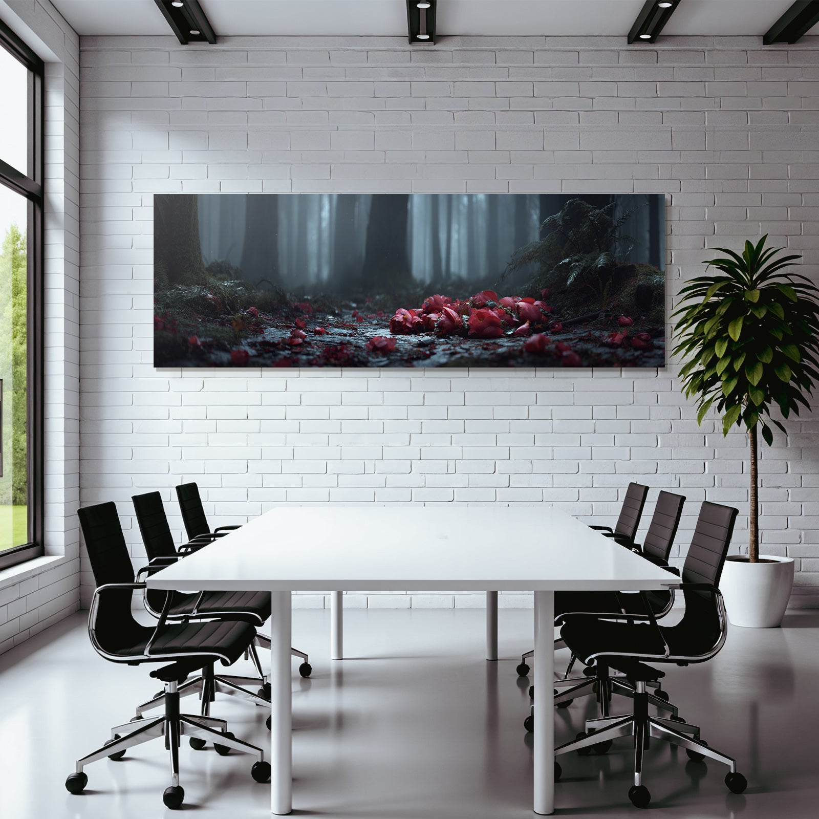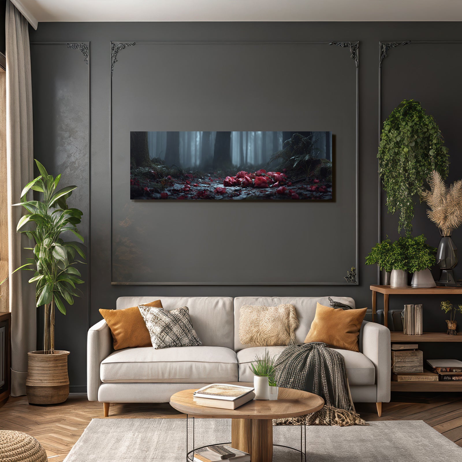 Ob Flur, Wohnraum oder Wartebereich – das Motiv „Ruhiger Wald Mit Blüten“ im Stil Fotografie wirkt durch den hochwertigen FameFrame besonders modern.