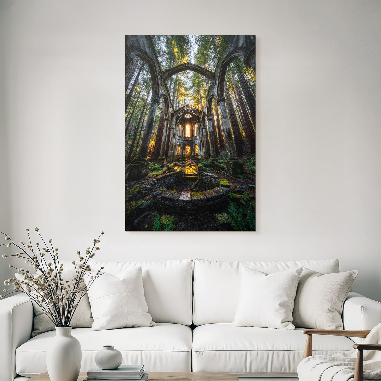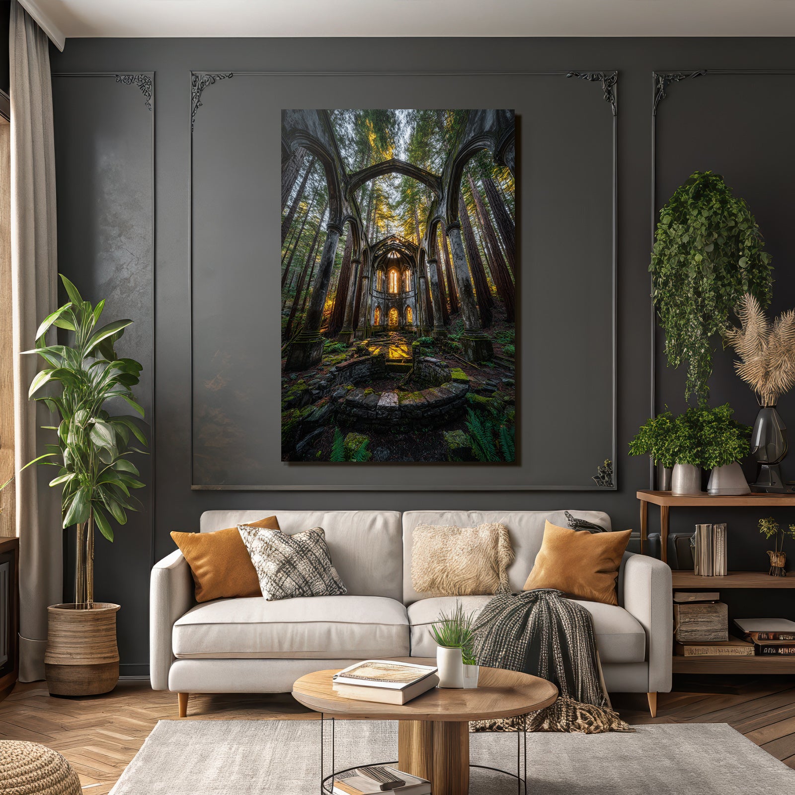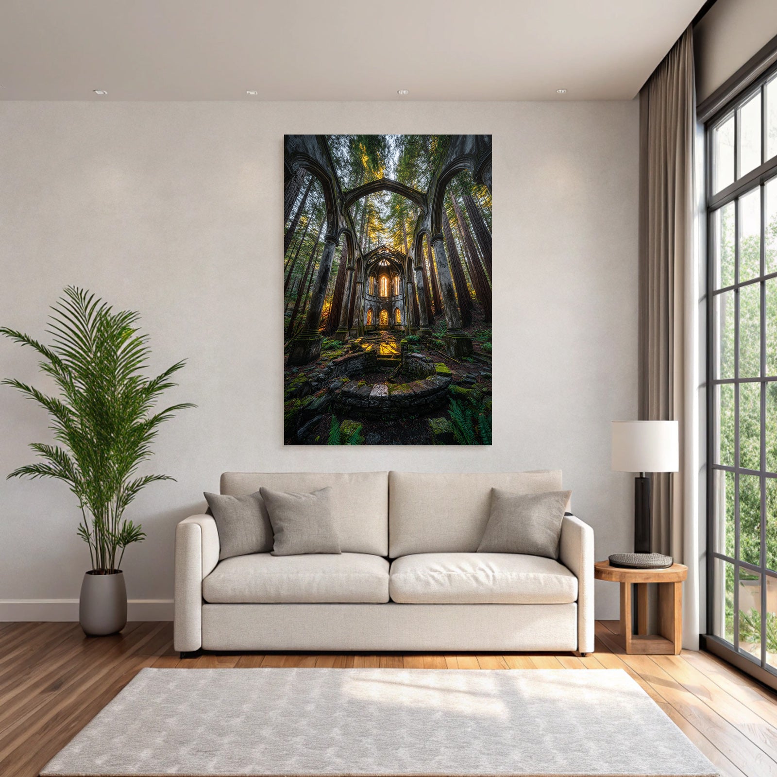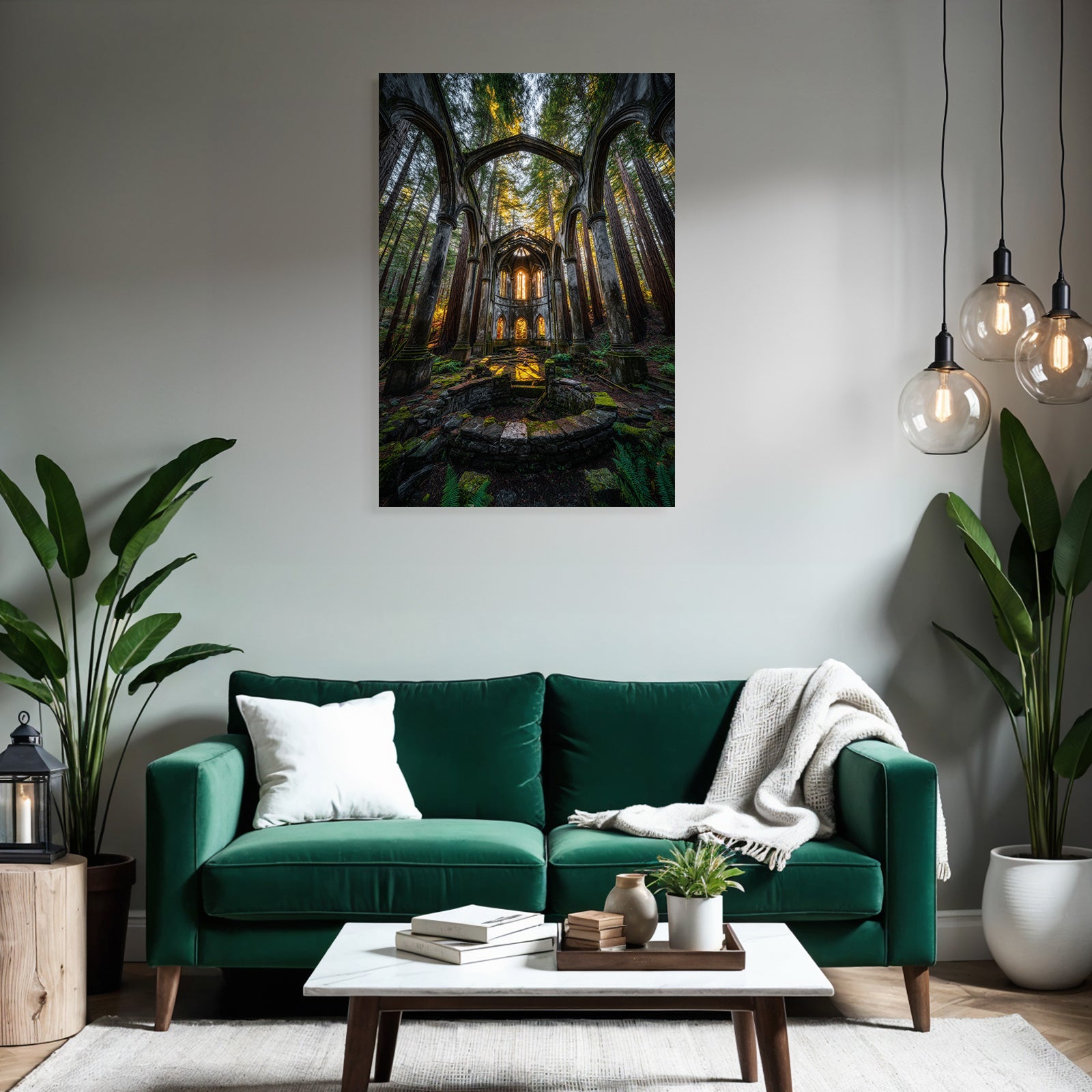 Bring die Atmosphäre von Lost Places in Dein Zuhause – mit „Ruinierte Steingewölbe Und Wände Umgeben Von Baeumen“ auf Stoff im austauschbaren FameFrame™.
