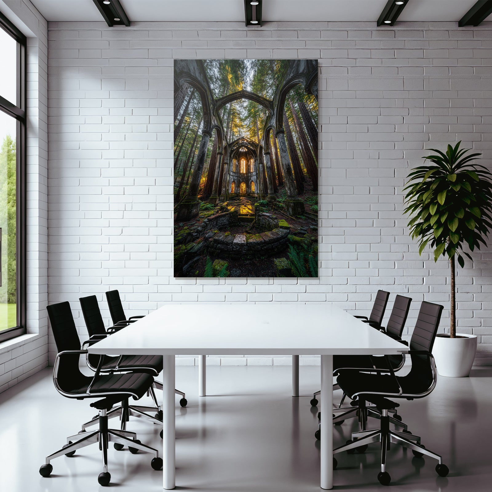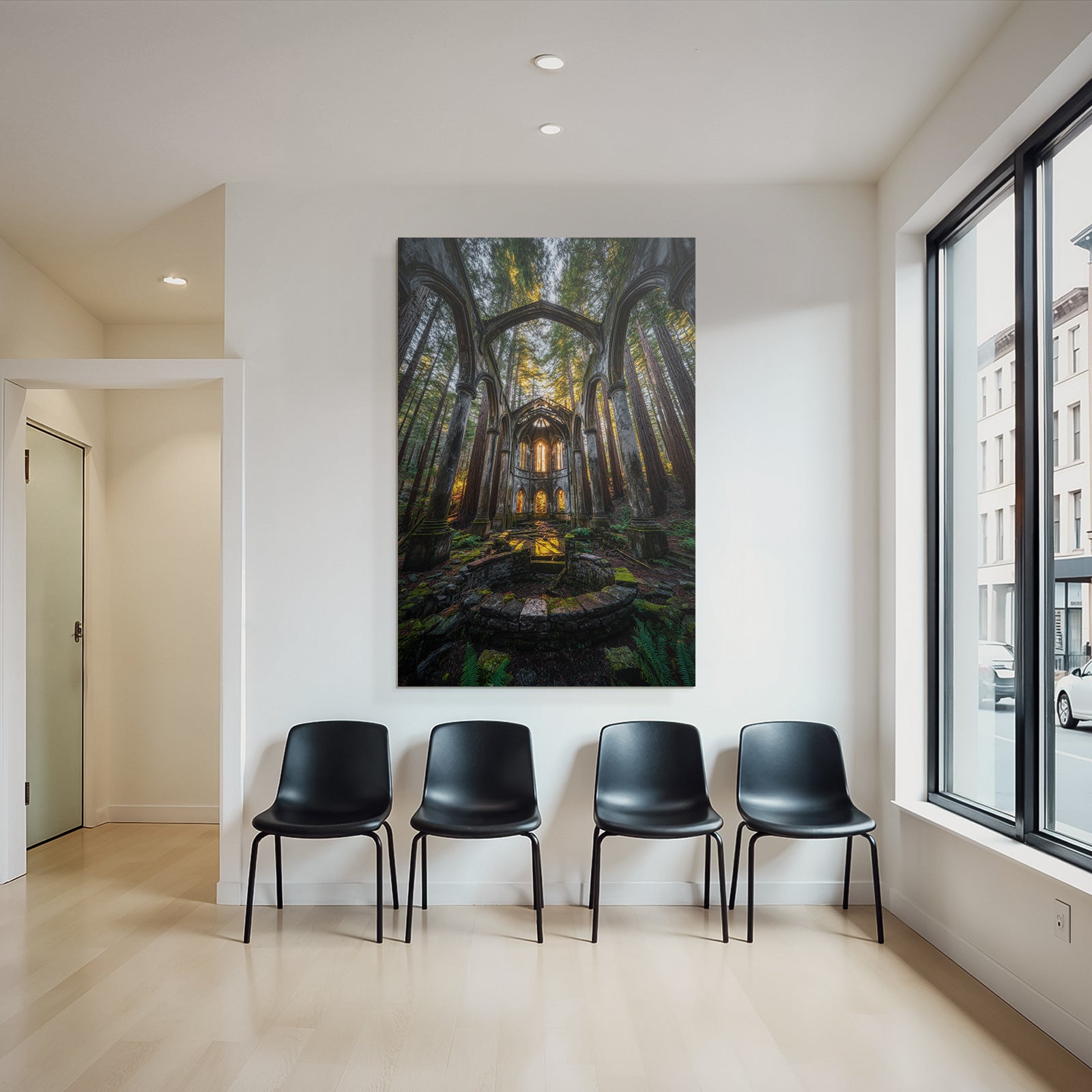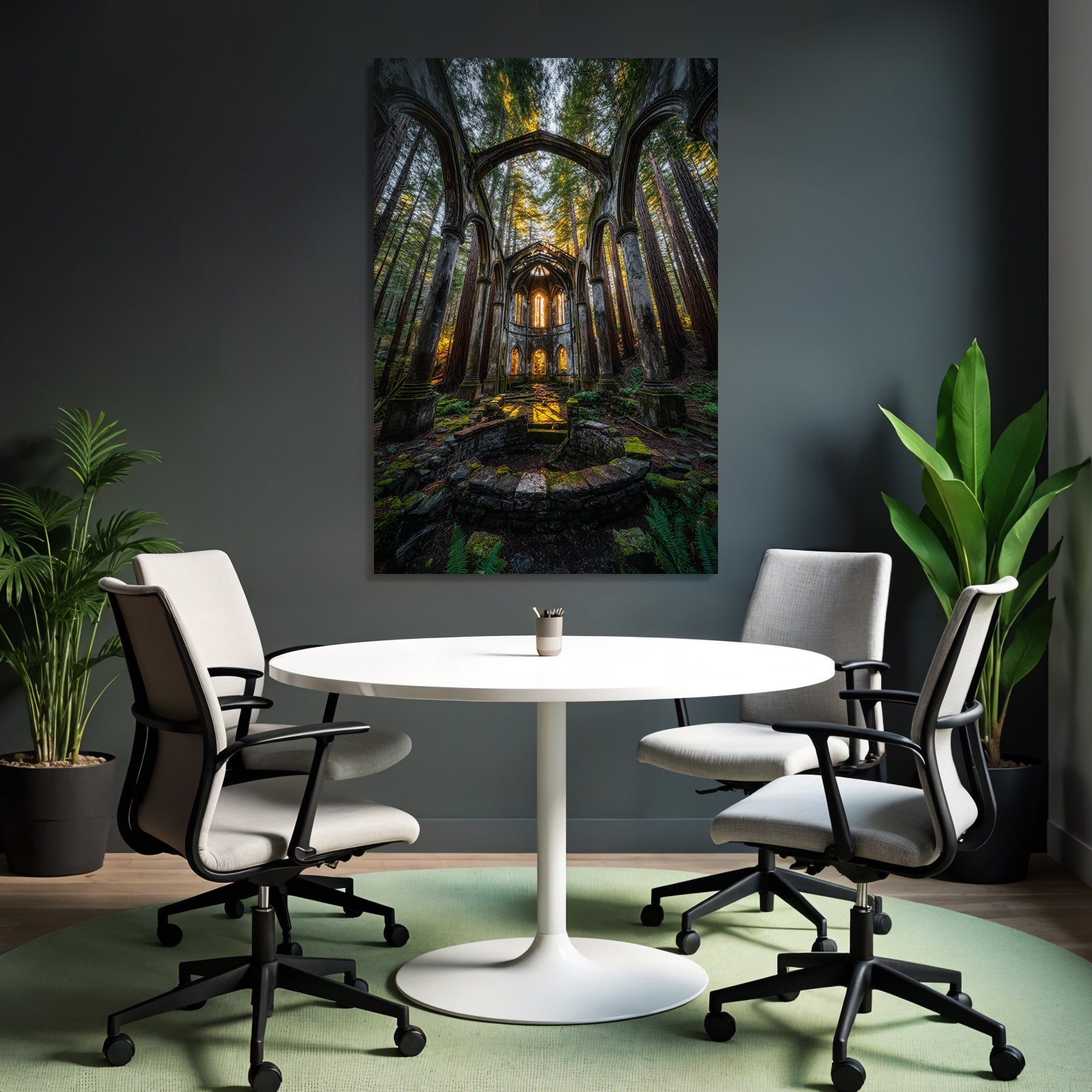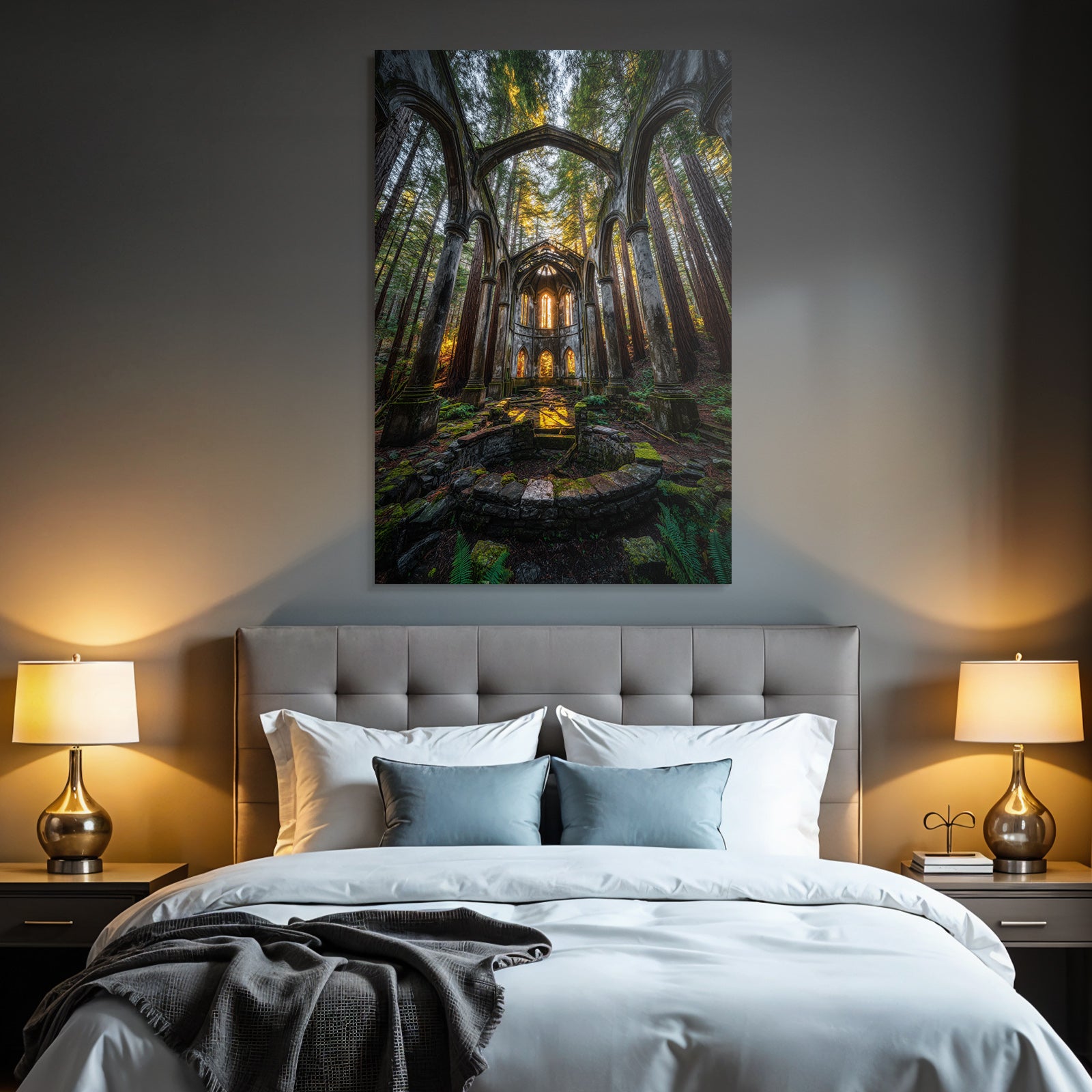 Bring die Atmosphäre von Lost Places in Dein Zuhause – mit „Ruinierte Steingewölbe Und Wände Umgeben Von Baeumen“ auf Stoff im austauschbaren FameFrame™.