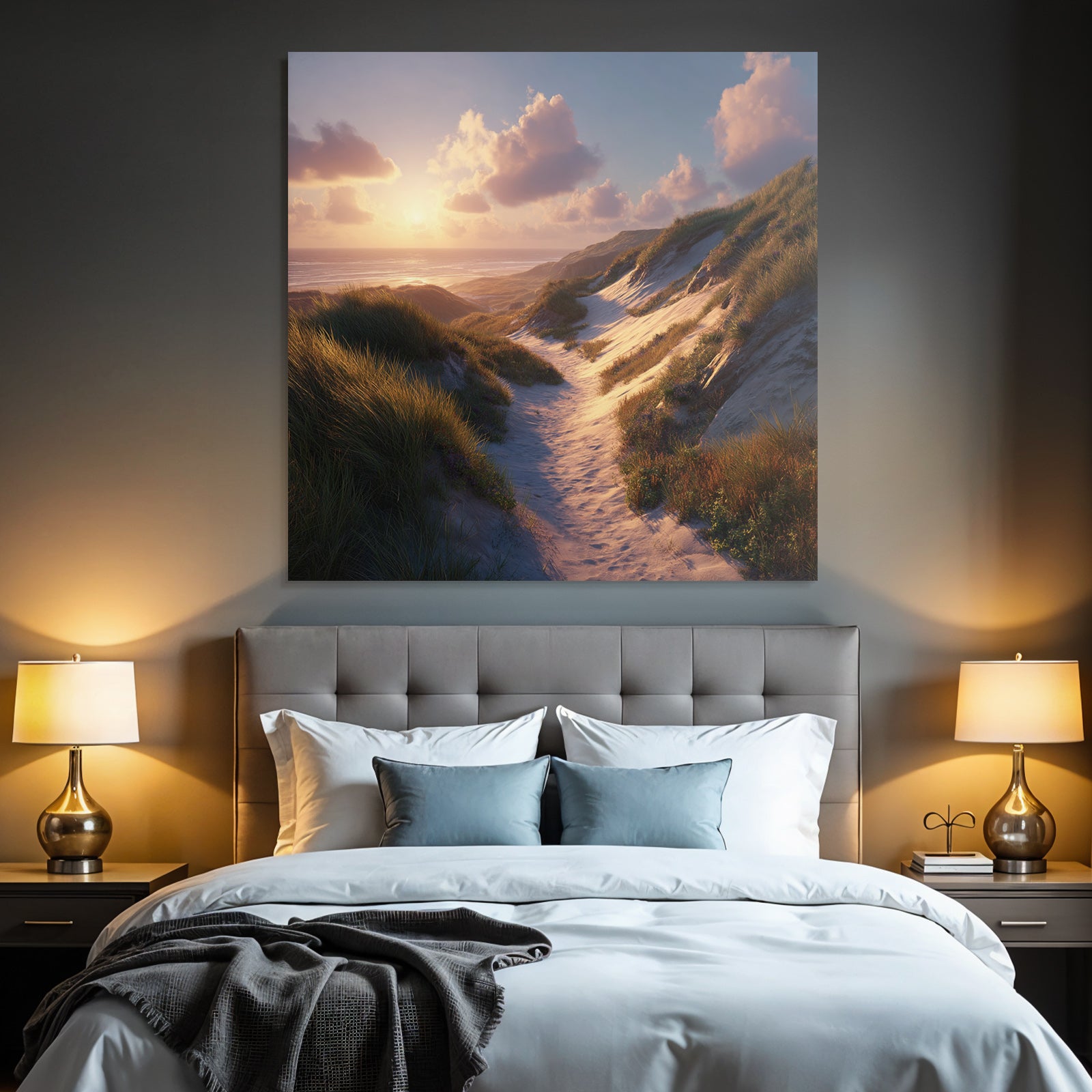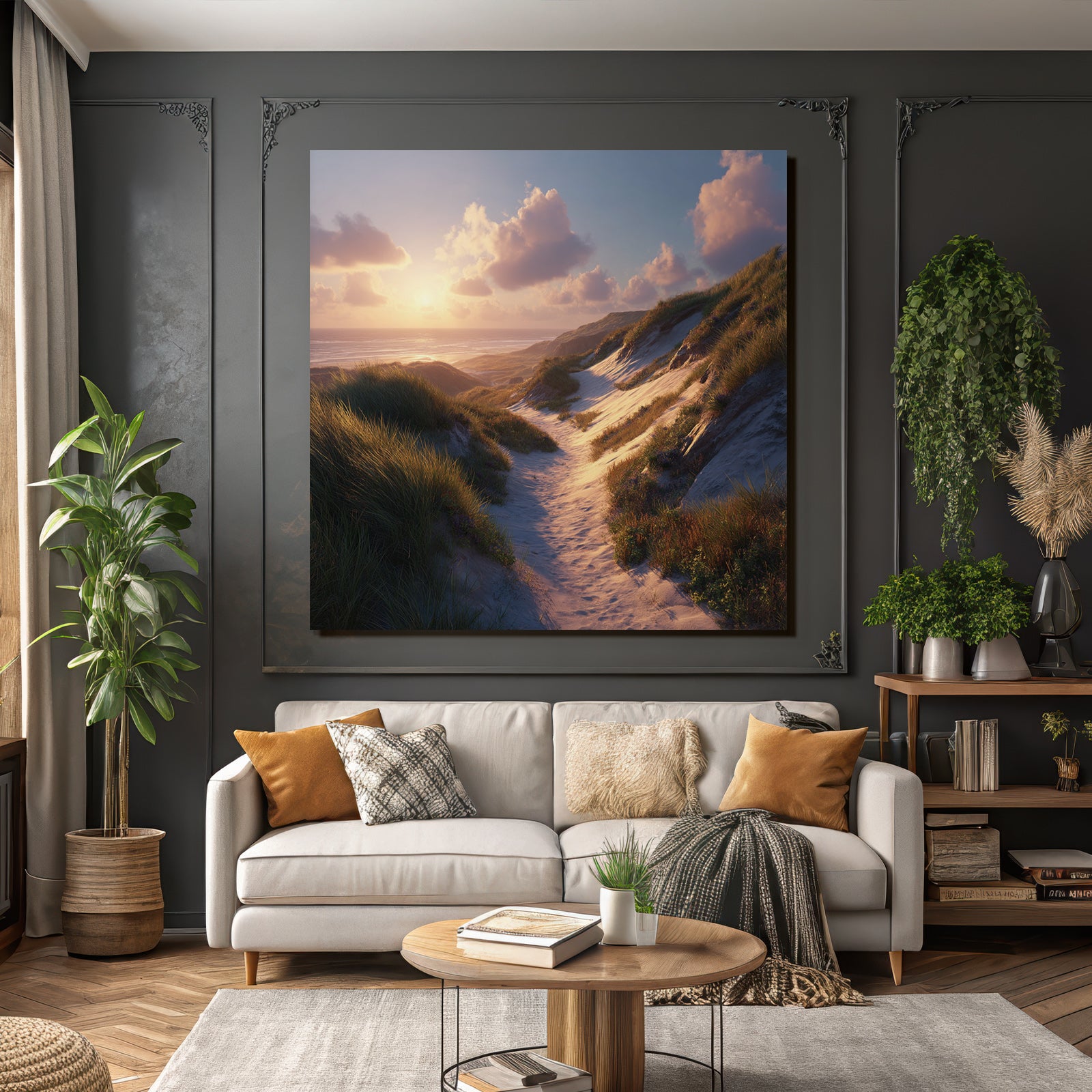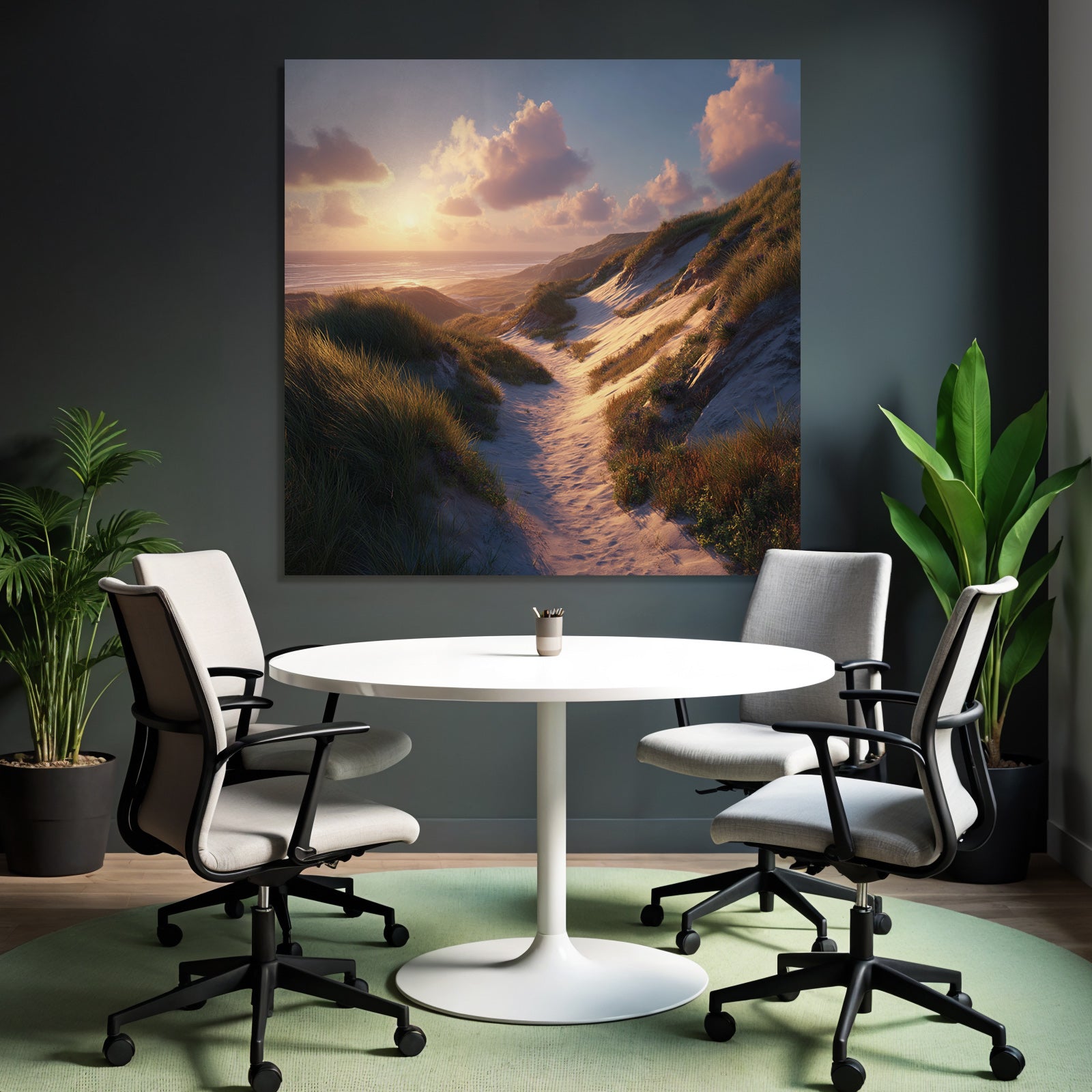 „Sanddünen Mit Gras Und Wasser Bei Sonnenuntergang“ bringt den Stil Dünen und Heide an Deine Wand – perfekt für Schlafzimmer, Homeoffice oder Besprechungsräume, edel gerahmt im FameFrame™.