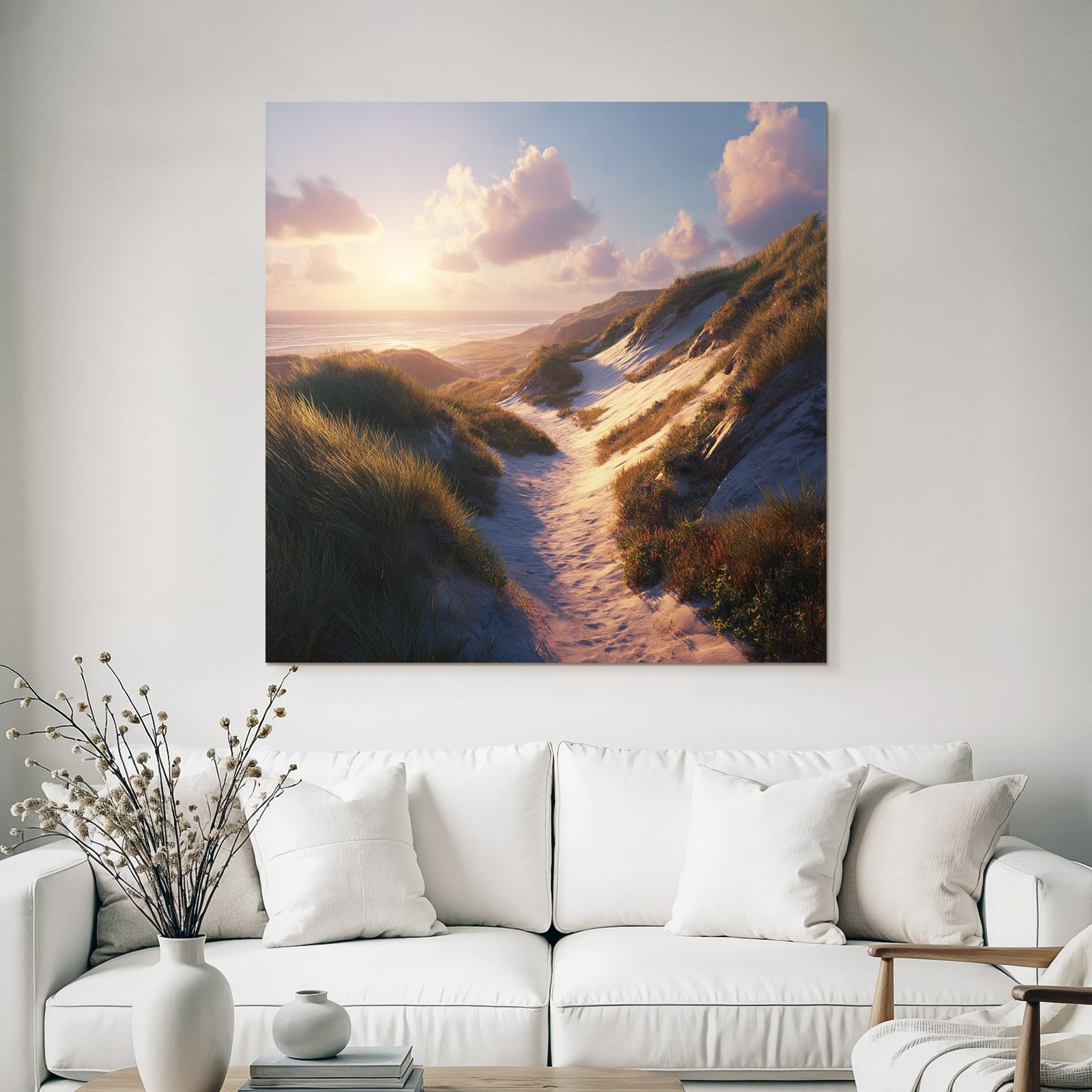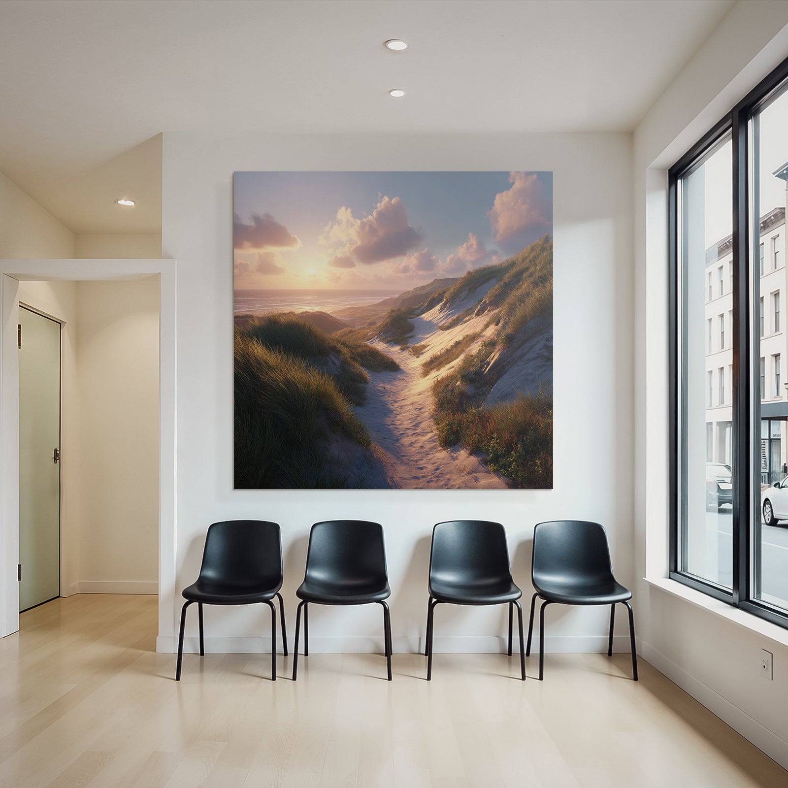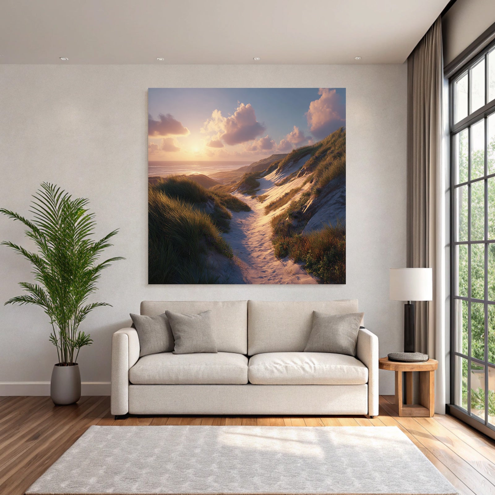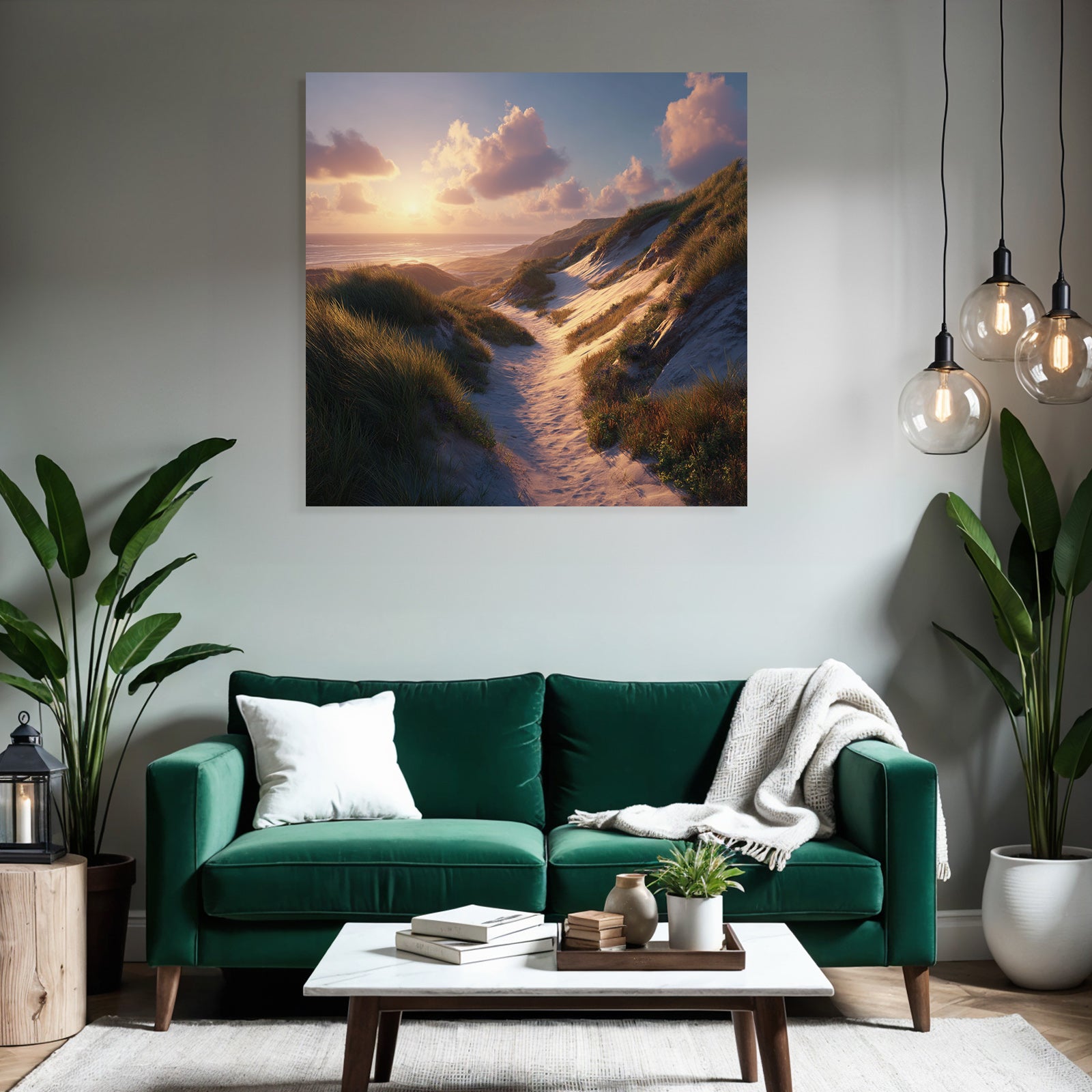 „Sanddünen Mit Gras Und Wasser Bei Sonnenuntergang“ bringt den Stil Dünen und Heide an Deine Wand – perfekt für Schlafzimmer, Homeoffice oder Besprechungsräume, edel gerahmt im FameFrame™.