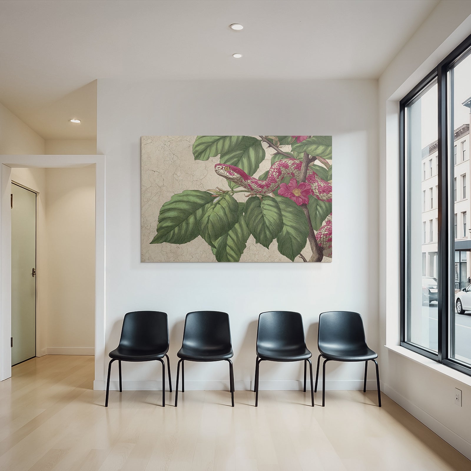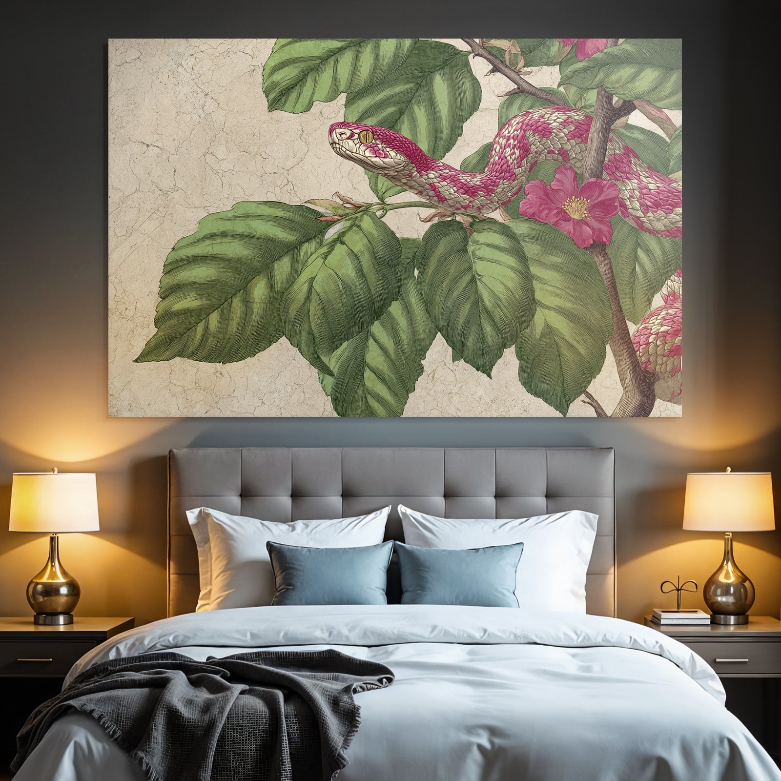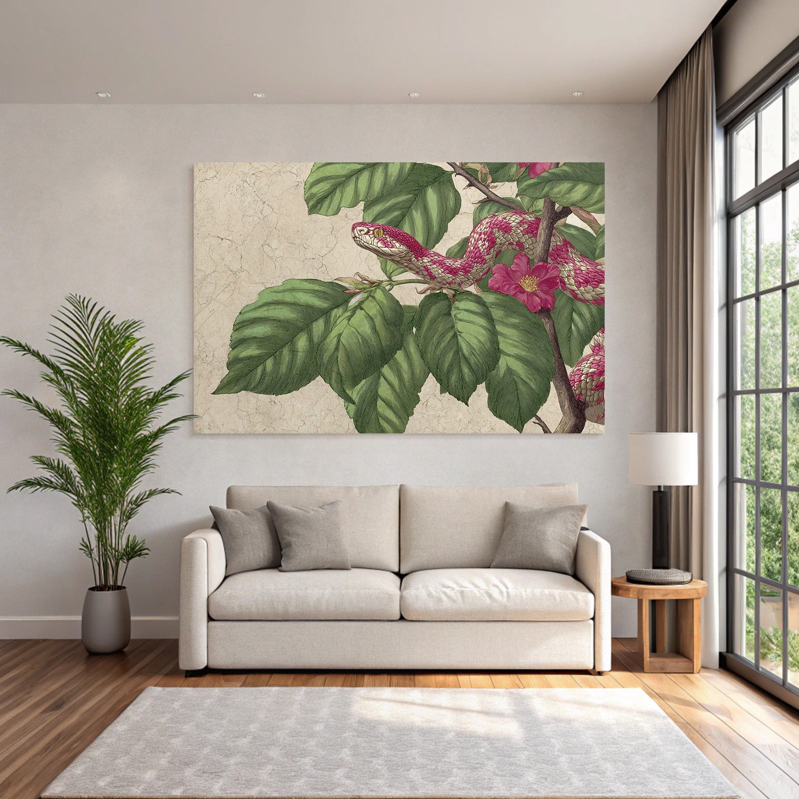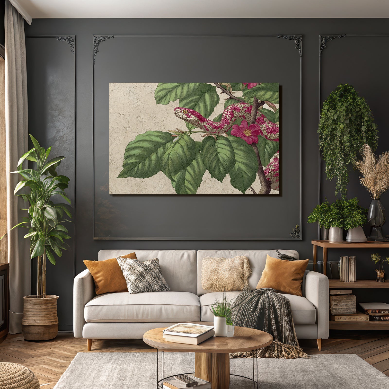 Bringen Sie frischen Wind in Ihr Studio oder Ihren Kreativraum. „Schlange Auf Zweig Mit Grünen Blattern Und Rosa Blume“ als Textildruck im Stil Botanische Illustrationen inspiriert im FameFrame zu neuen Ideen.