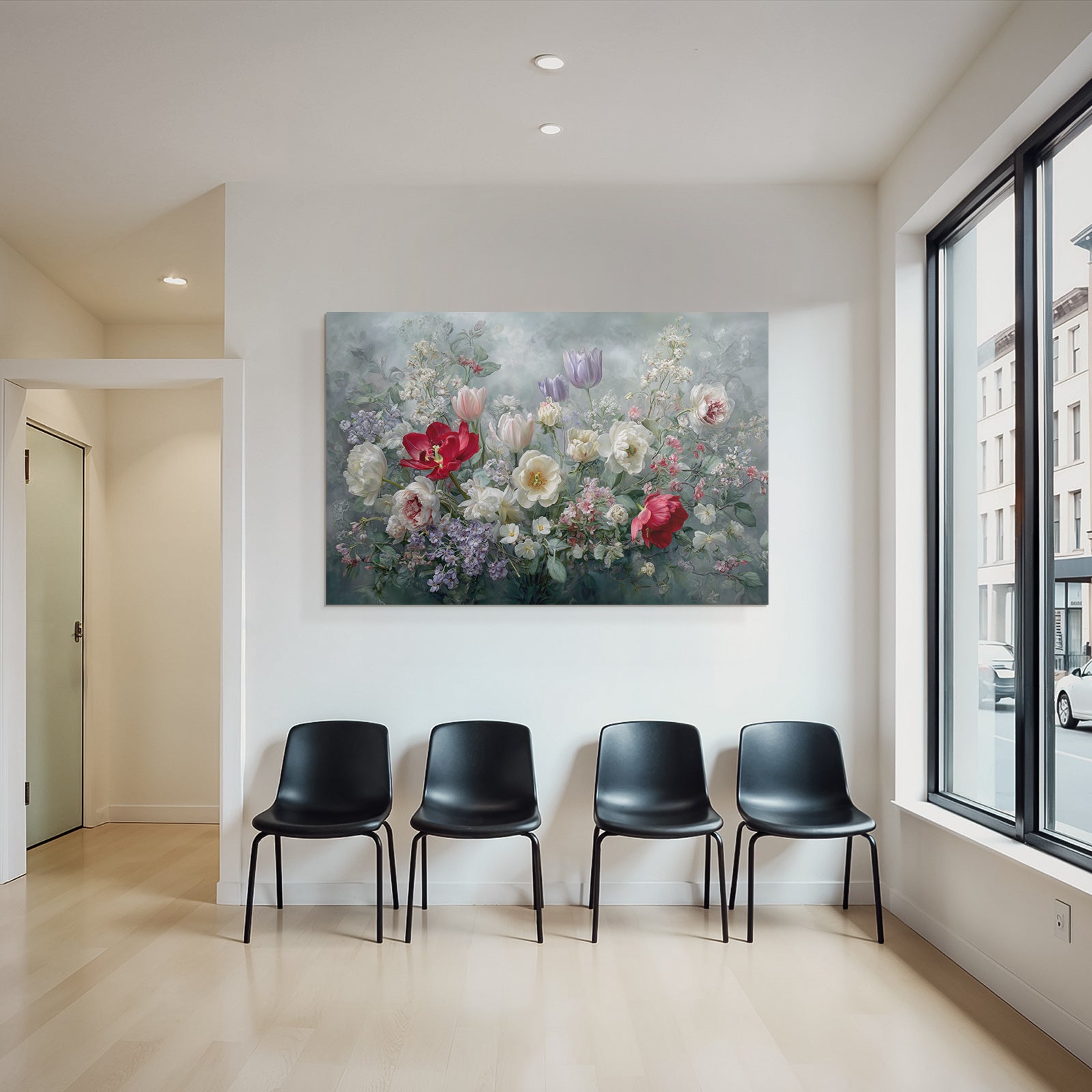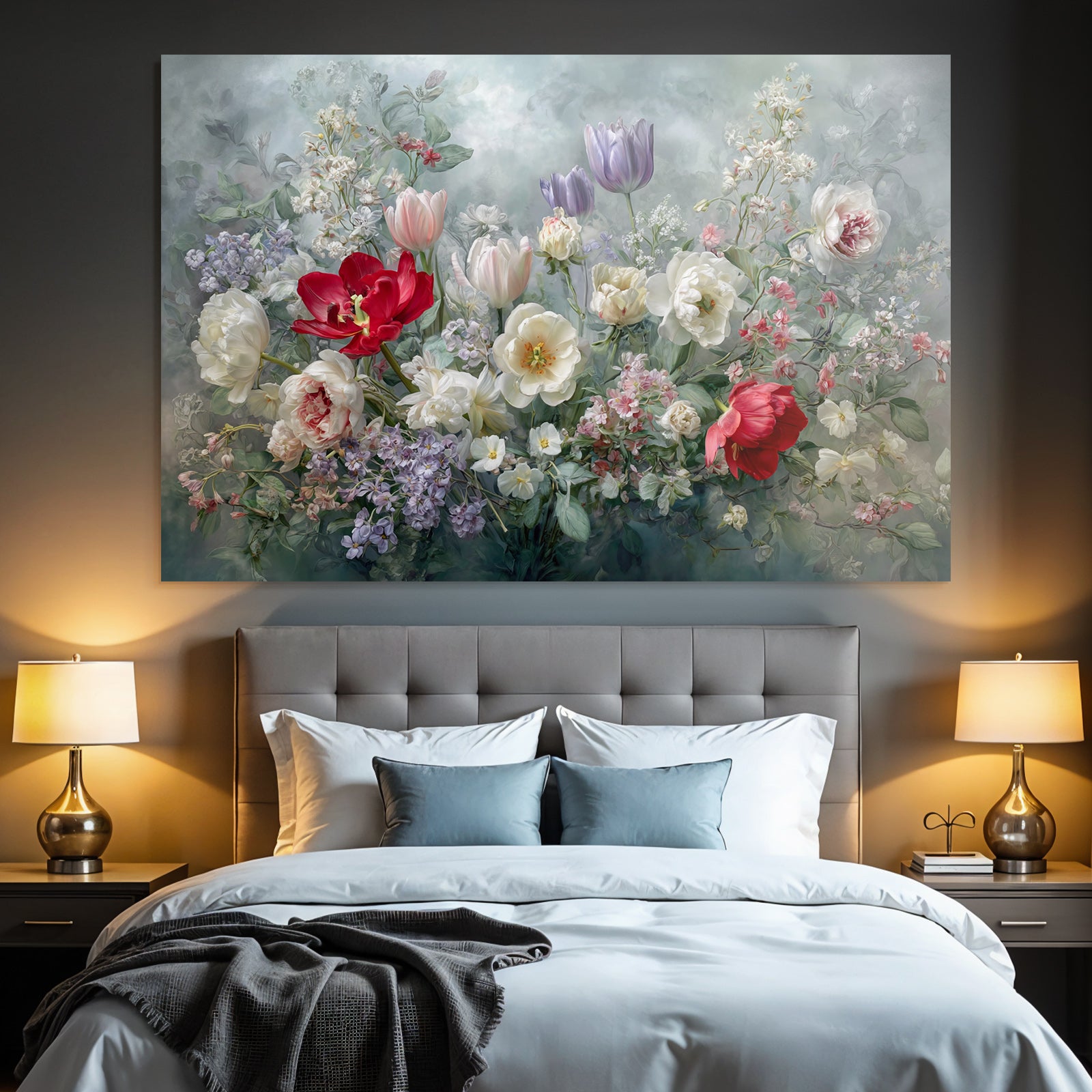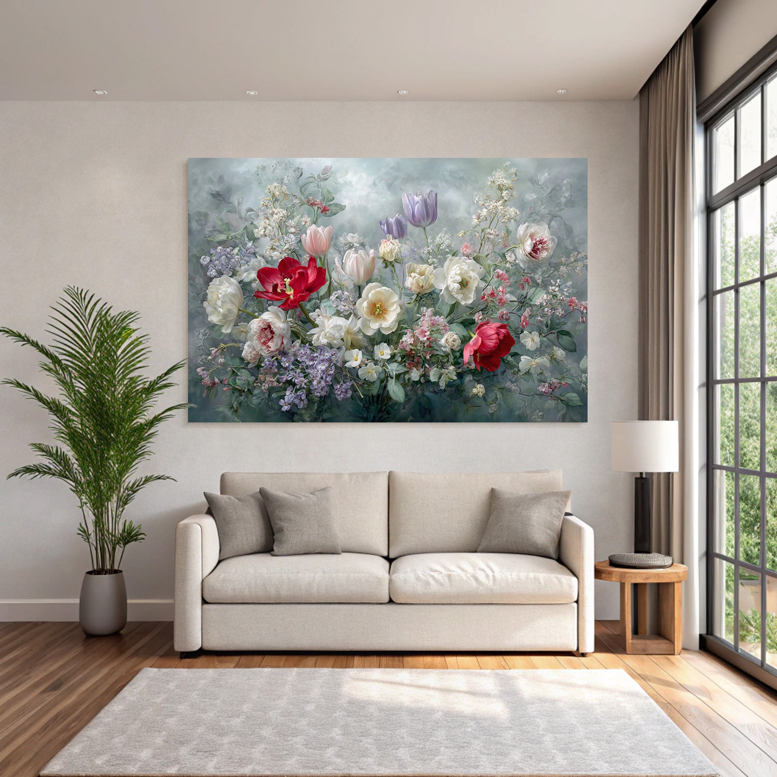 Dieses Kunstwerk zelebriert den Stil Rosen Tulpen Lavendel. Die klaren Linien (oder organischen Formen) von „Schöne Blütenpracht Mit Roten Tulpen Und Weissen Pfingstrosen“ werden durch den minimalistischen FameFrame elegant betont.