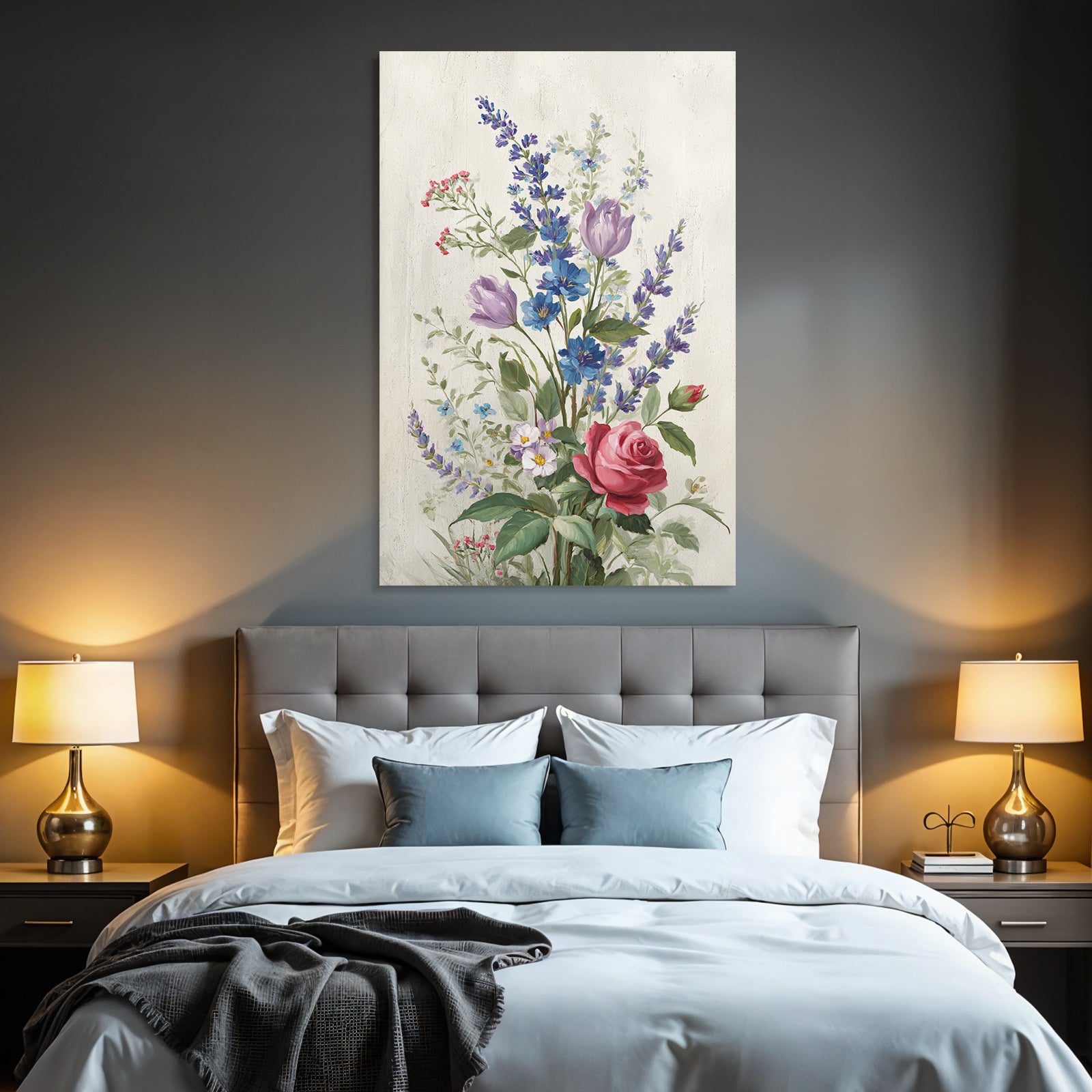 „Schönes Arrangement Mit Rosen Und Bunten Blüten“ bringt den Stil Rosen Tulpen Lavendel an Deine Wand – perfekt für Schlafzimmer, Homeoffice oder Besprechungsräume, edel gerahmt im FameFrame.