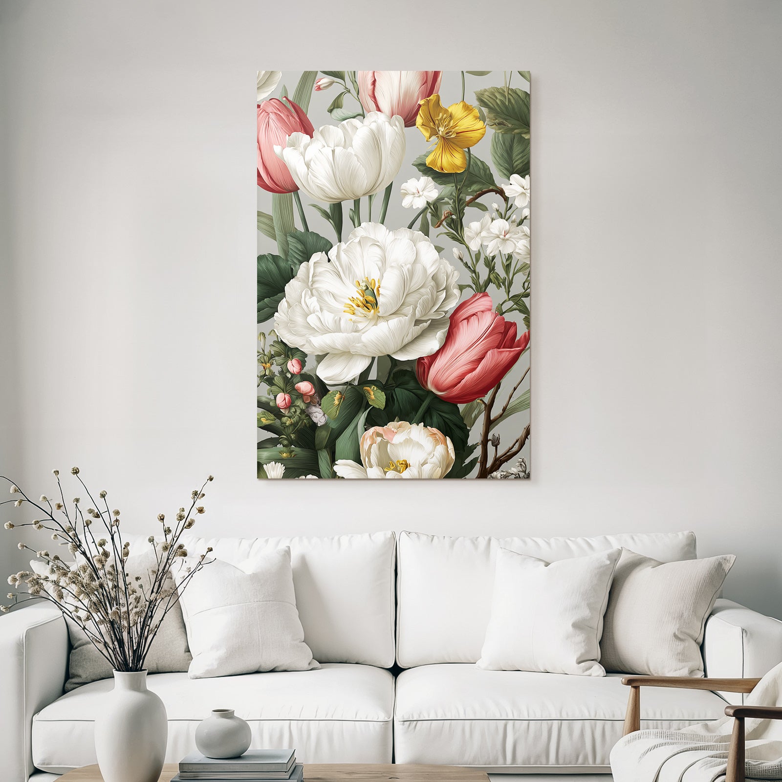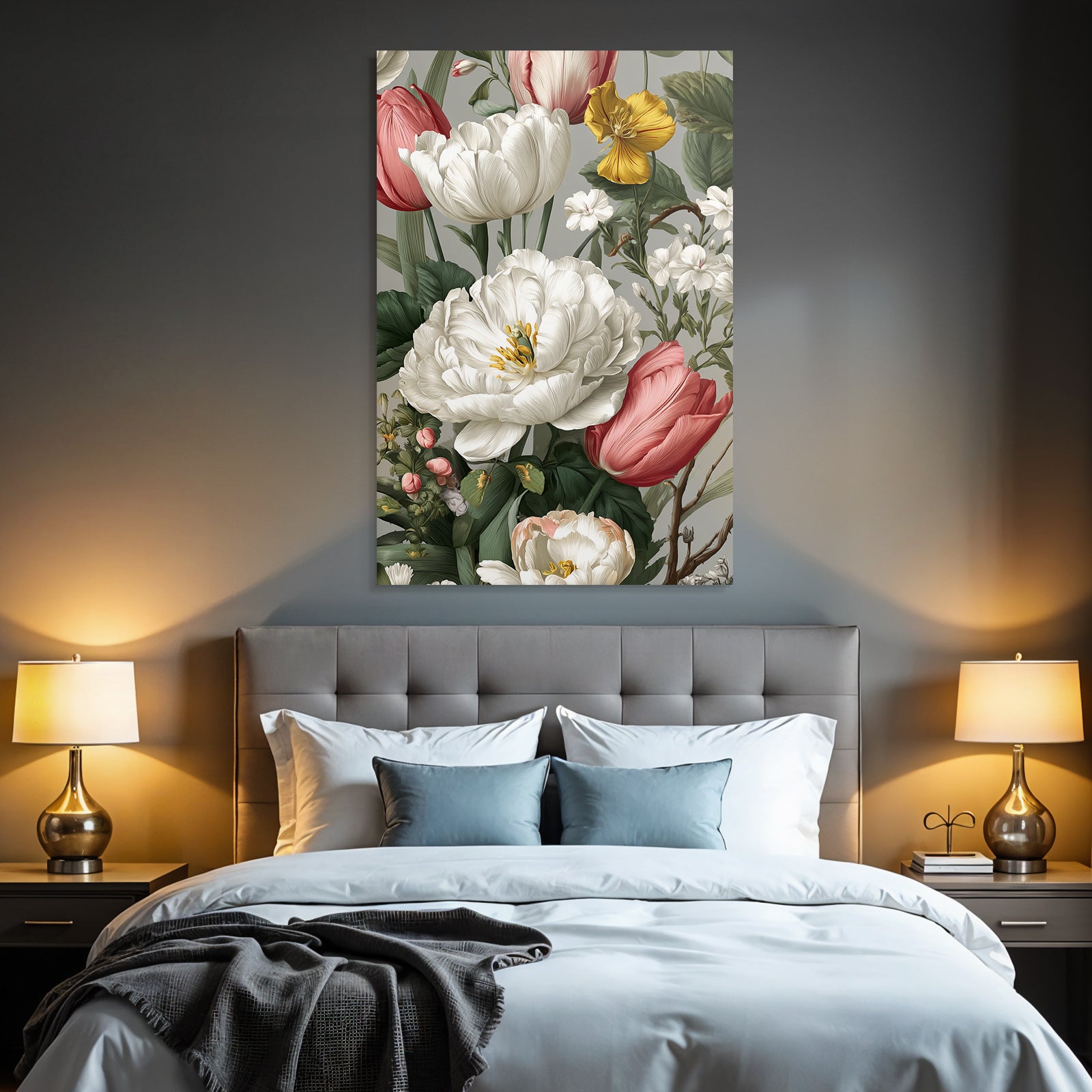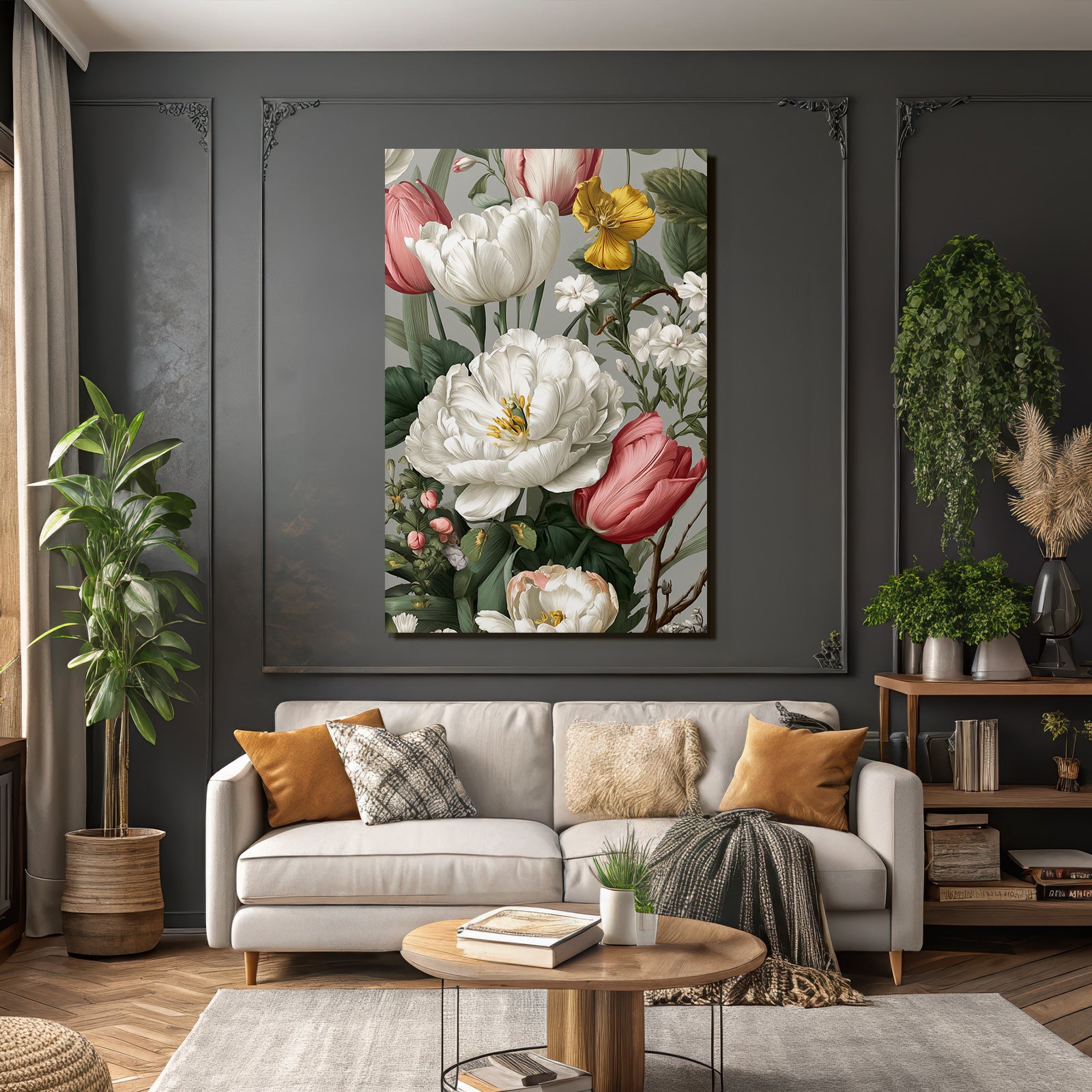 Verschönere Dein Zuhause mit diesem Werk im Stil Rosen Tulpen Lavendel. Der Titel „Schone Anordnung Mit Weissen Pfingstrosen Und Farbigen Tulpen Auf Graüm Hintergrund“ kommt im hochwertigen FameFrame perfekt zur Geltung.