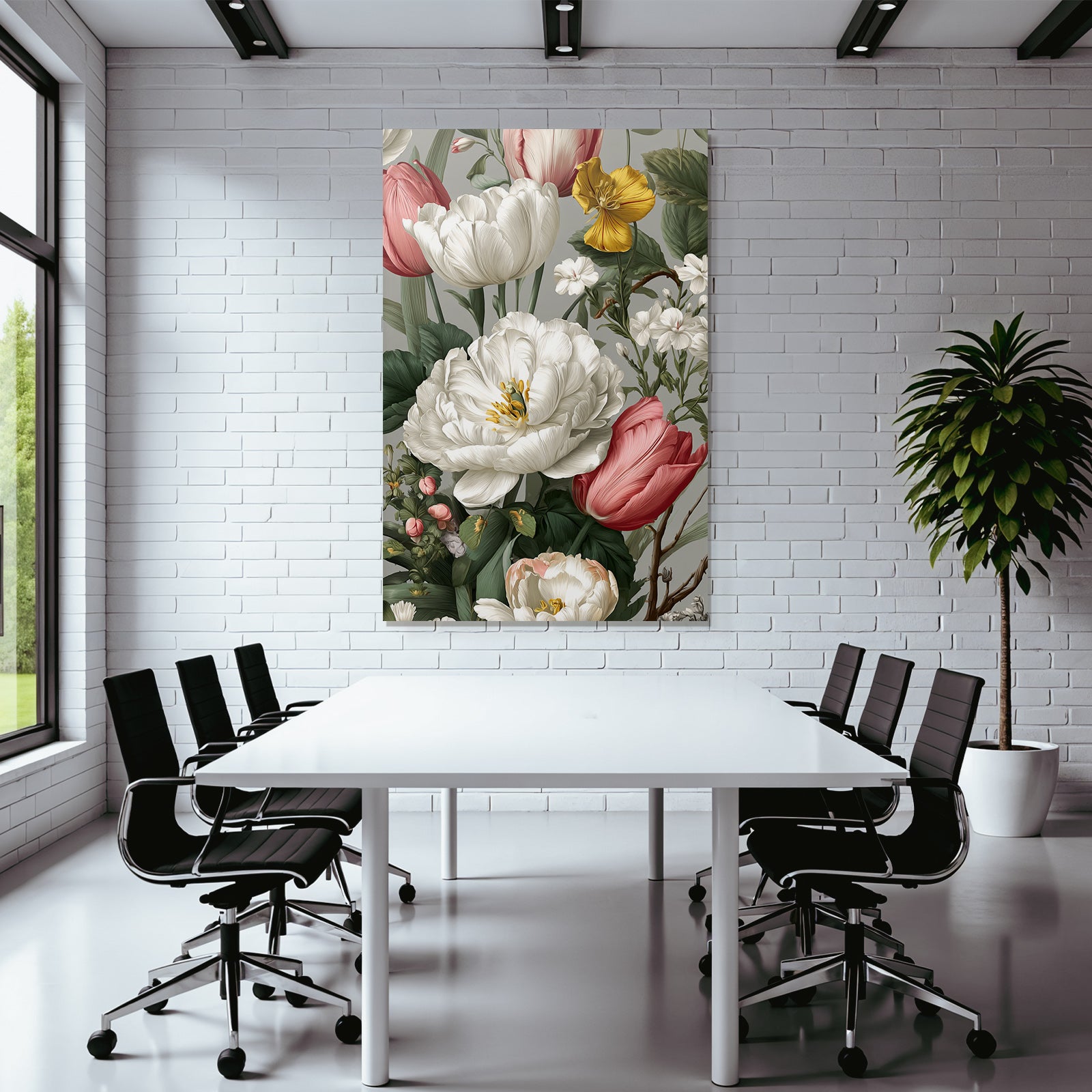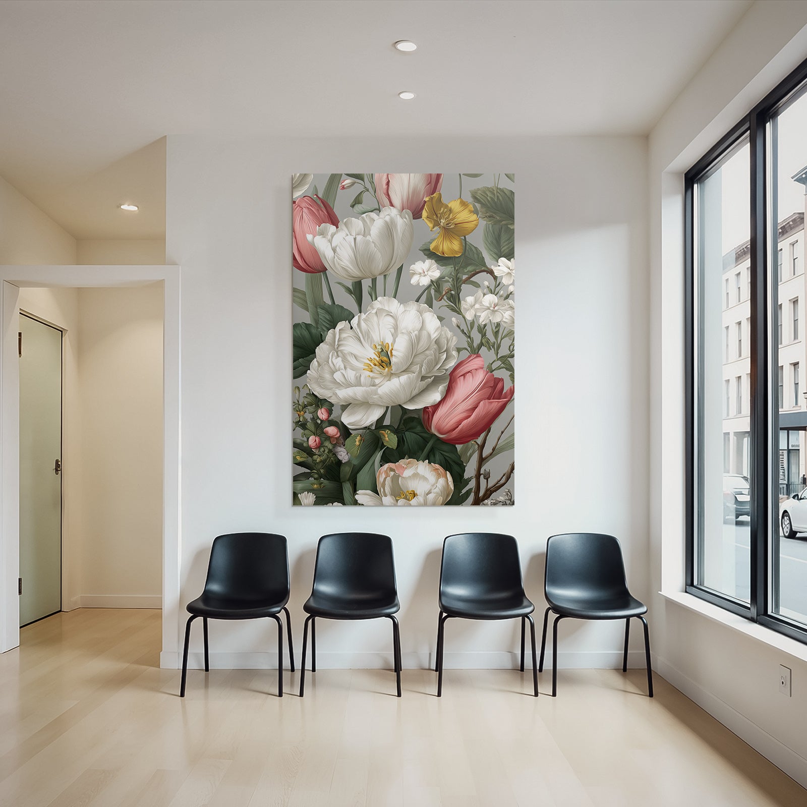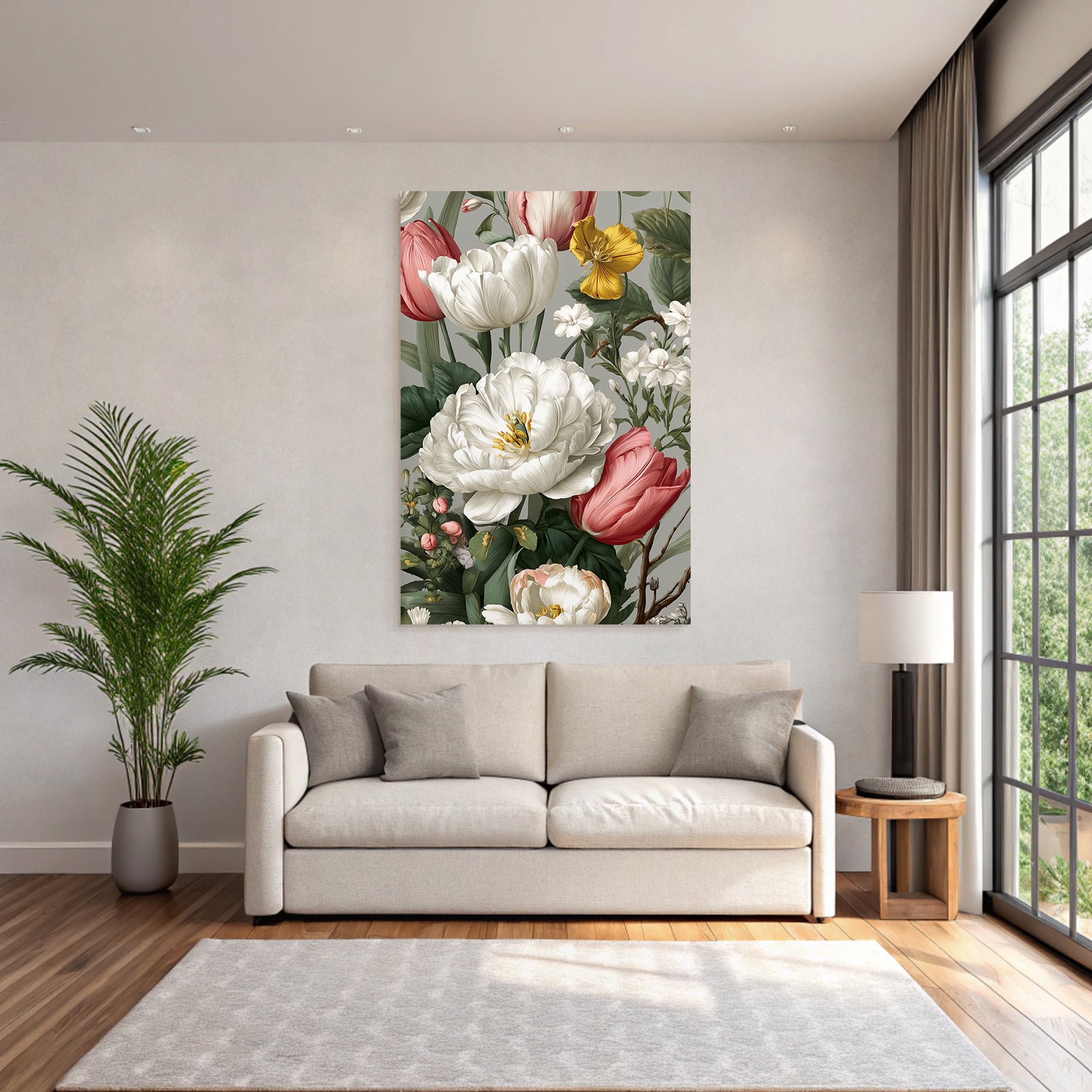 Verschönere Dein Zuhause mit diesem Werk im Stil Rosen Tulpen Lavendel. Der Titel „Schone Anordnung Mit Weissen Pfingstrosen Und Farbigen Tulpen Auf Graüm Hintergrund“ kommt im hochwertigen FameFrame perfekt zur Geltung.