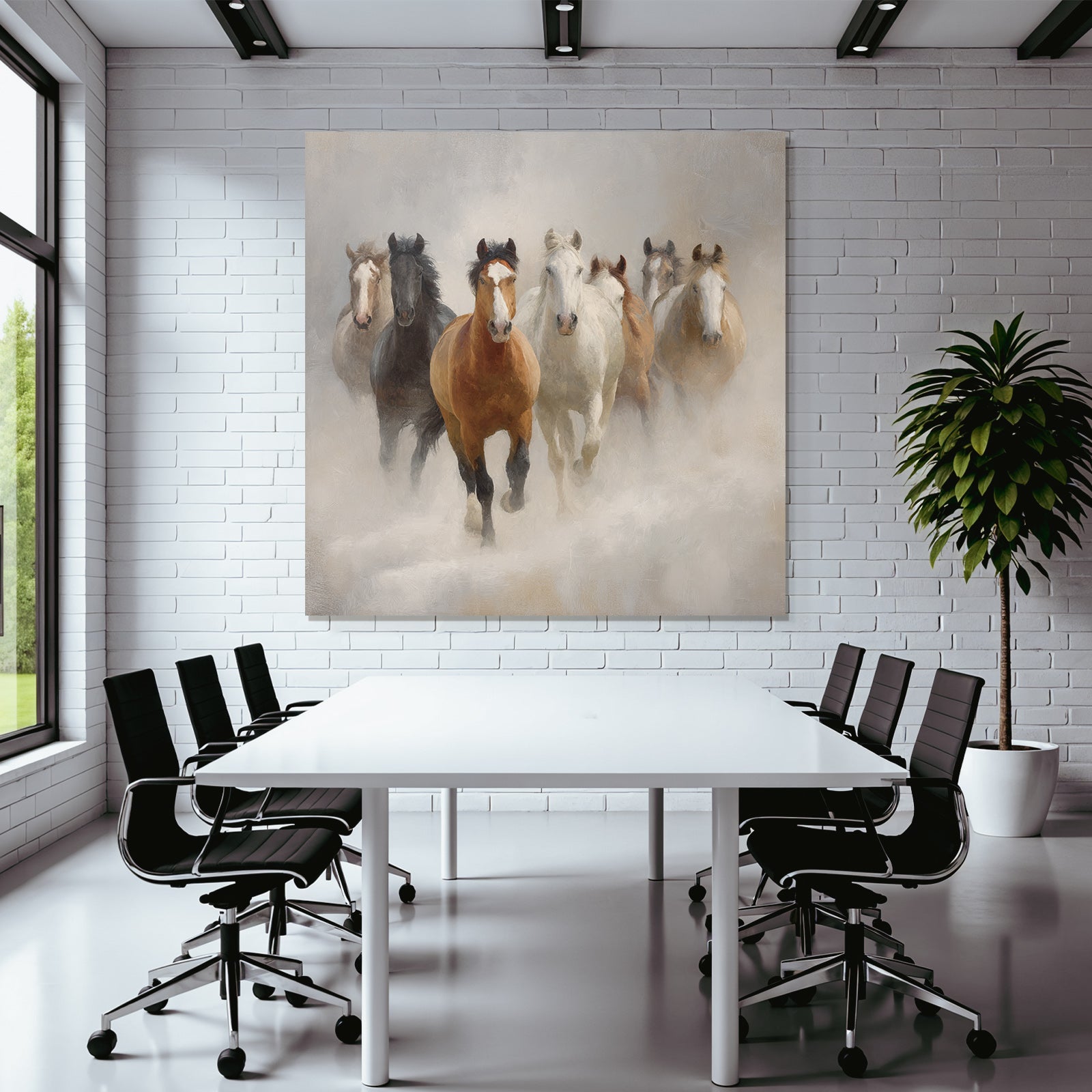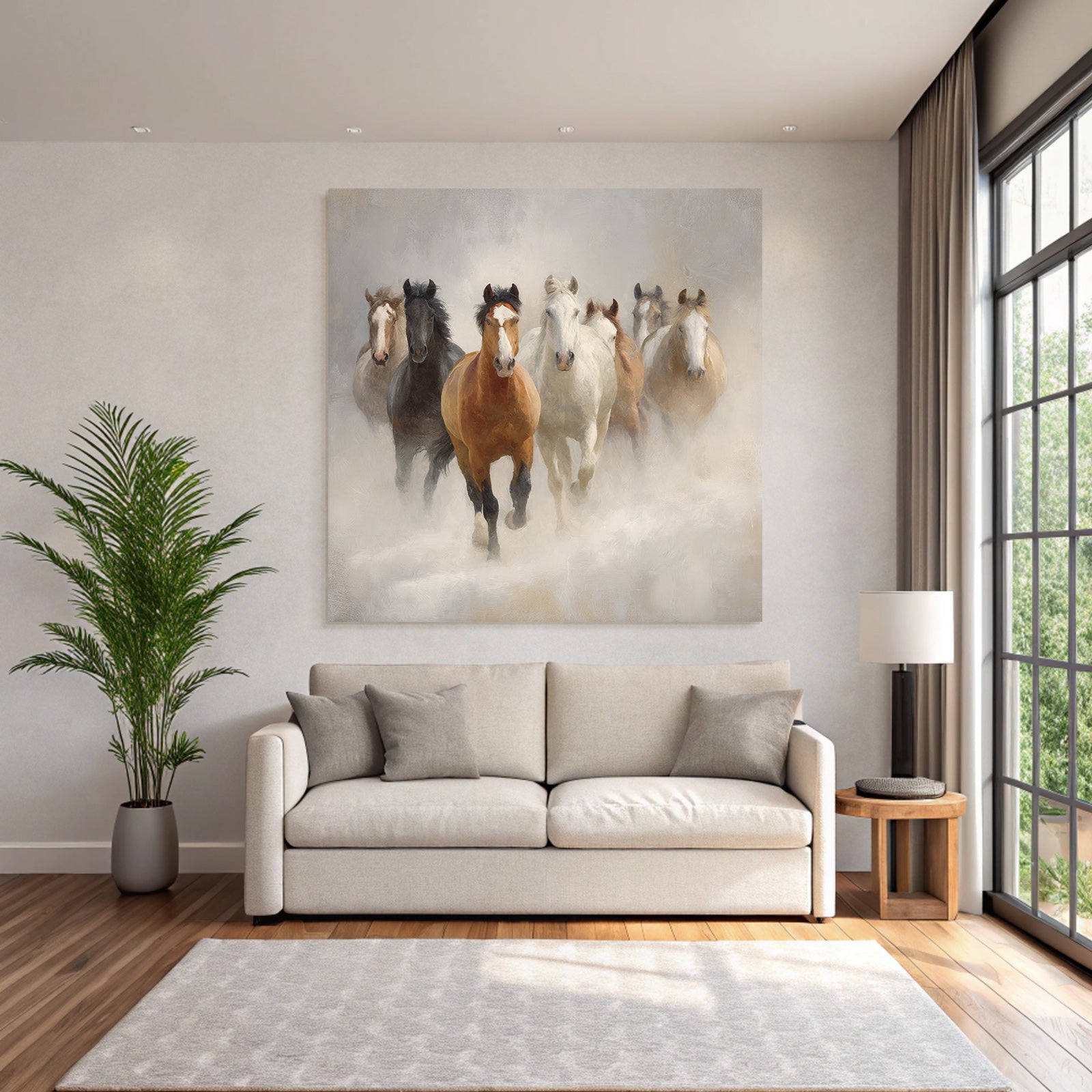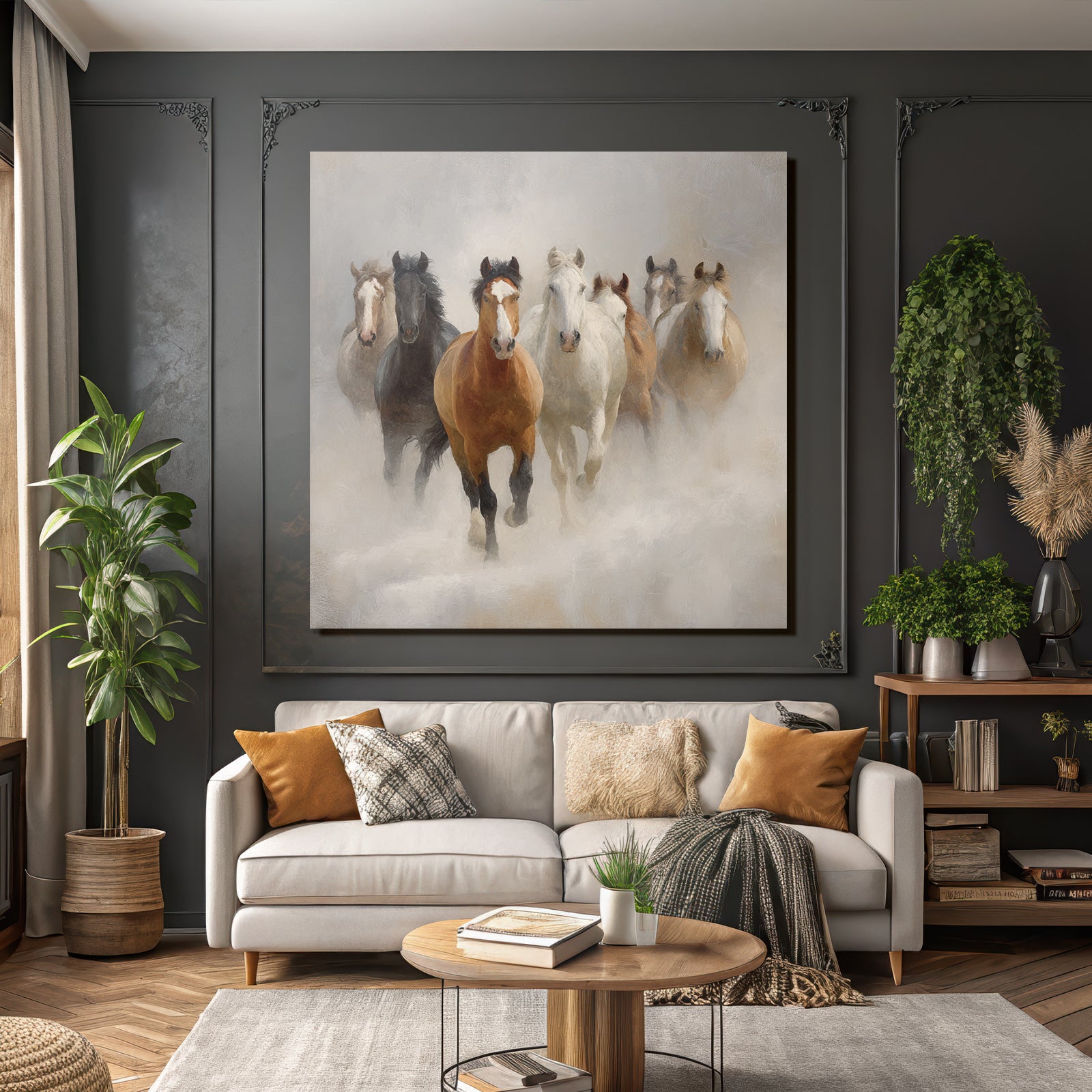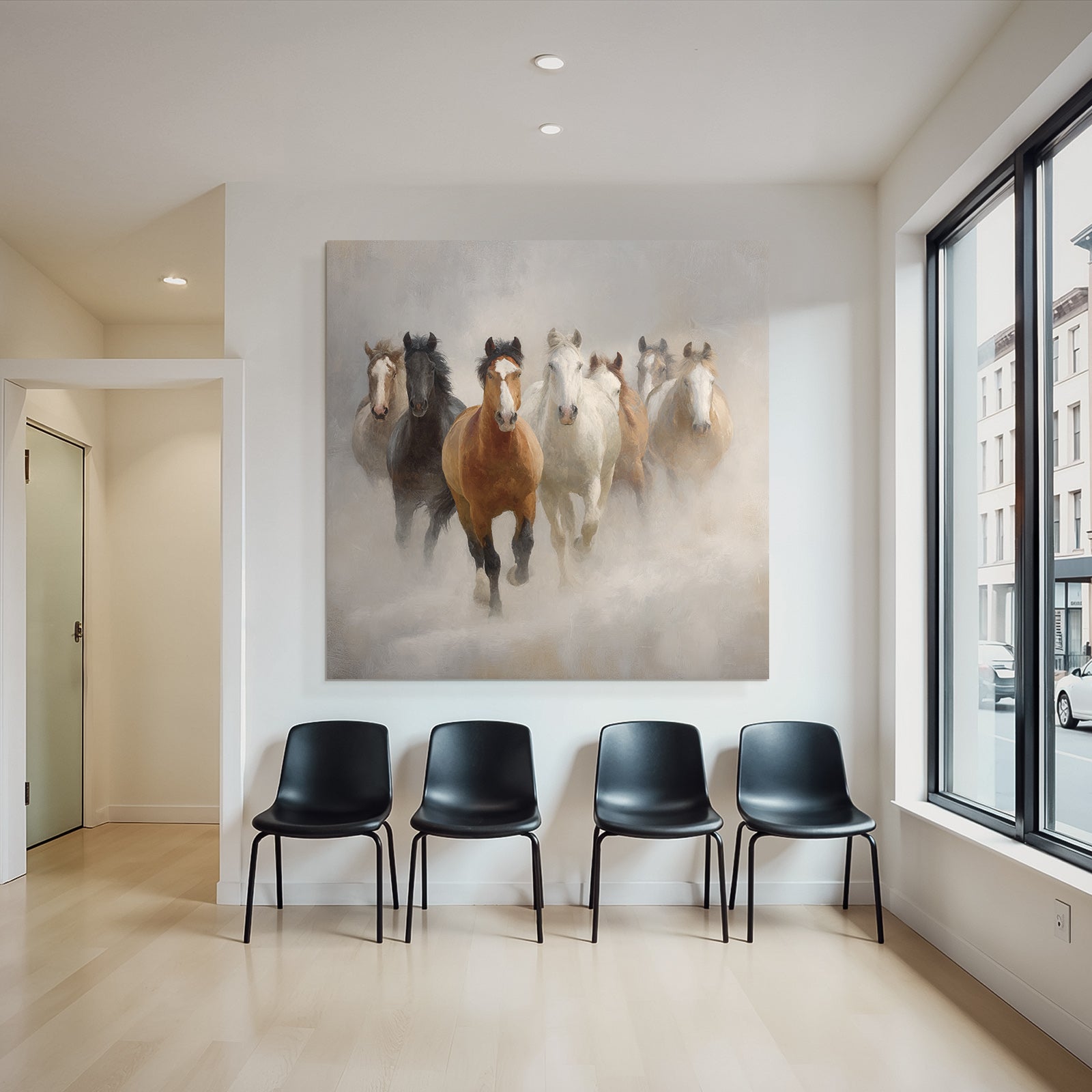 Ein Highlight für Wohnzimmer, Studio oder Empfangsbereich: „„Sechs Pferde Im Nebel““ bringt den Stil Grandeur Chic auf Stoff – gespannt im edlen FameFrame.
