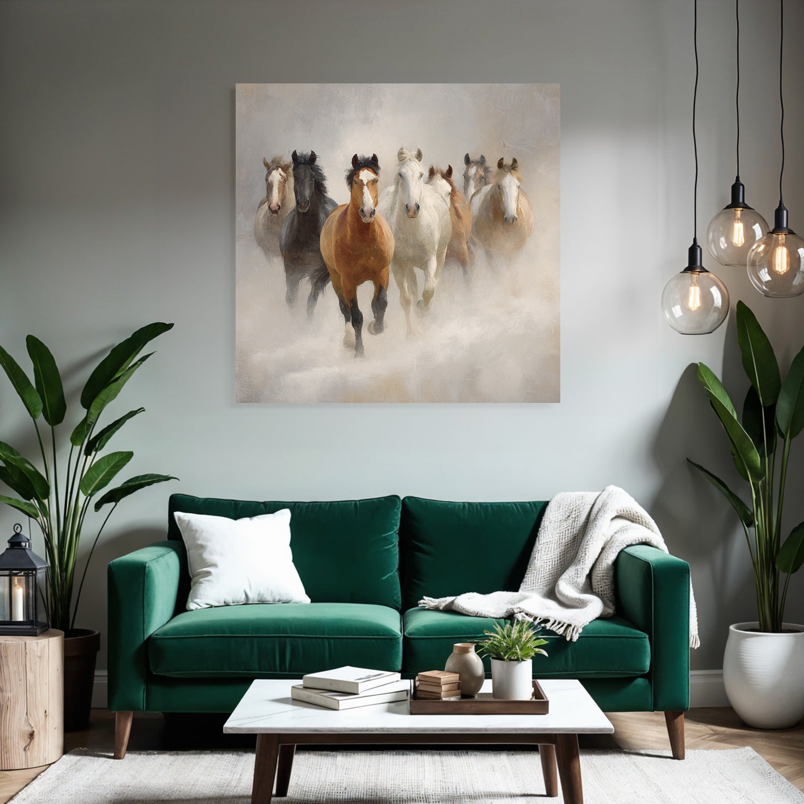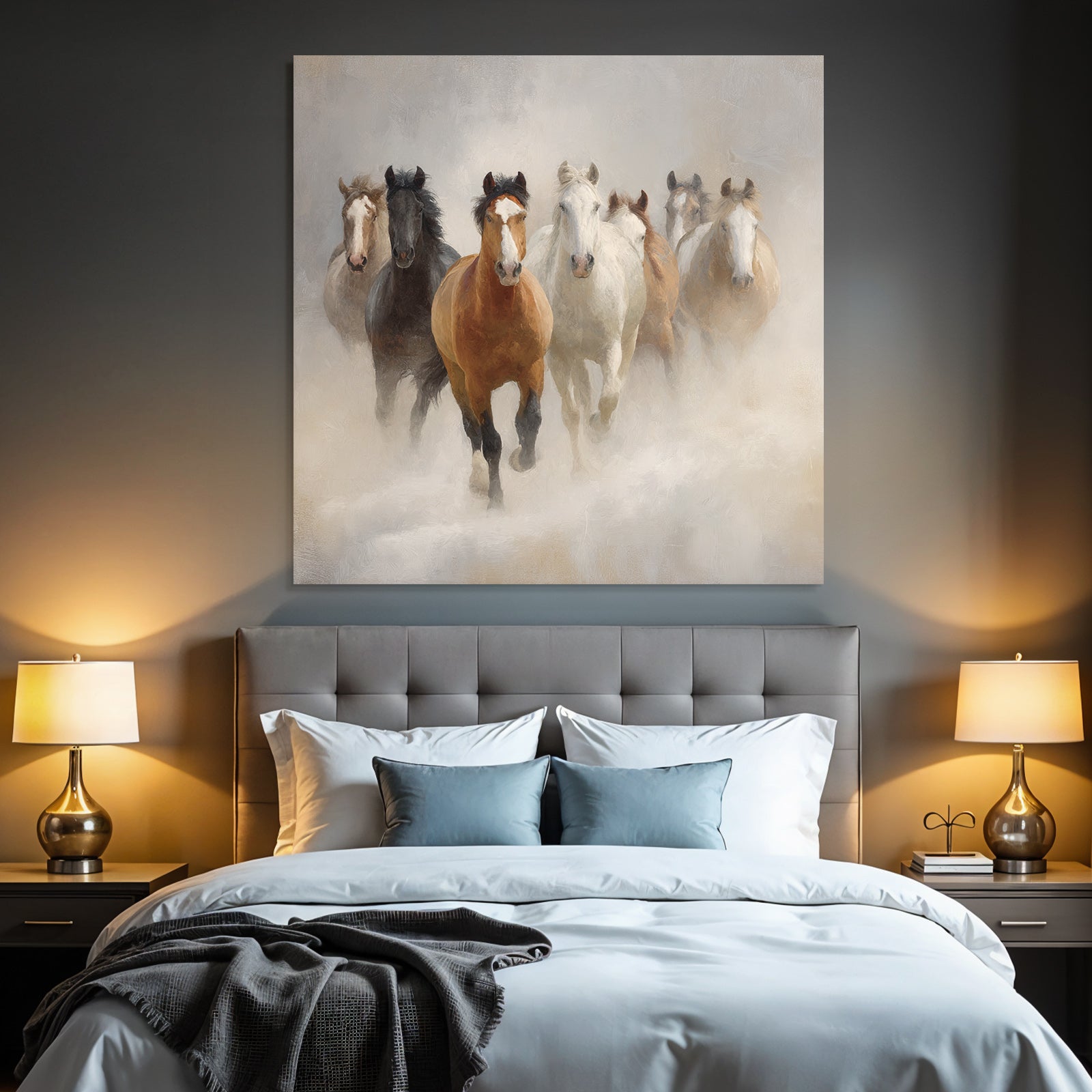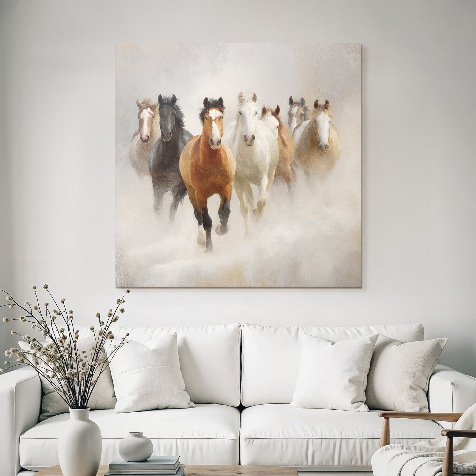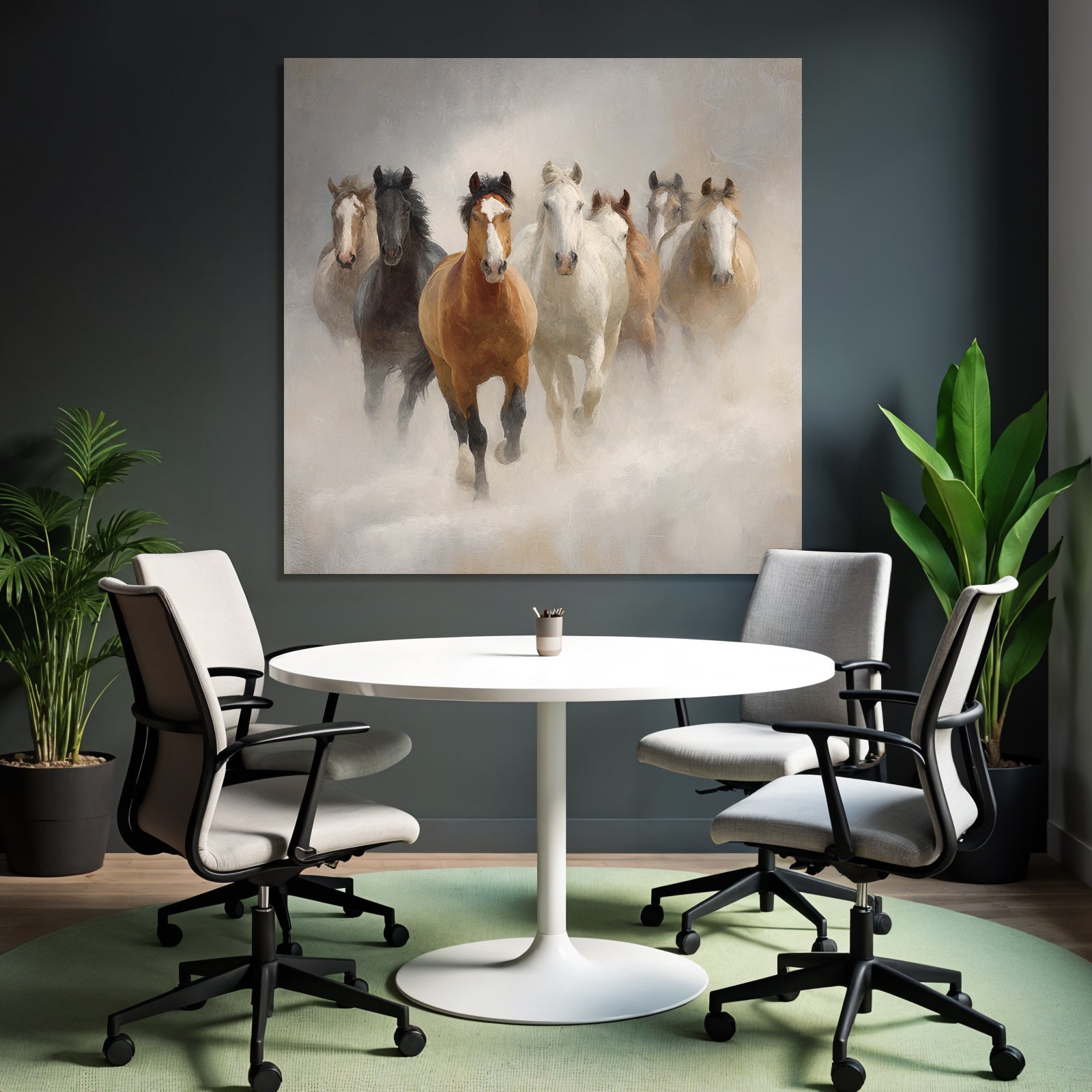 Ein Highlight für Wohnzimmer, Studio oder Empfangsbereich: „„Sechs Pferde Im Nebel““ bringt den Stil Grandeur Chic auf Stoff – gespannt im edlen FameFrame.