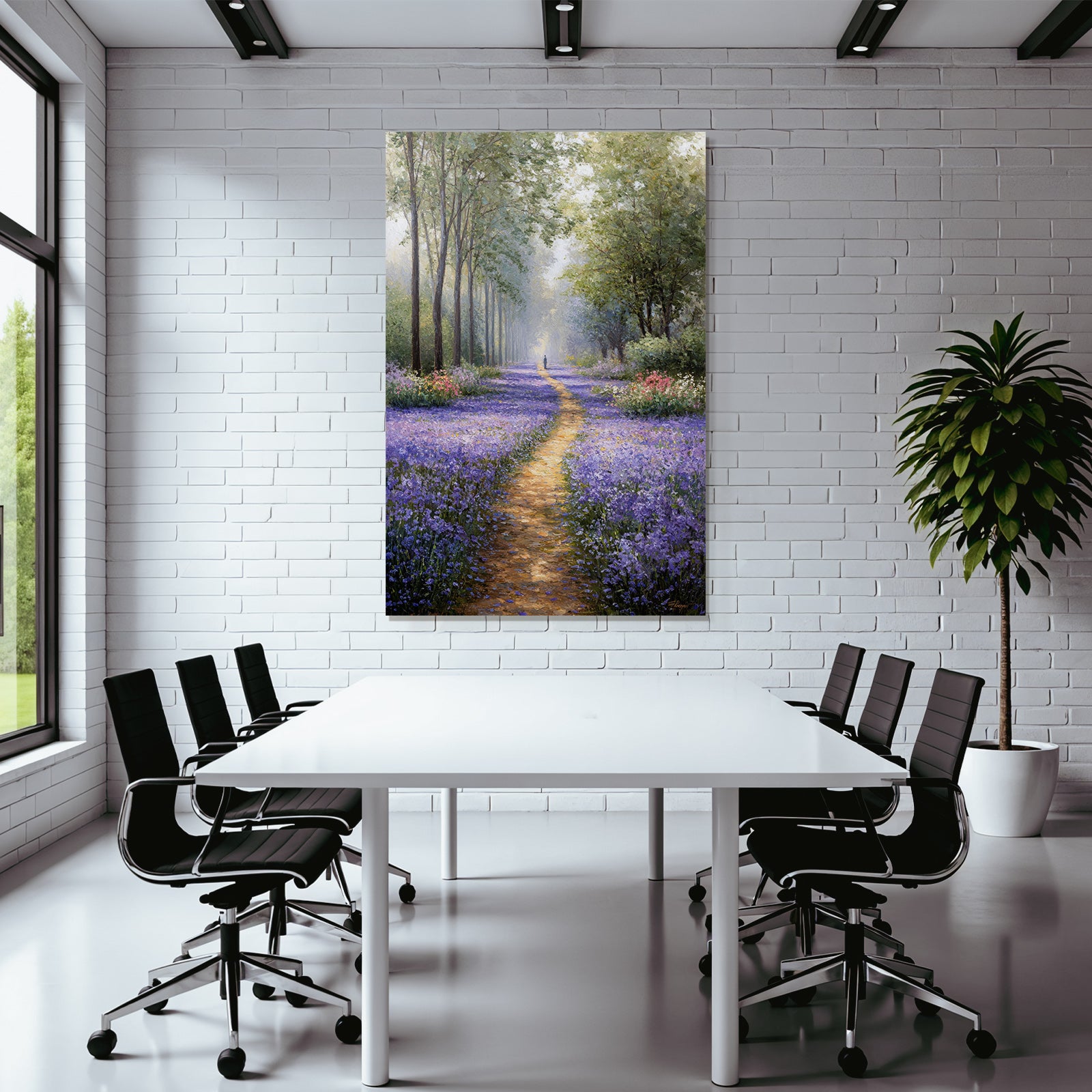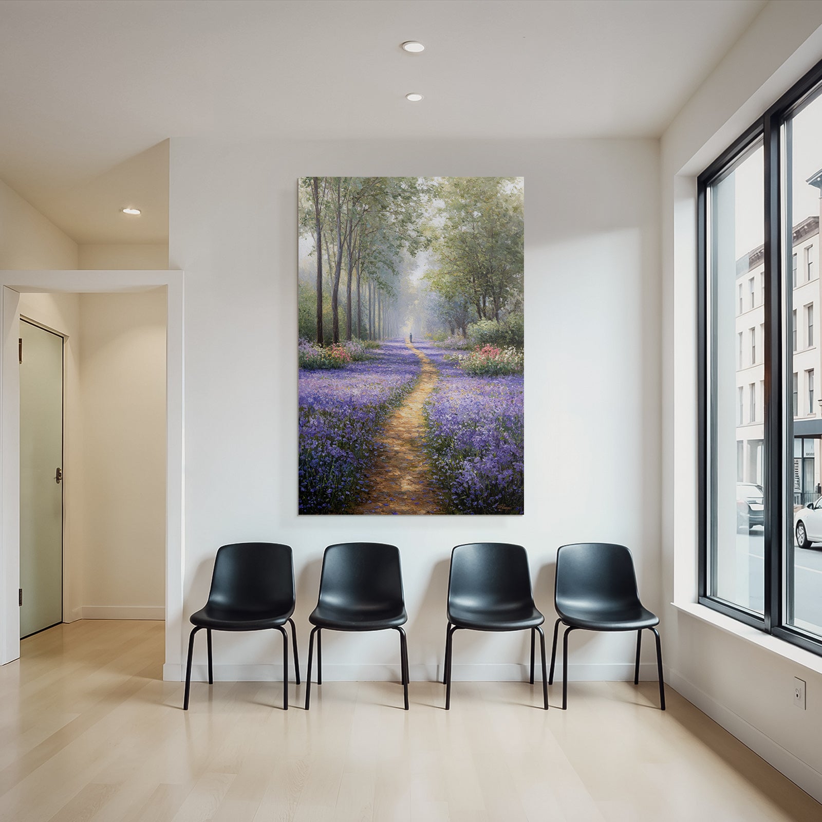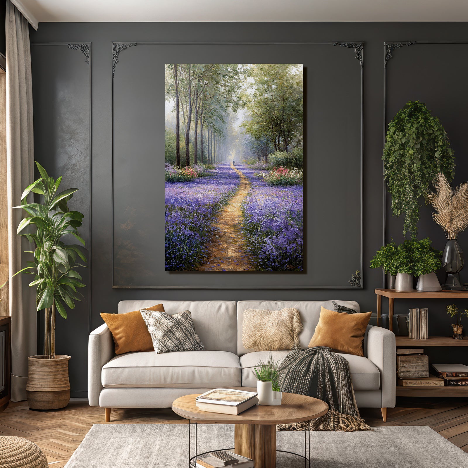 Verleihe Lobby, Wartezimmer oder Studio eine besondere Atmosphäre mit „Serener Weg Durch Lila Blumenwiese“ im Stil Impressionismus – eindrucksvoll im FameFrame™ präsentiert.
