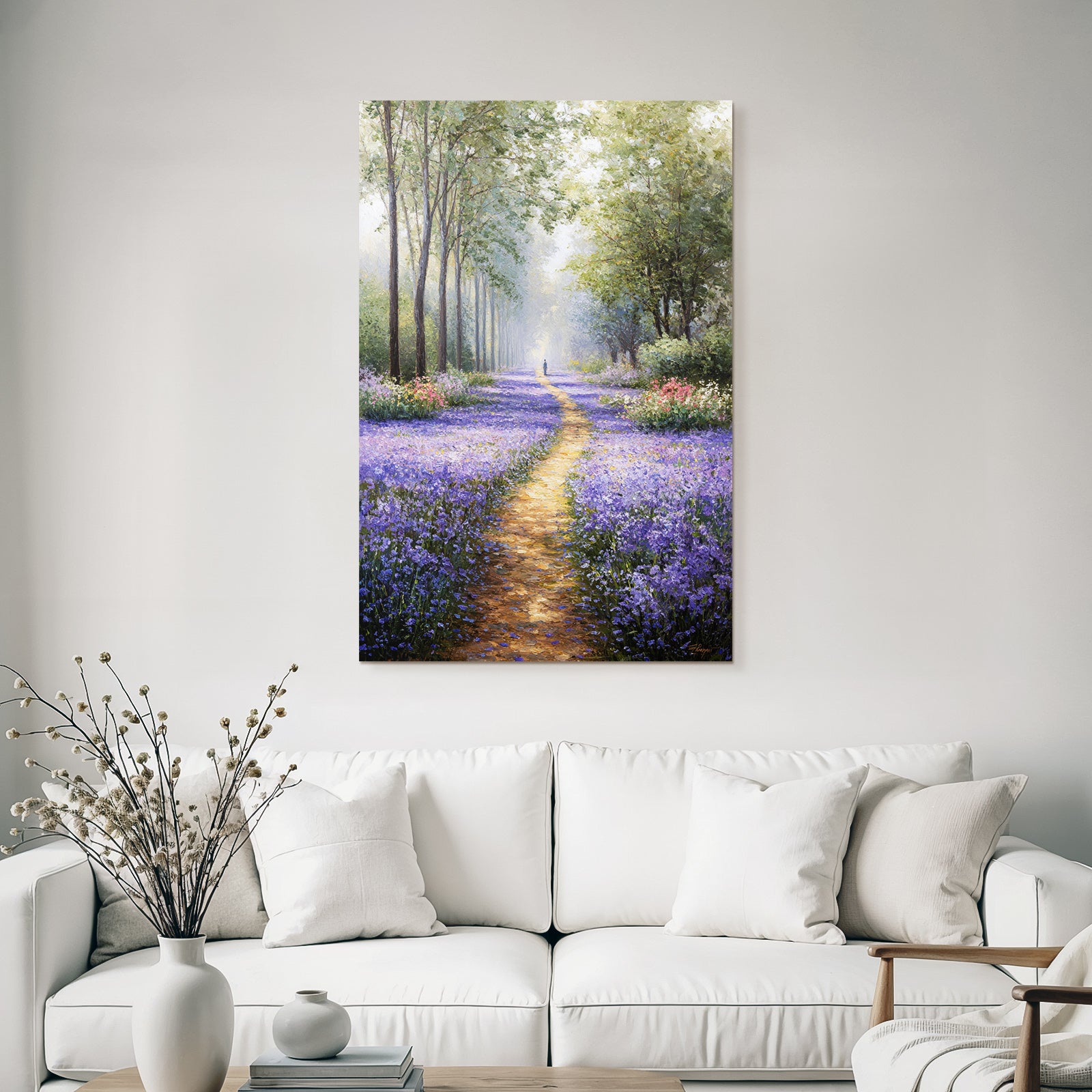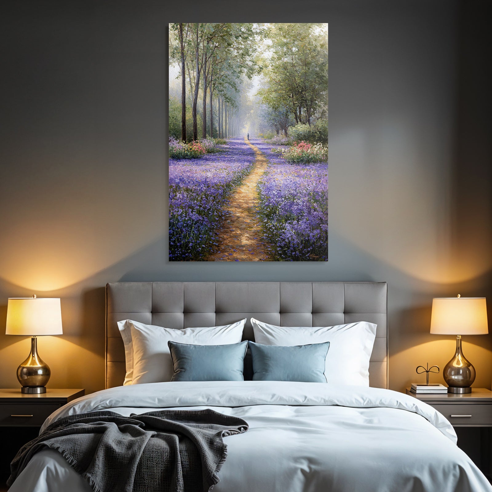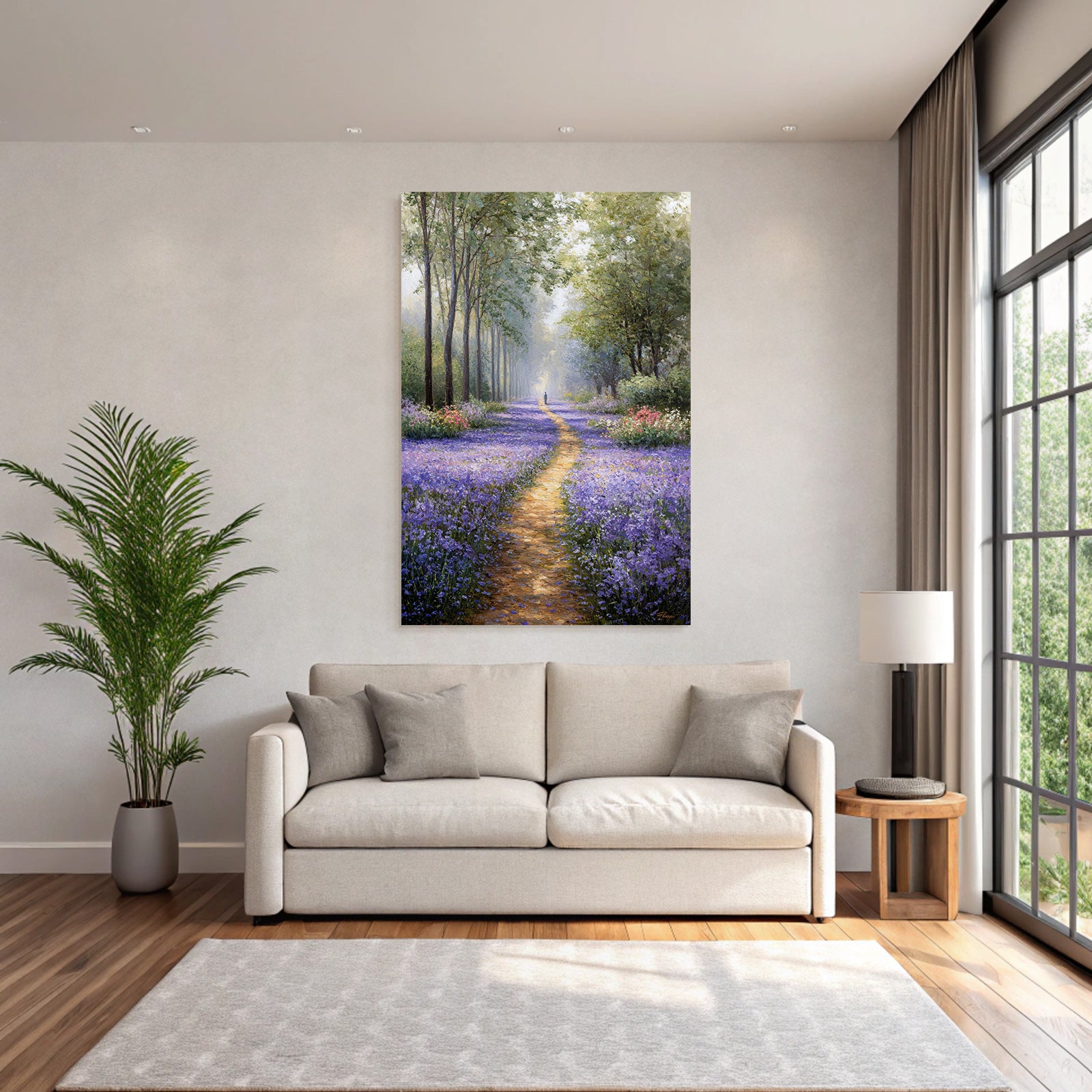 Verleihe Lobby, Wartezimmer oder Studio eine besondere Atmosphäre mit „Serener Weg Durch Lila Blumenwiese“ im Stil Impressionismus – eindrucksvoll im FameFrame™ präsentiert.