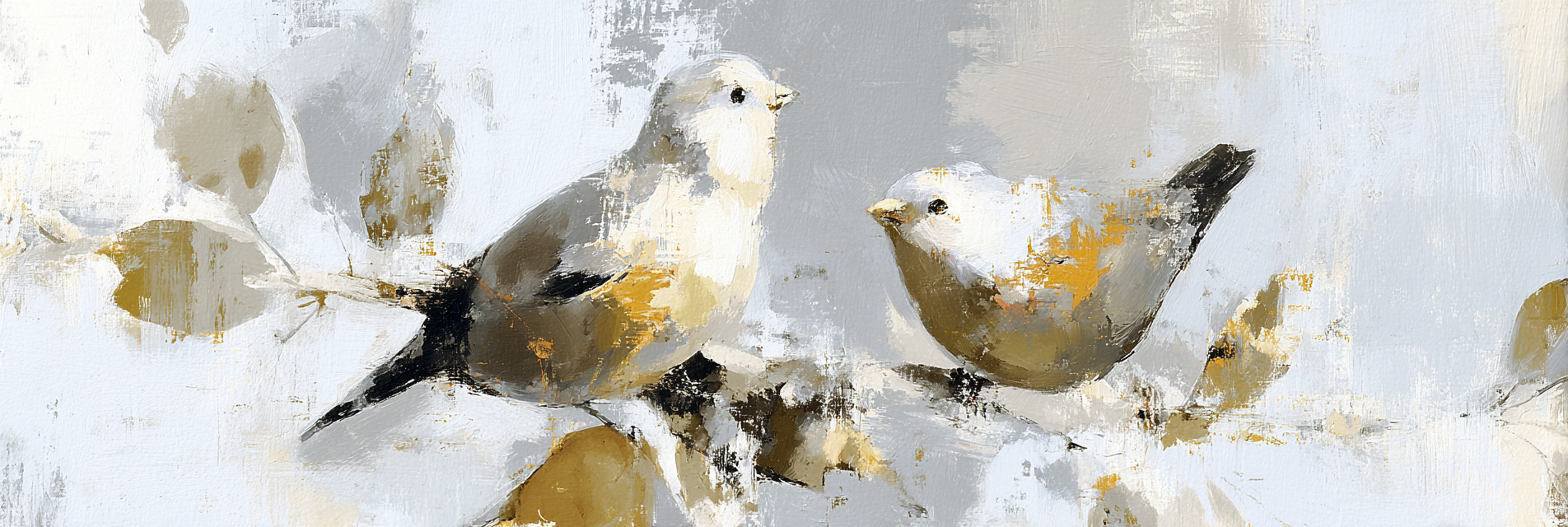 Ein Highlight für Wohnzimmer, Studio oder Empfangsbereich: „„Skandenavisch Kreative Vogeldepesion““ bringt den Stil Skandinavisch auf Stoff – gespannt im edlen FameFrame.