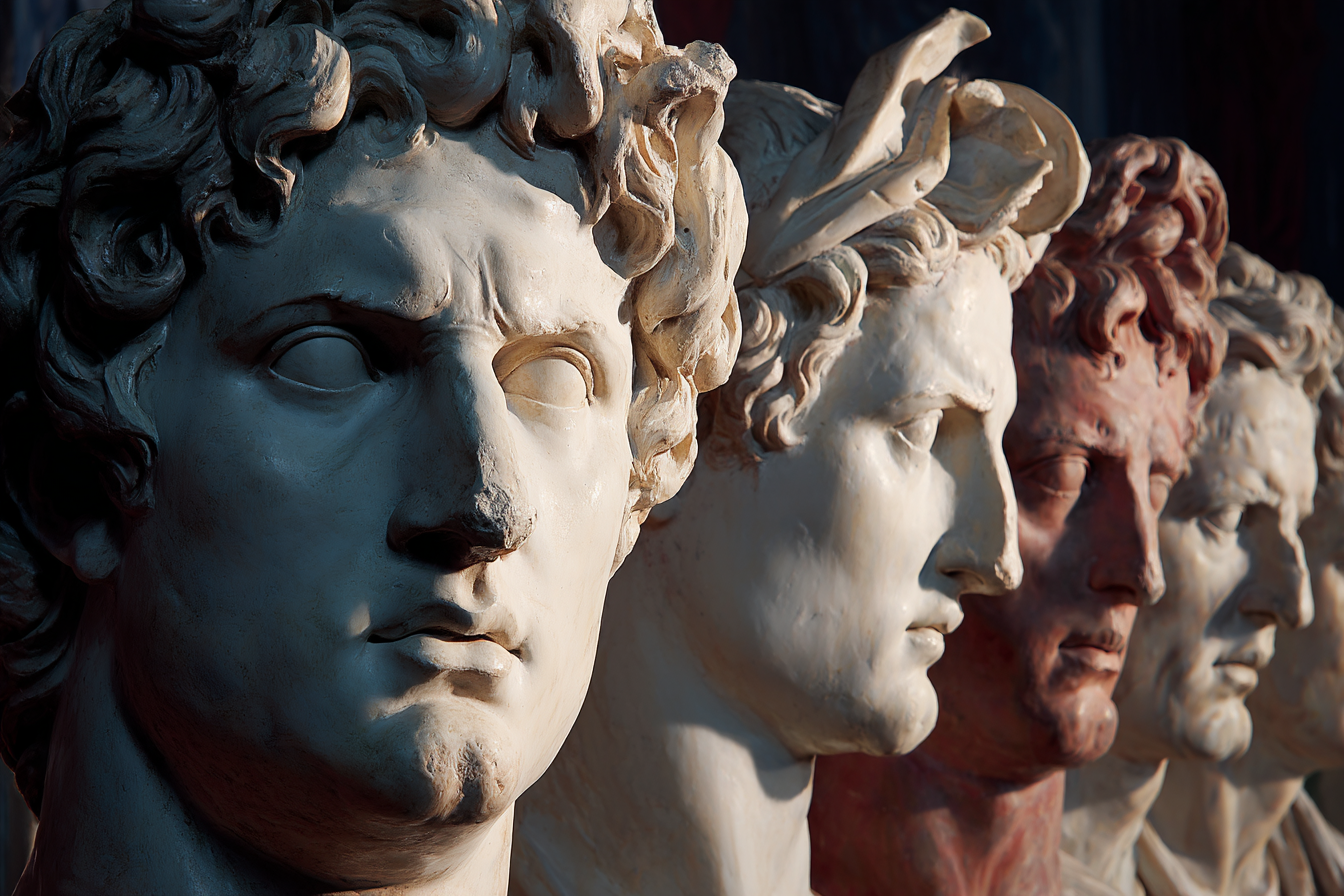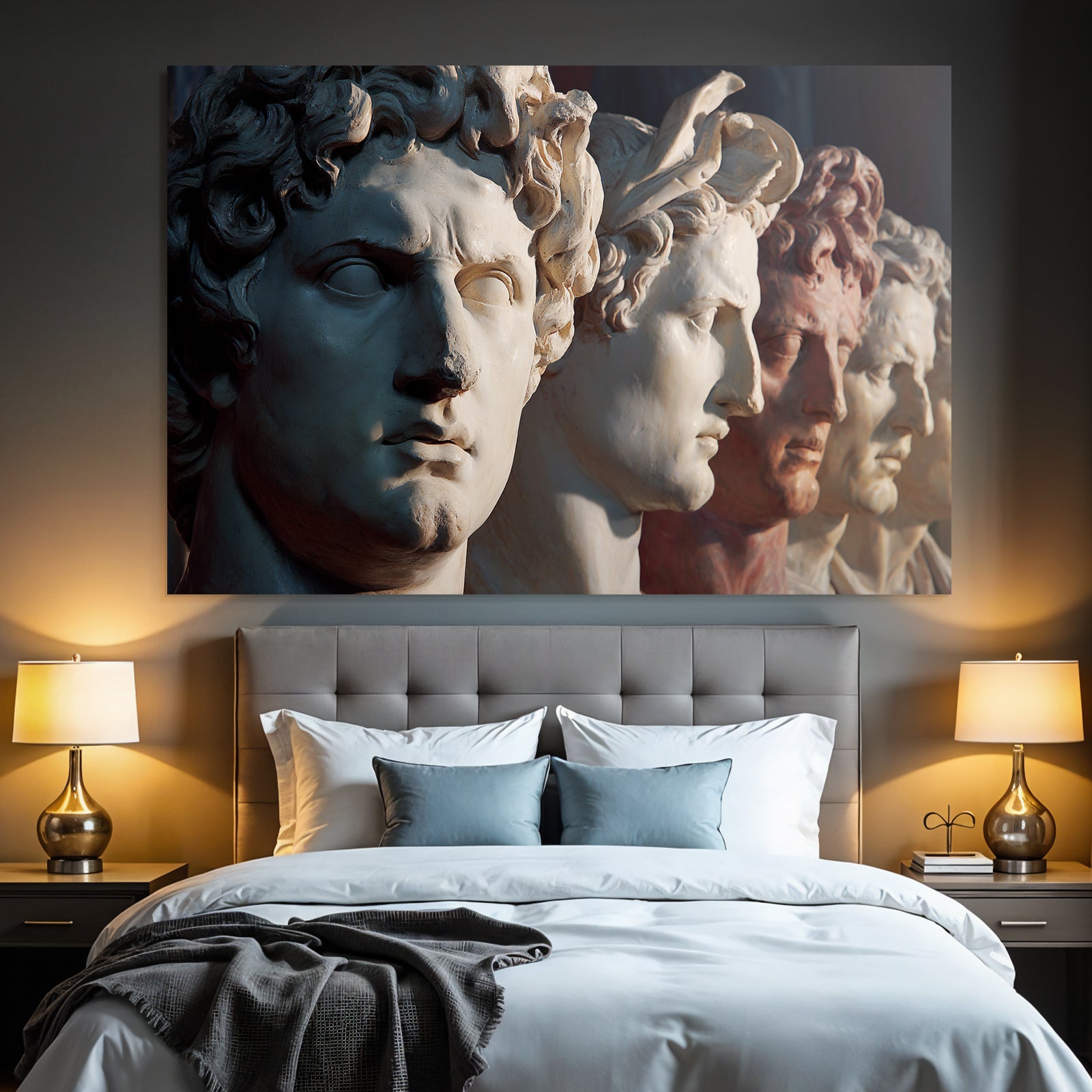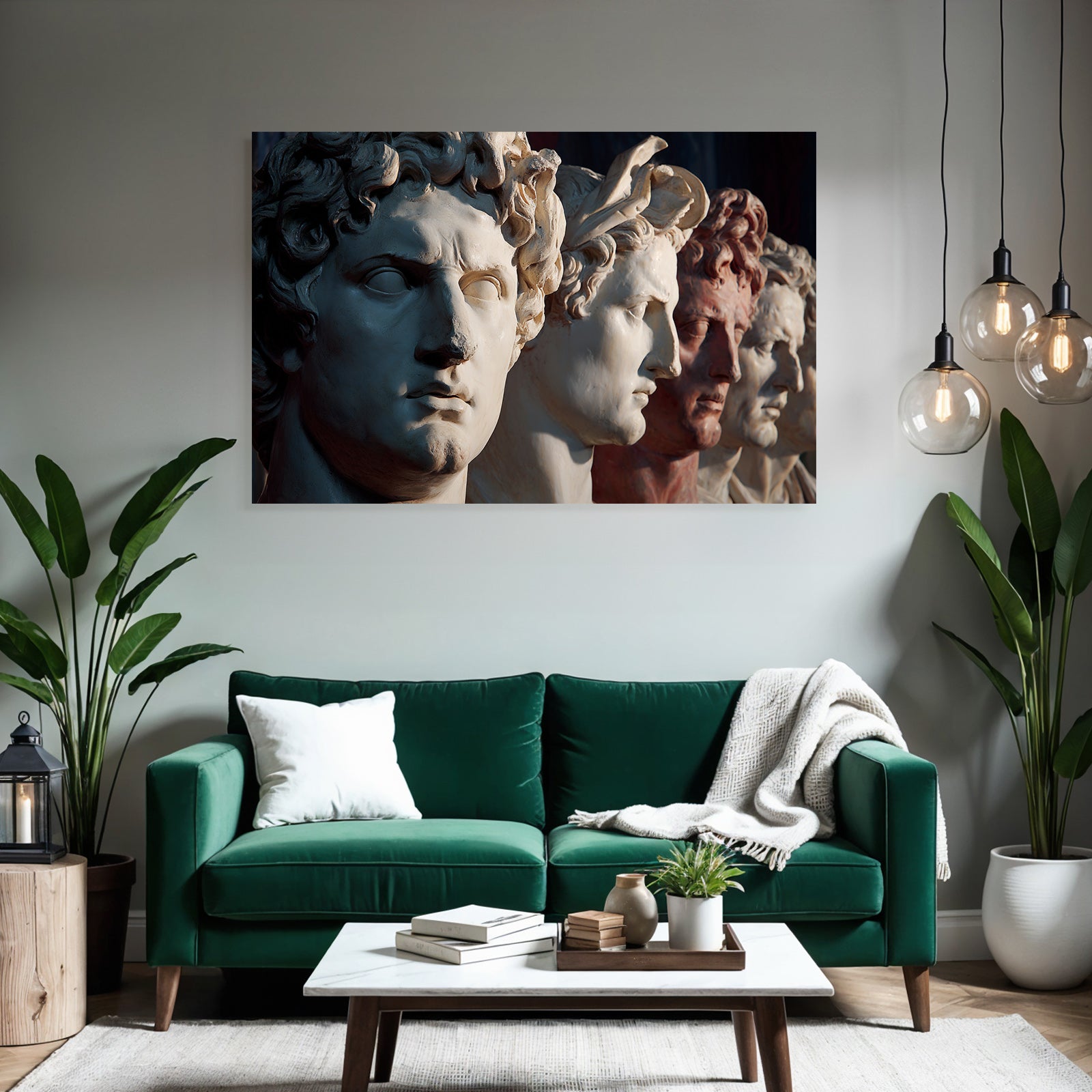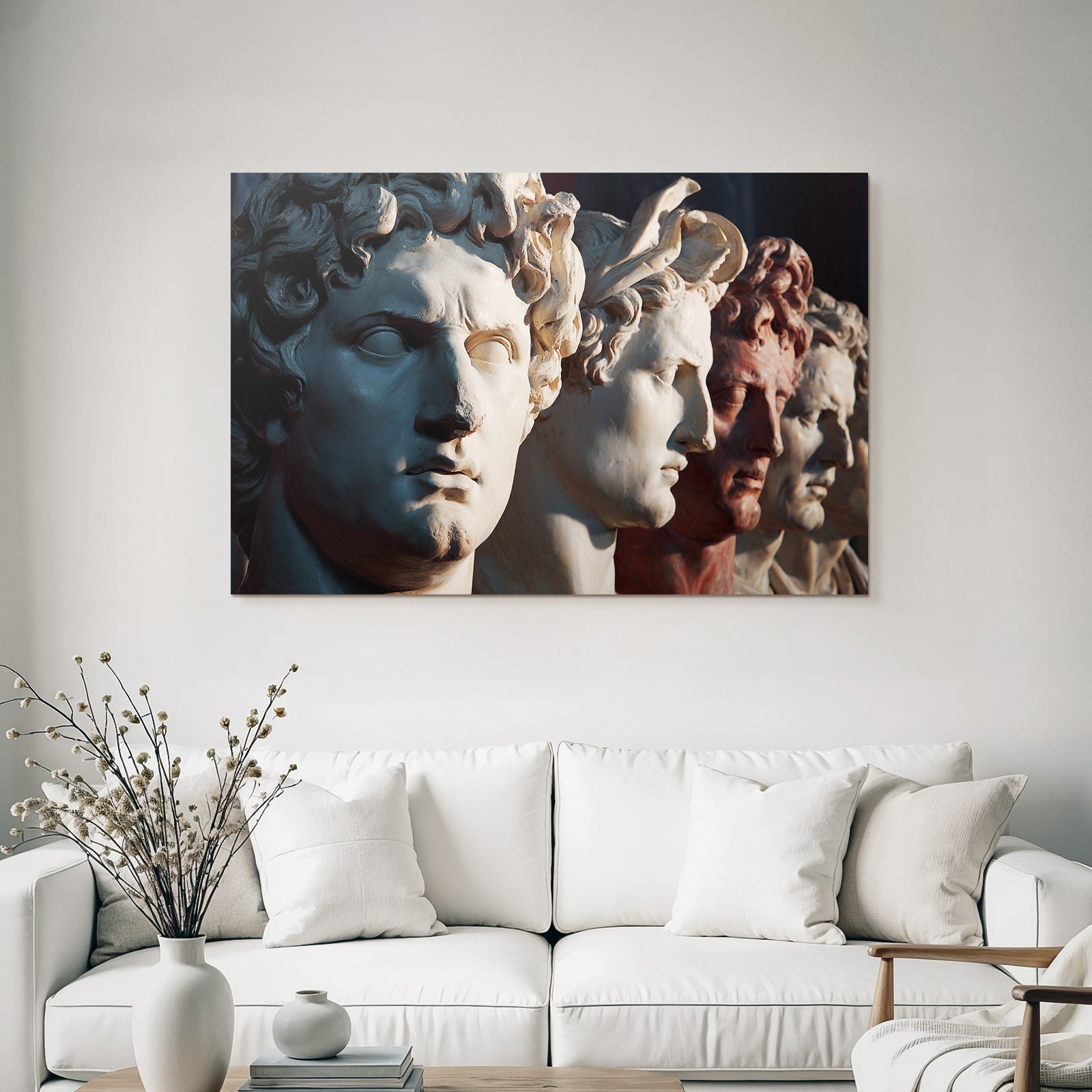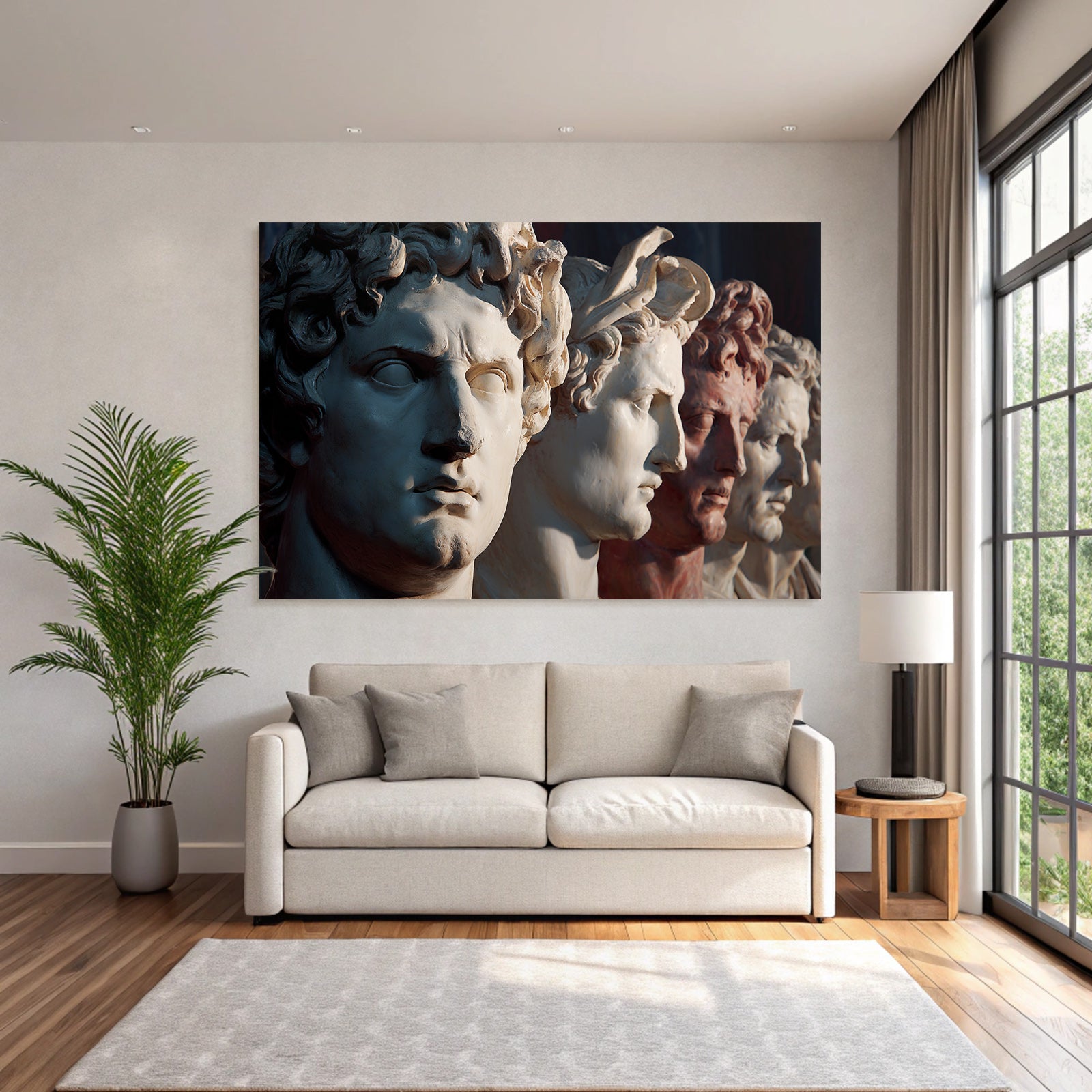 Mach mehr aus Deinem Wohnbereich oder Besprechungszimmer – „„Skulptierte Kopf Gestalten Antike Kunst““ im Stil Klassisch überzeugt als eleganter Textildruck im FameFrame.