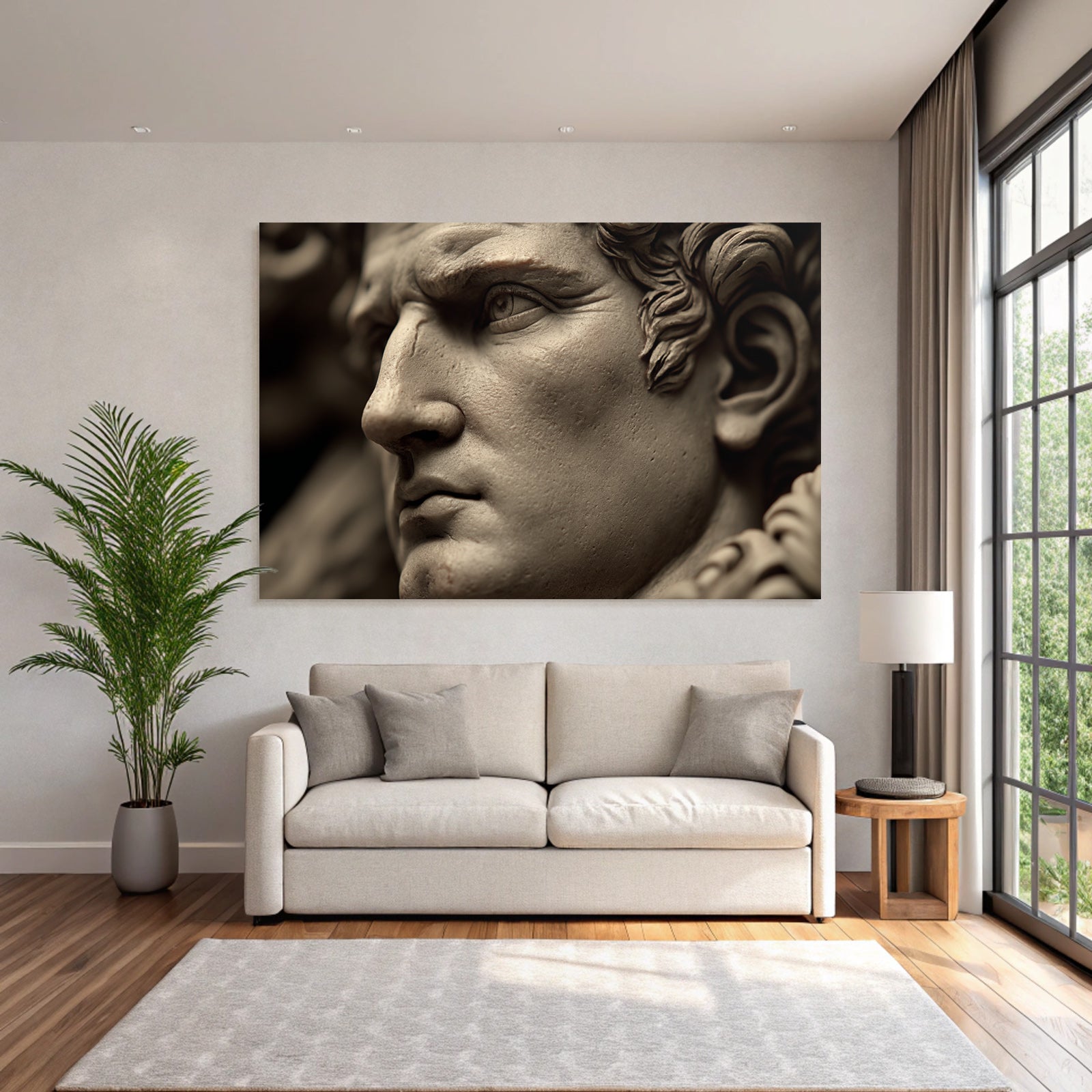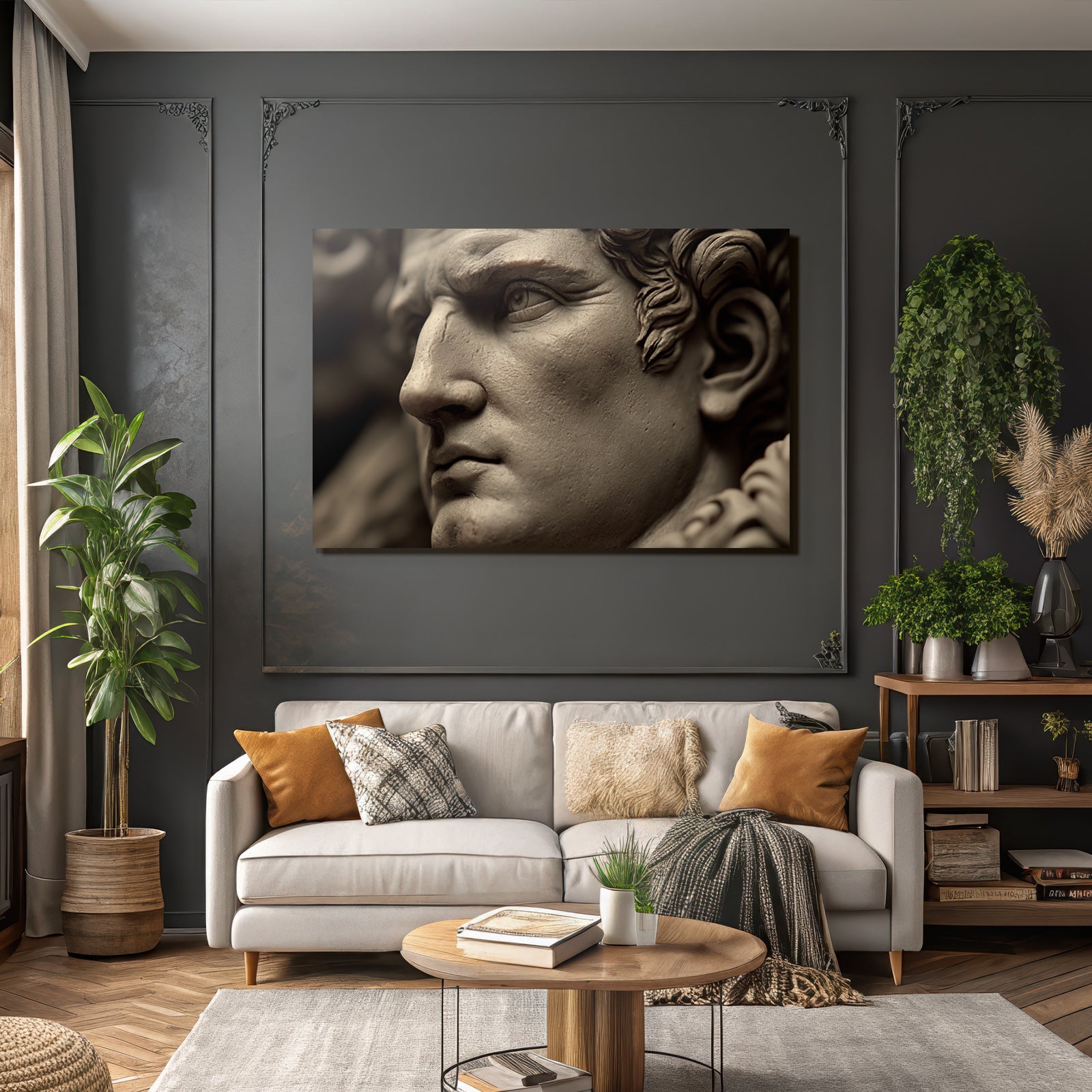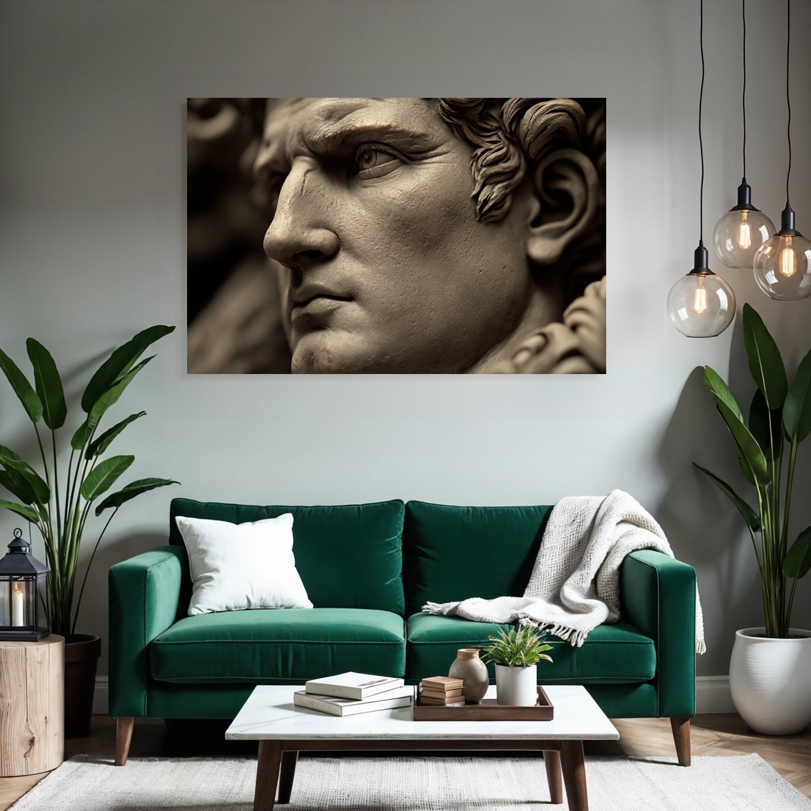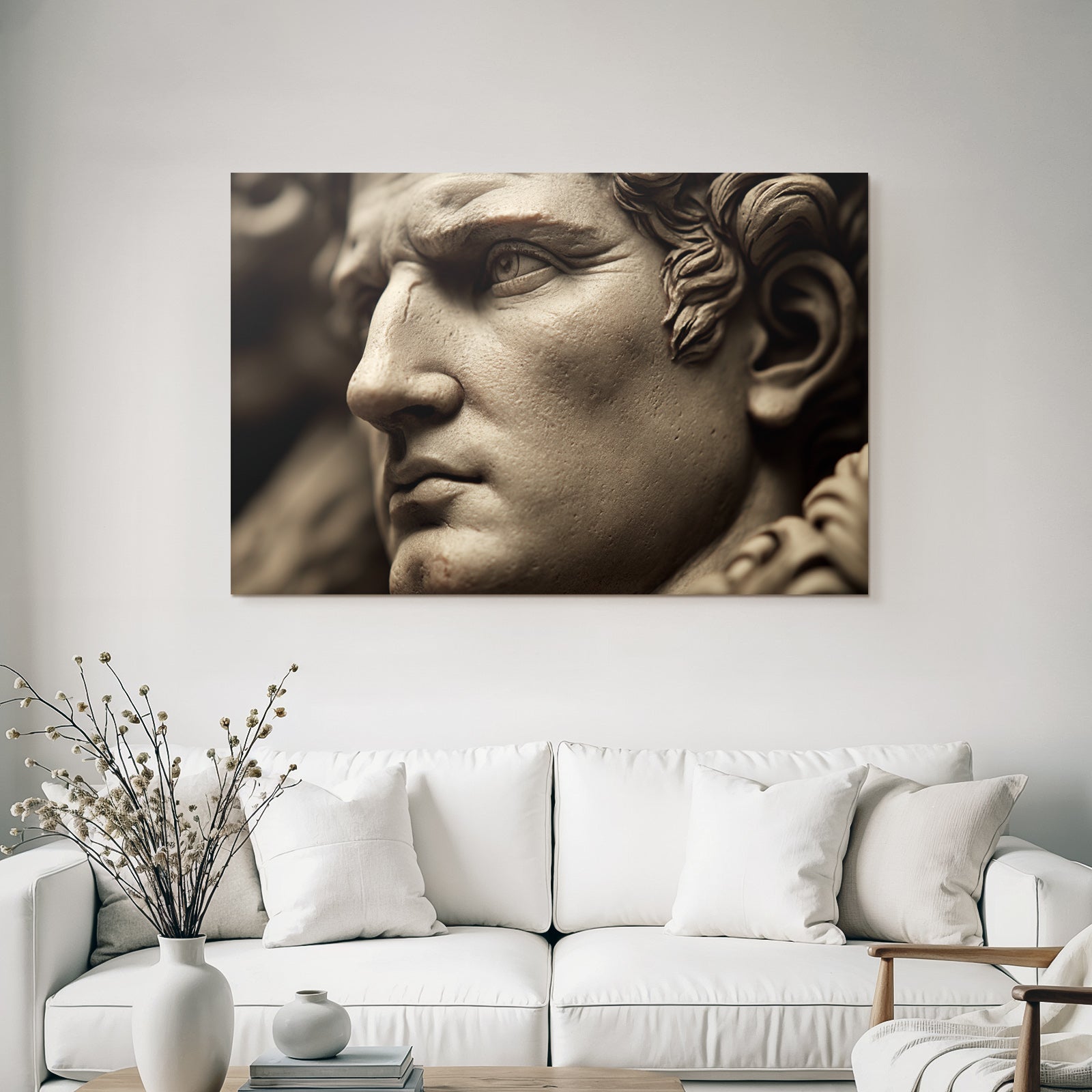 Verschönere Dein Zuhause mit diesem Werk im Stil Klassisch. Der Titel „„Skulptiertes Gesicht Detailaufnahme““ kommt im hochwertigen FameFrame perfekt zur Geltung.