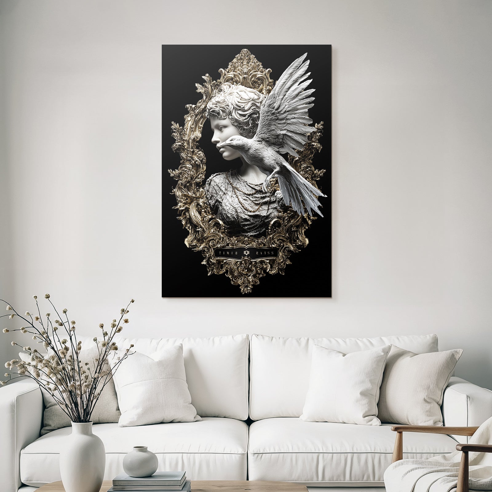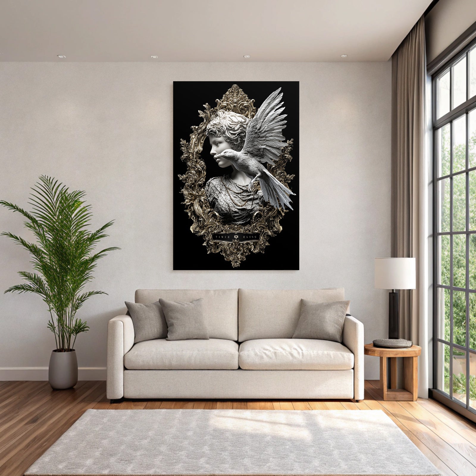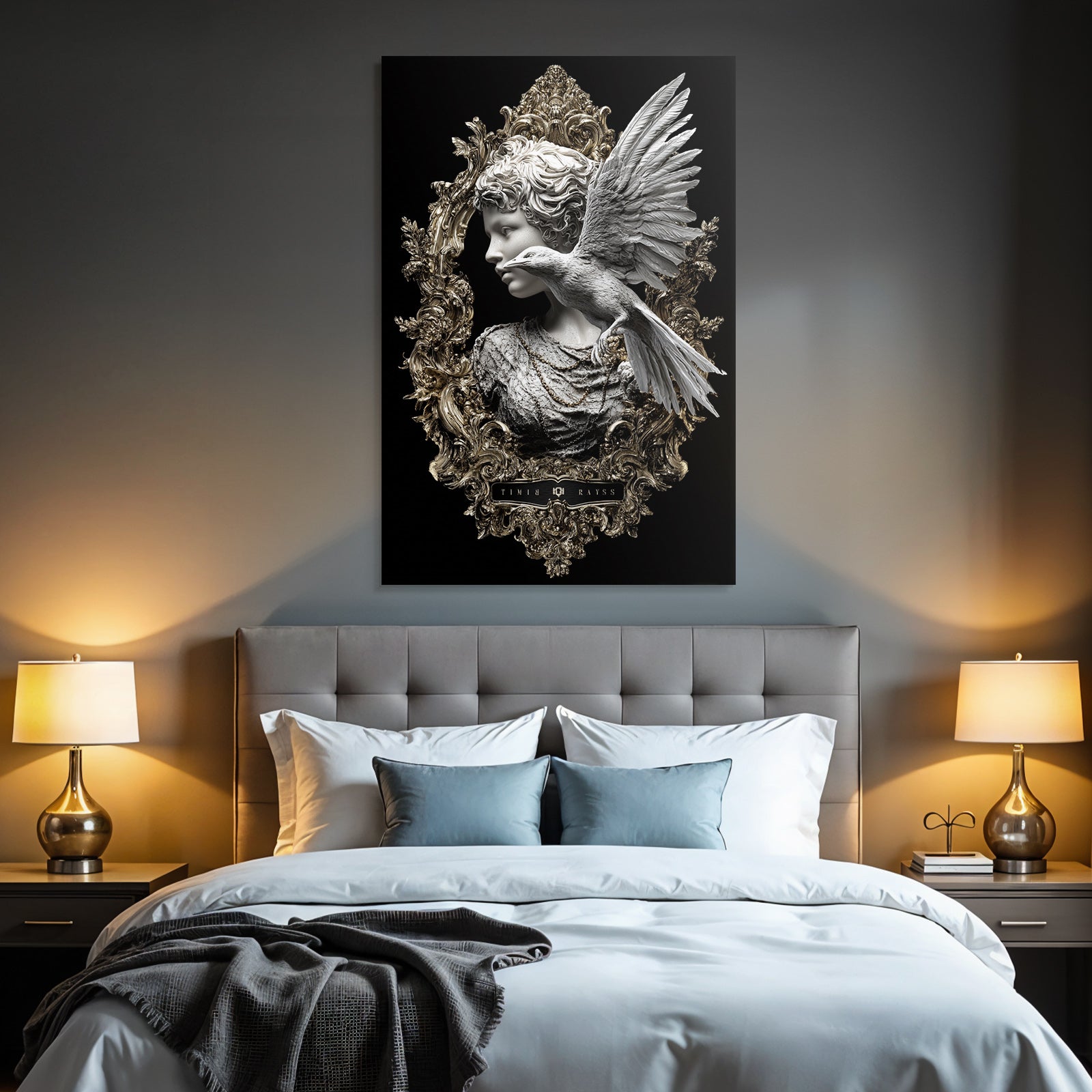 Setz ein Statement: „„Skulpturale Darstellung Mit Vogel Im Goldrahmen““ im Stil Klassisch wird im FameFrame zum echten Kunstobjekt an Deiner Wand.